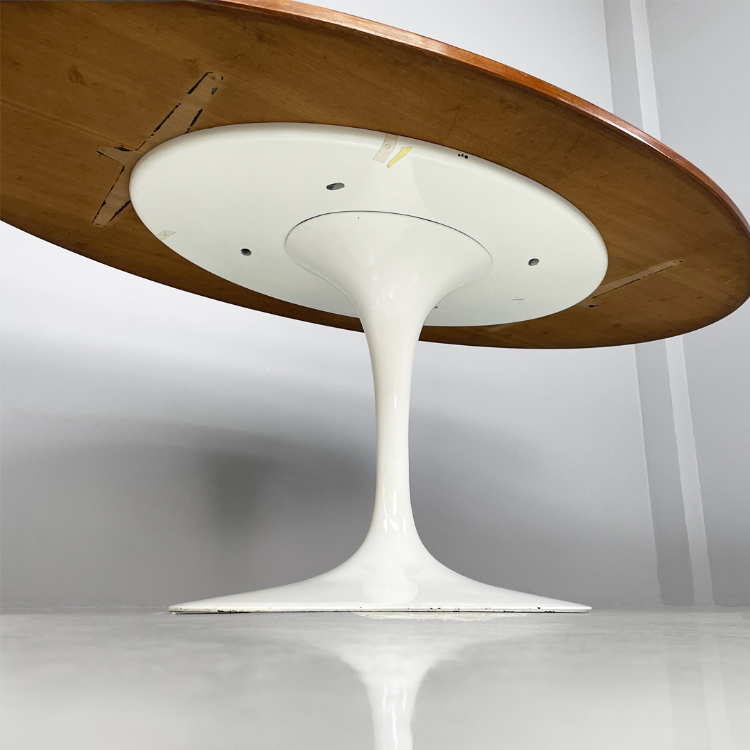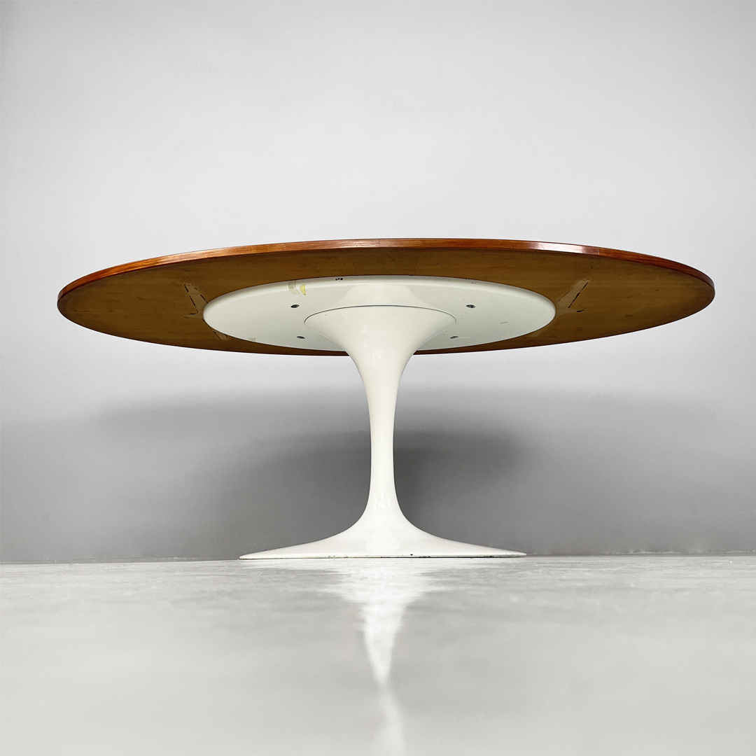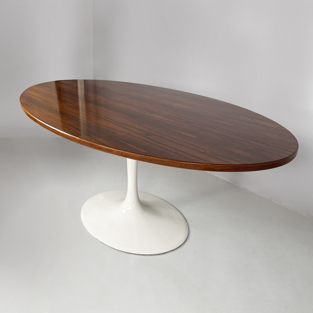 Tavolo da pranzo con piano ovale in legno. La zampa dal tavolo è a base tonda in metallo verniciato bianco.