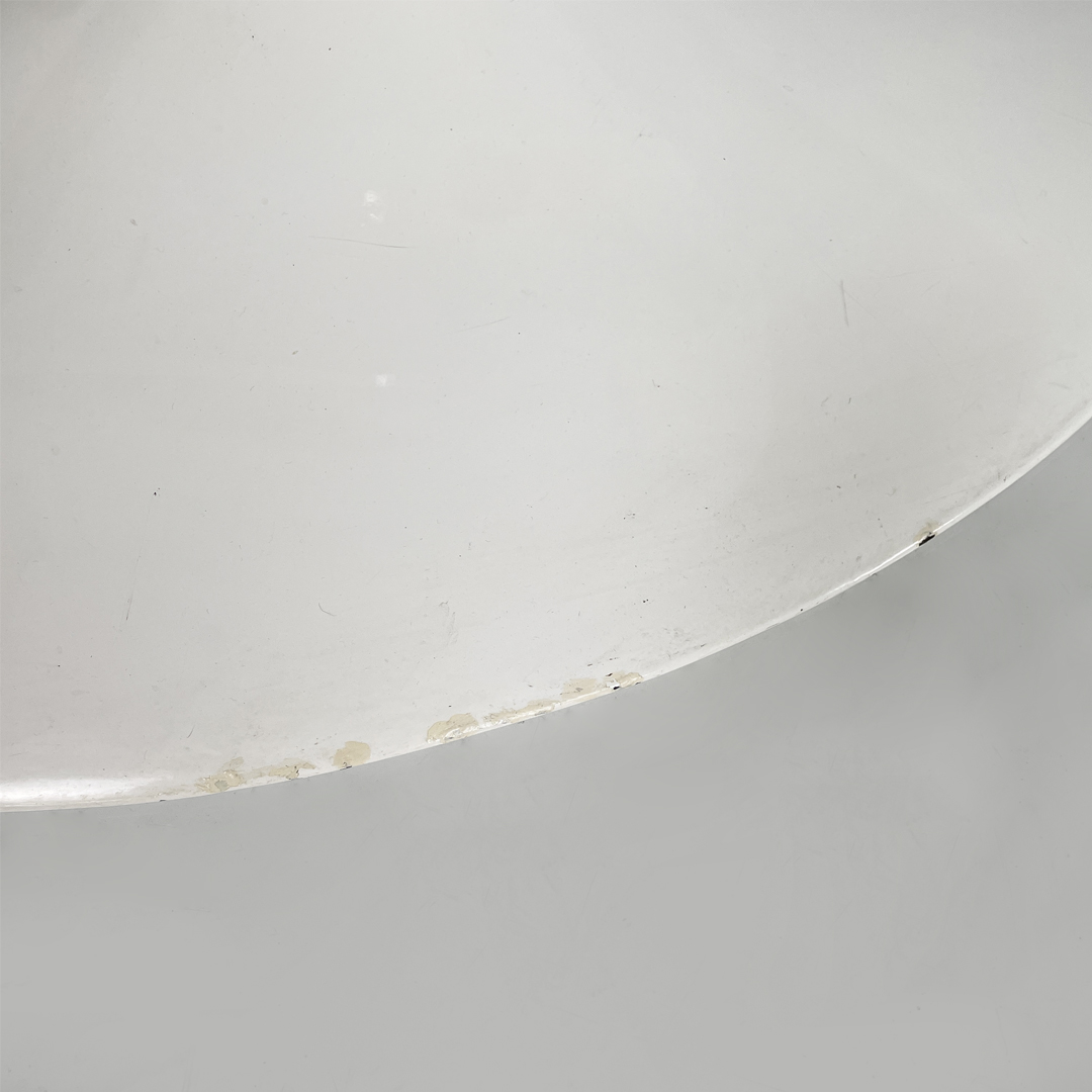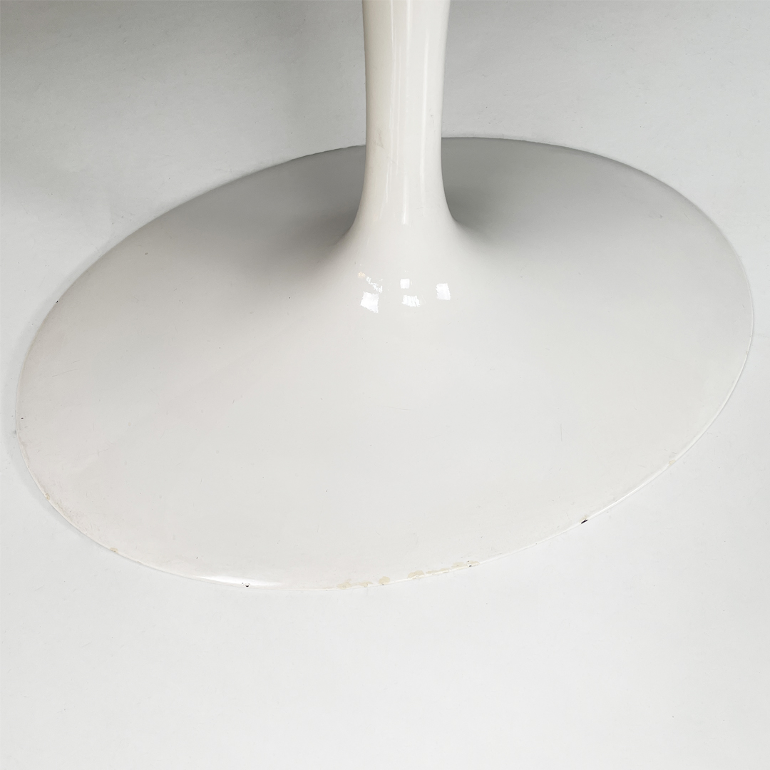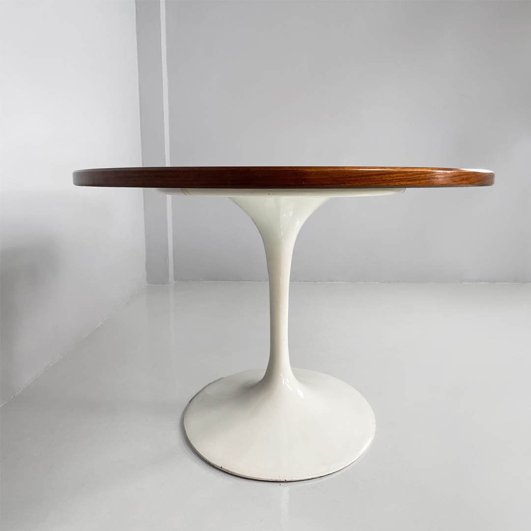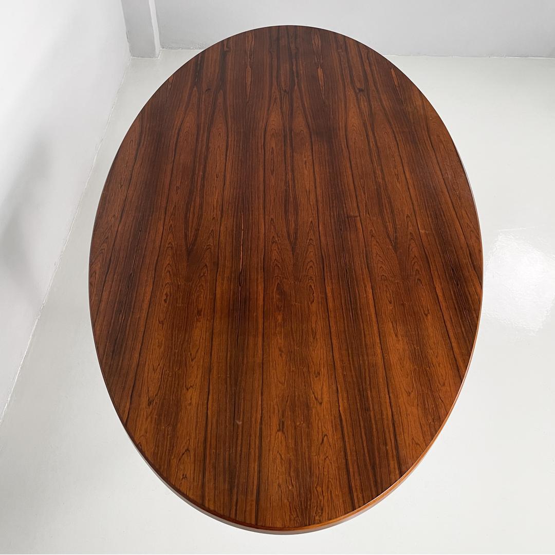 Tavolo da pranzo con piano ovale in legno. La zampa dal tavolo è a base tonda in metallo verniciato bianco.