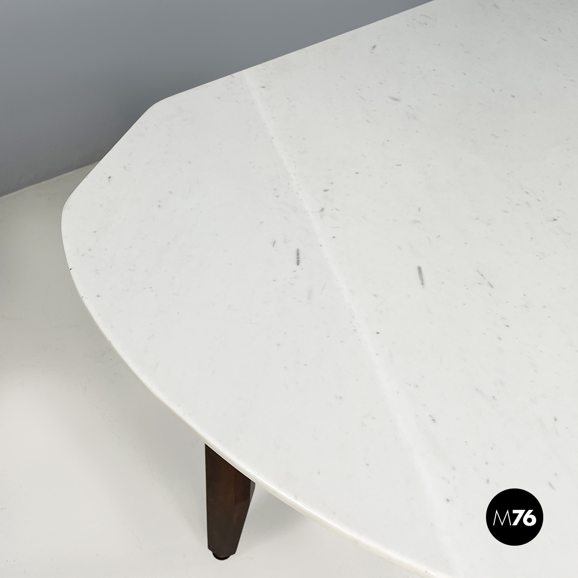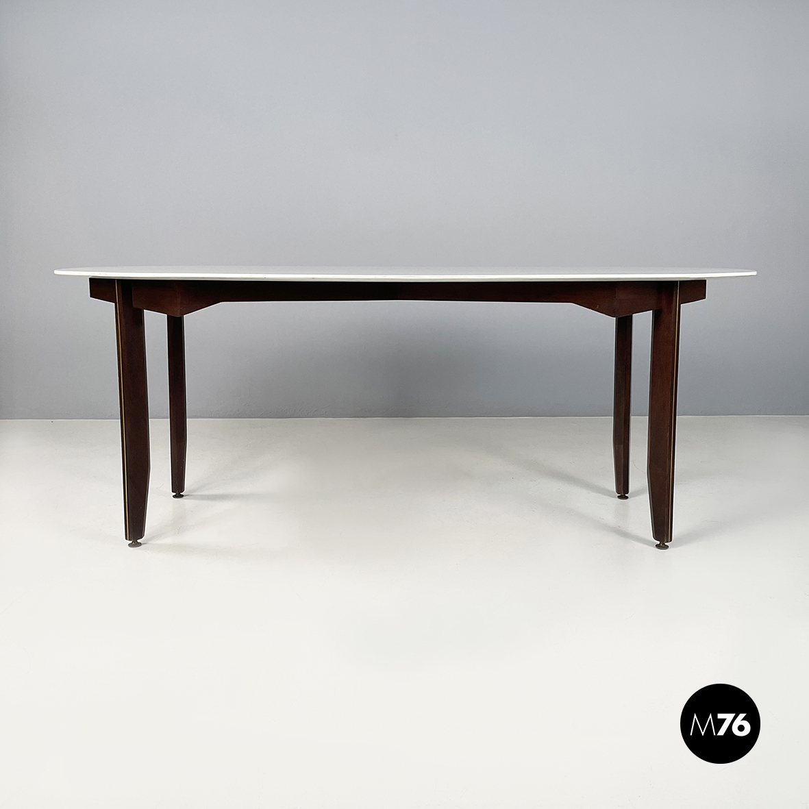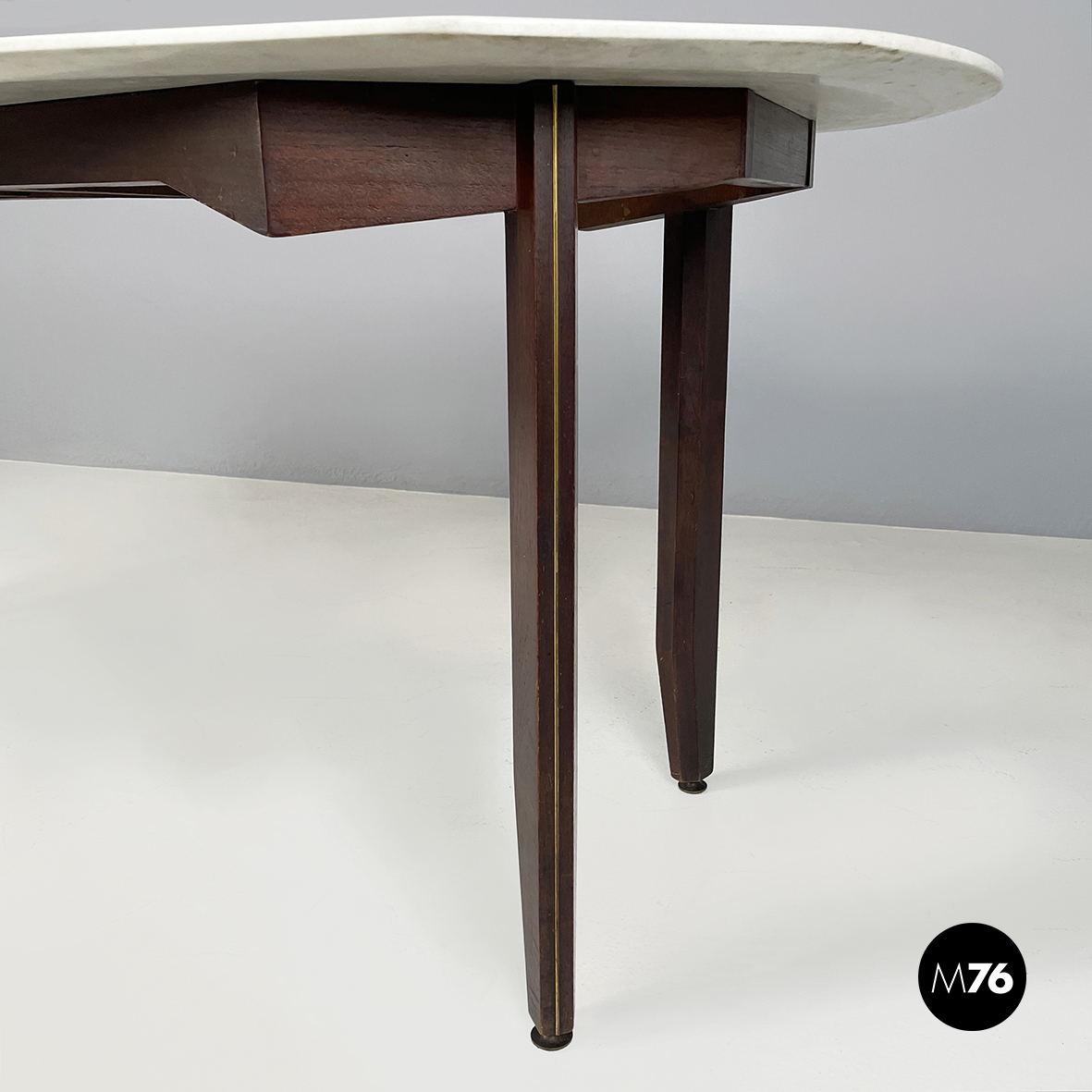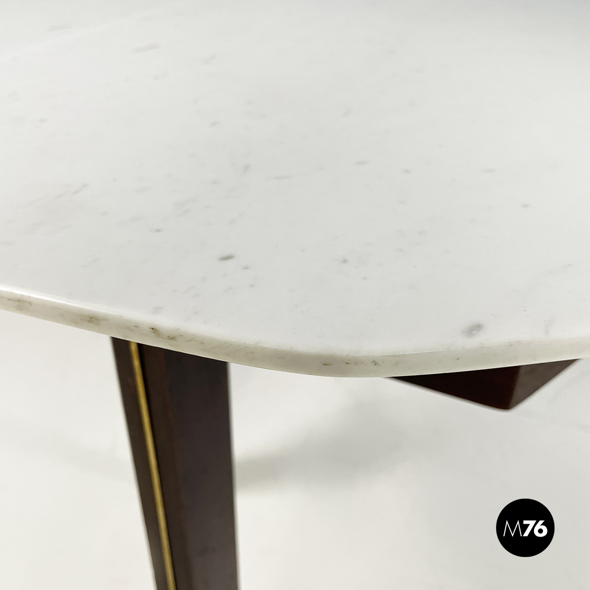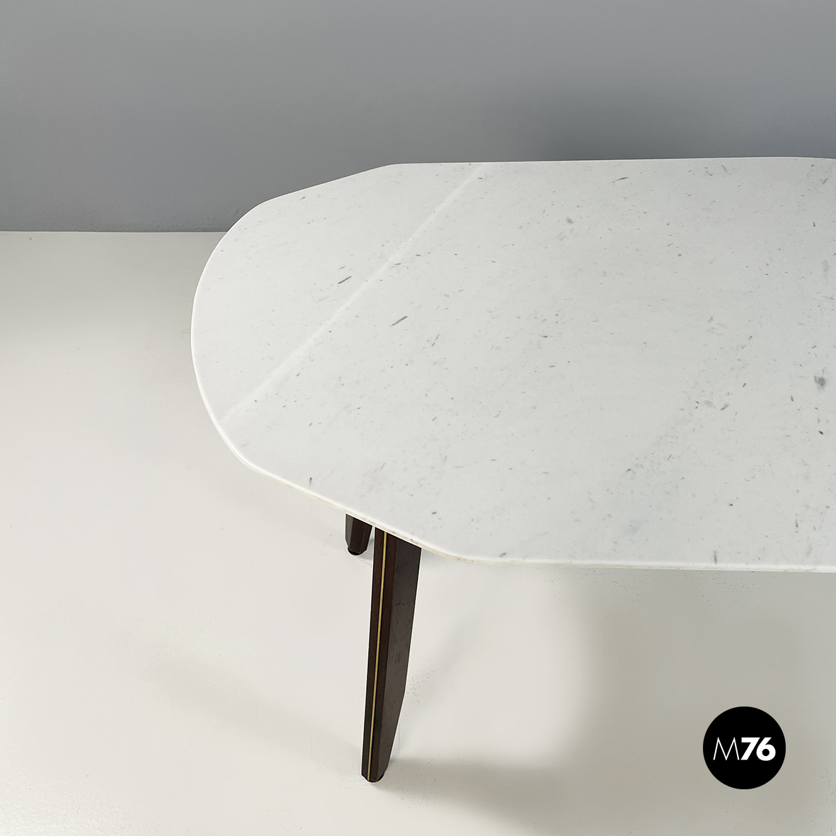 Tavolo da pranzo con piano ovale in marmo bianco di Carrara. La struttura su cui poggia il piano è a forma di otto in legno scuro. Le zampe squadrate in legno presentano un dettagli in tondino di ottone. Piedini tondi in ottone.