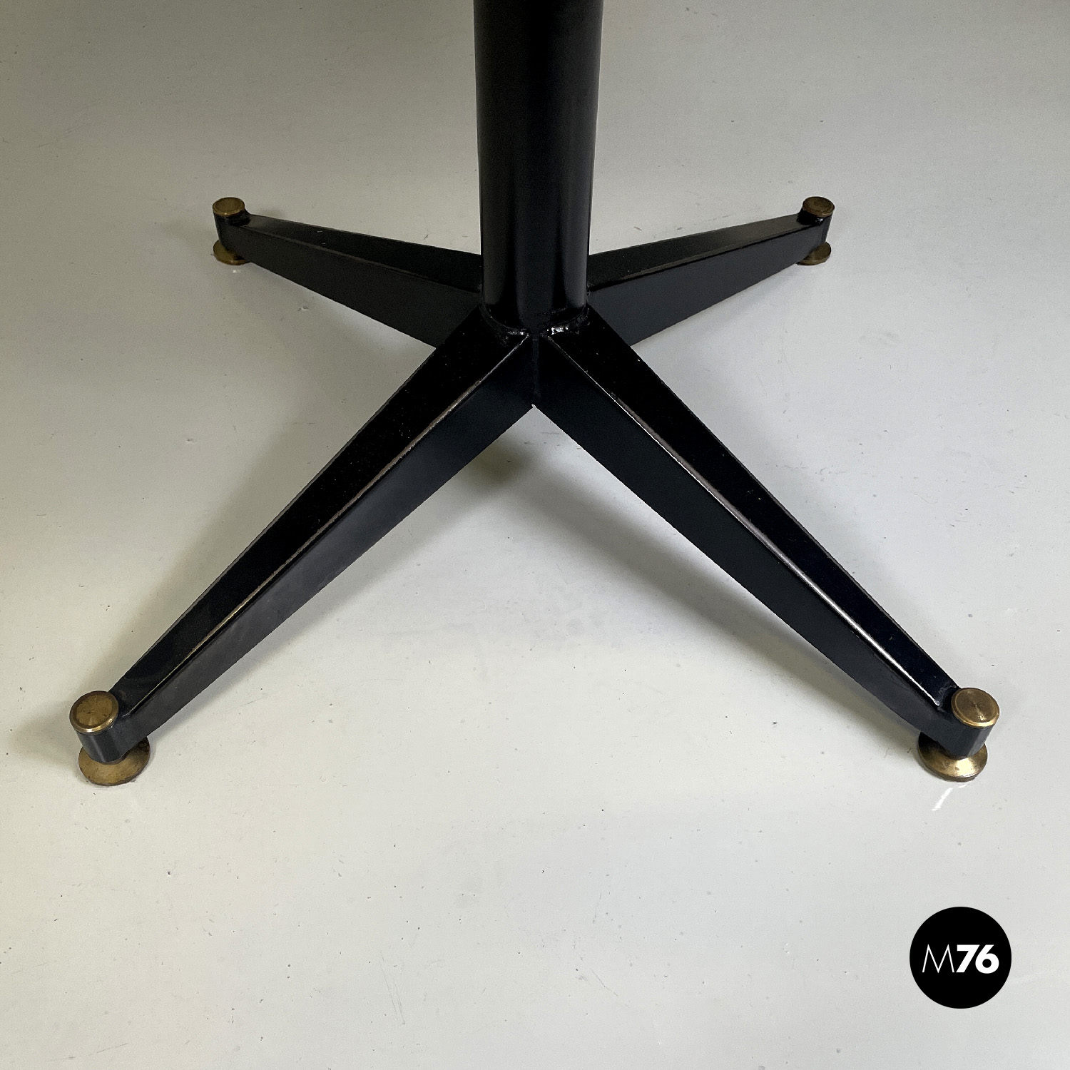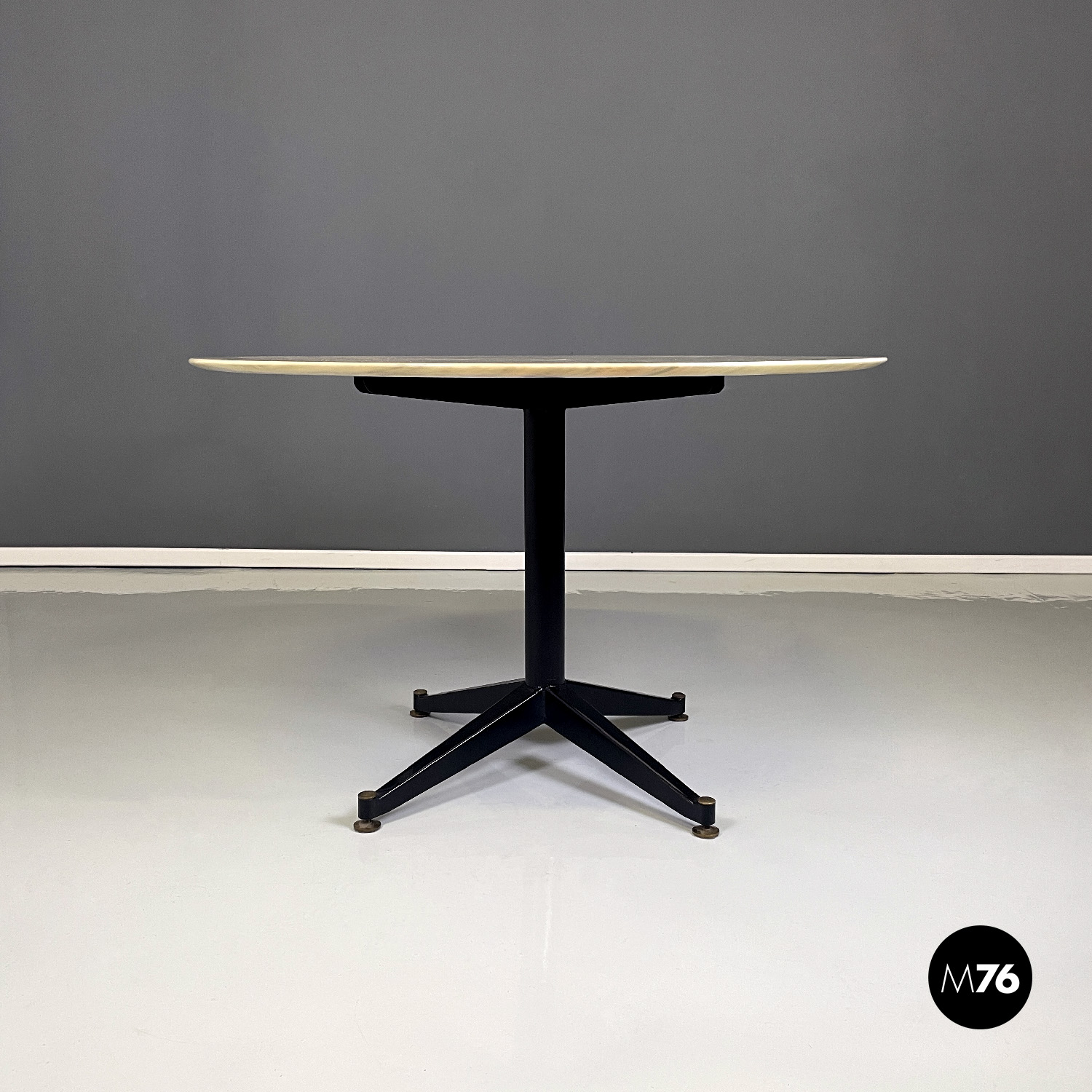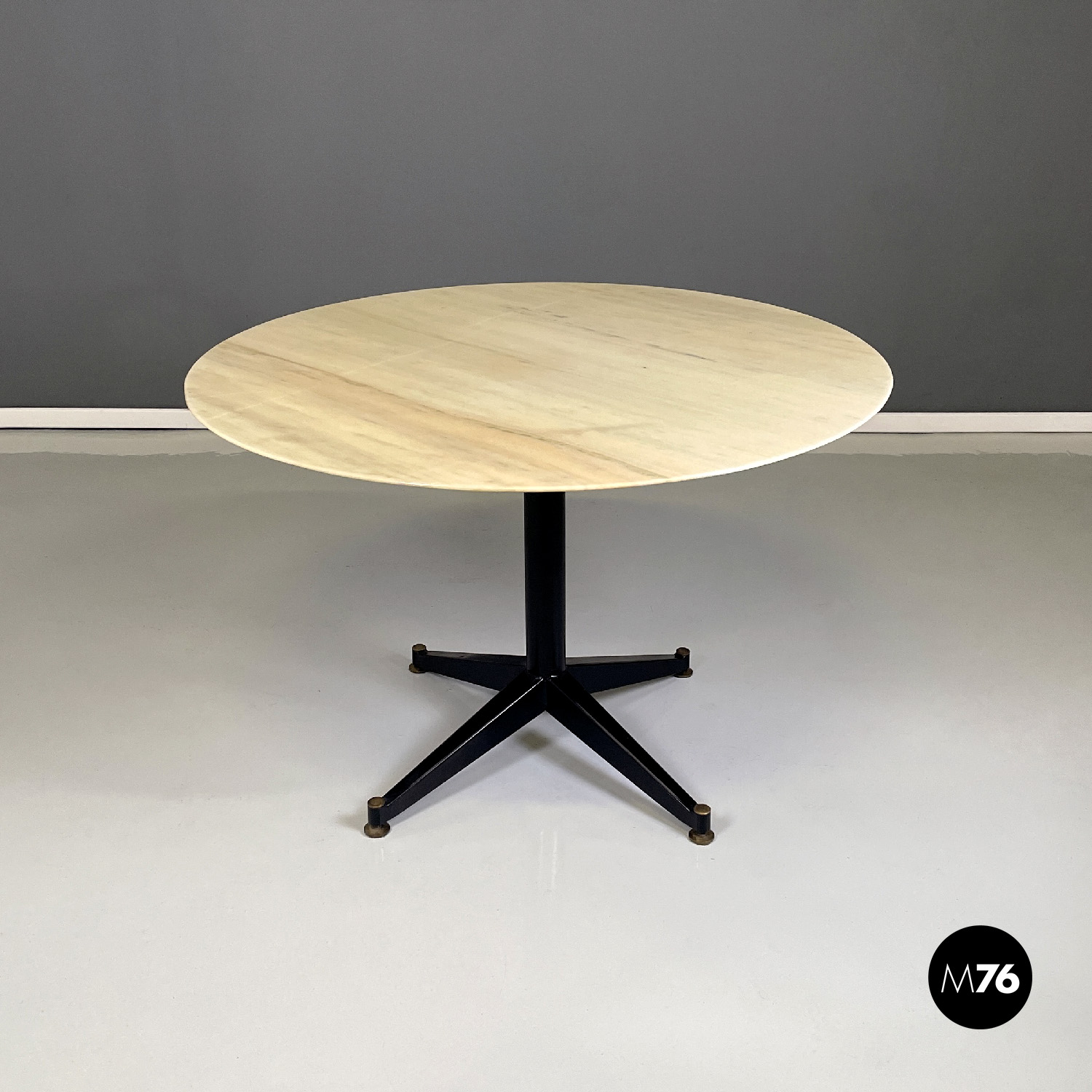 Tavolo da pranzo con piano tondo in marmo Rosa Portogallo. La struttura è in metallo verniciato nero è composta da uno stelo centrale e da quattro razze che terminano con un piedino tondo in ottone.