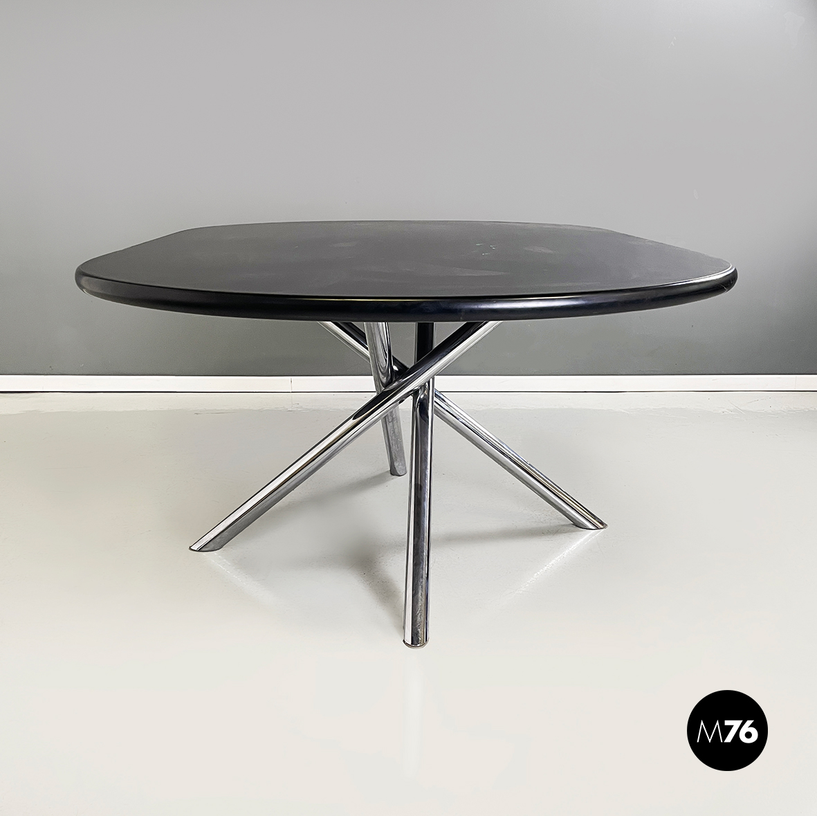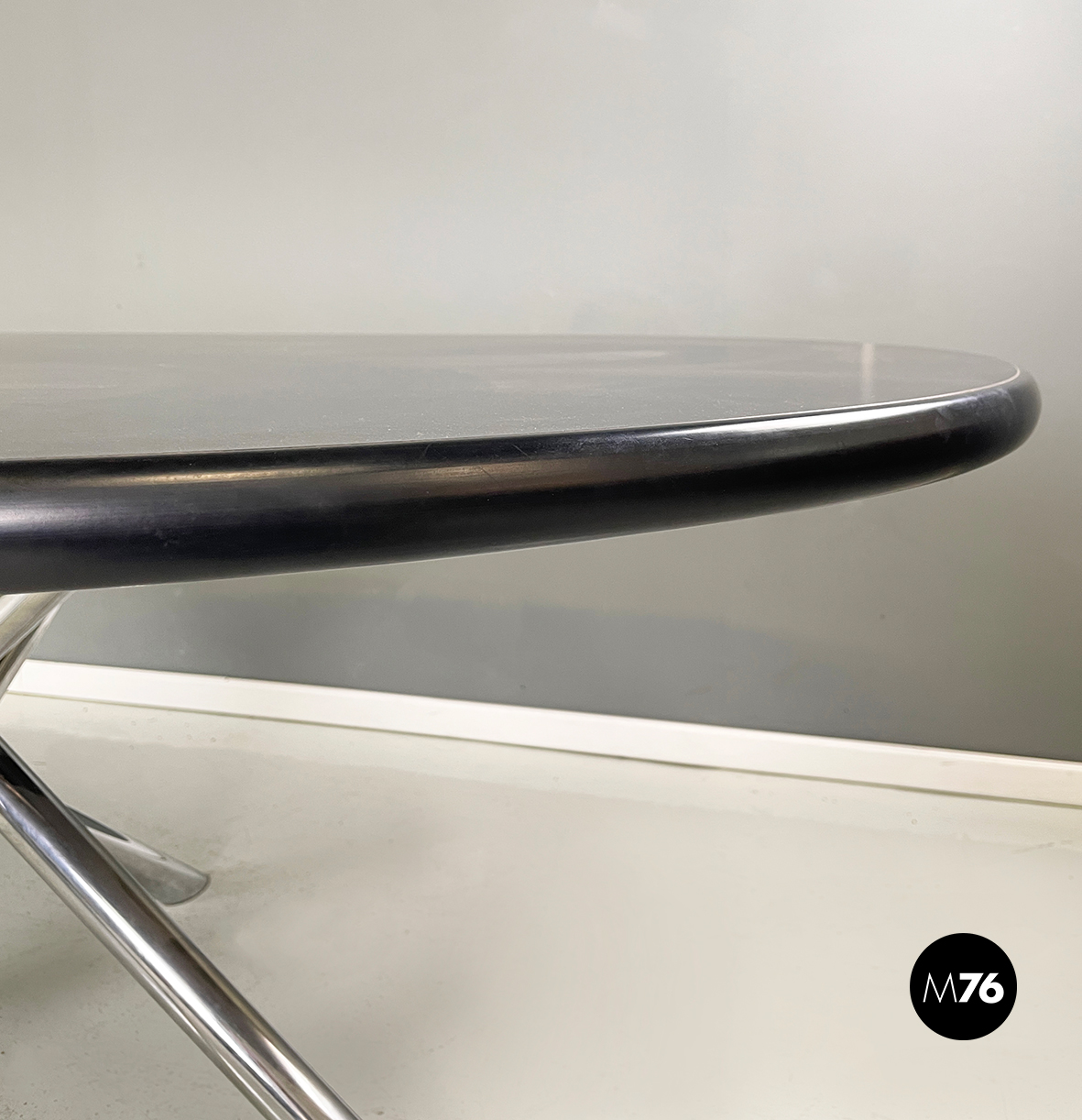 Tavolo da pranzo modello Nodo con piano ovale in legno verniciato nero e profili in gomma nera. La base è composta da una serie di tubolari di metallo che si uniscono al centro e si diradato agli estremi.