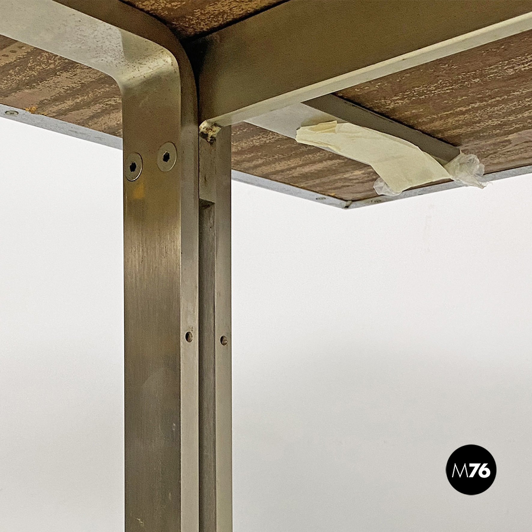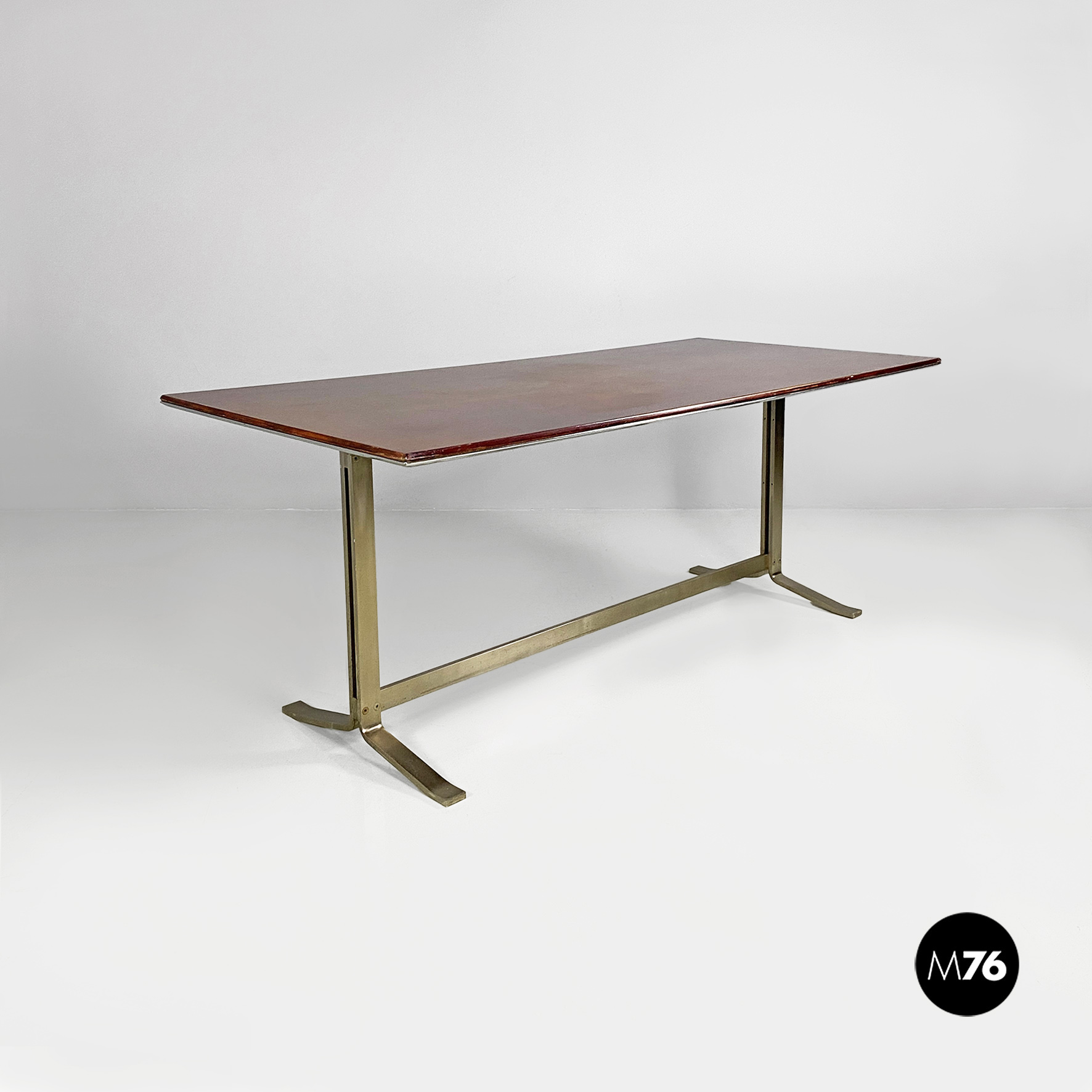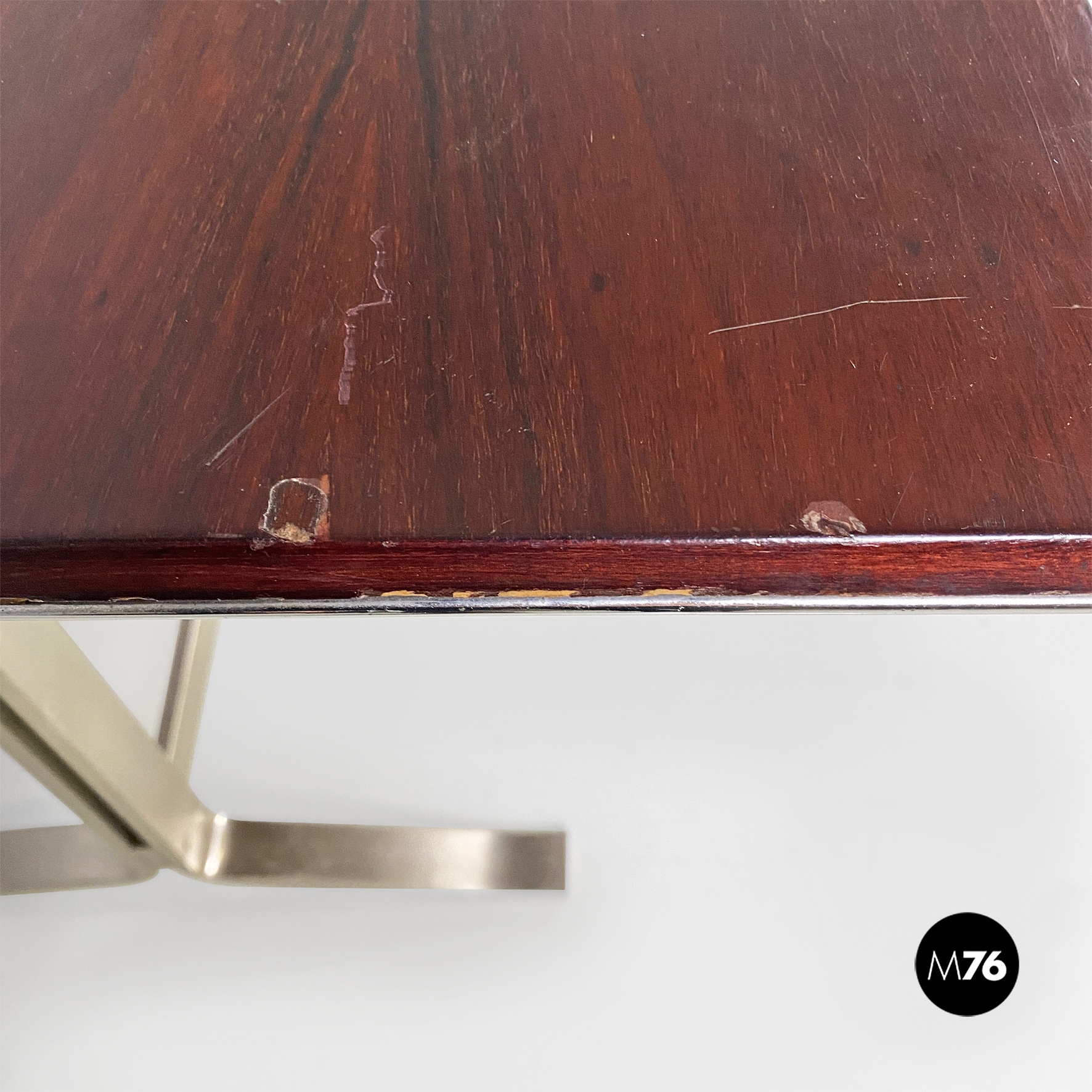 Tavolo o scrivania con piano in legno di palissandro con finitura in acciaio sul bordo e struttura in acciaio pieno con finitura satinata.