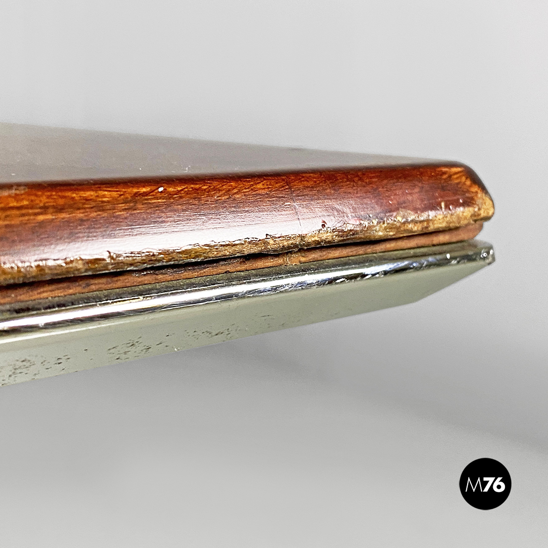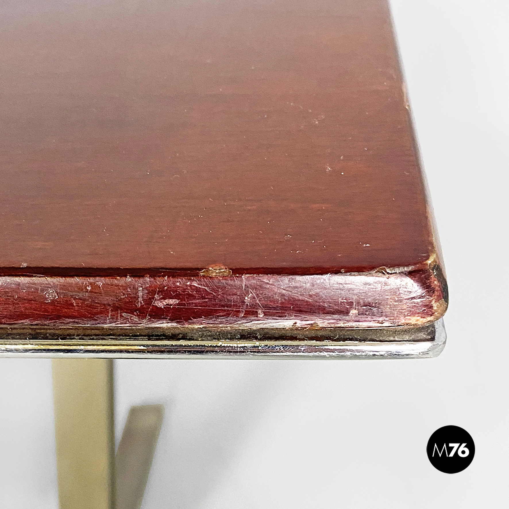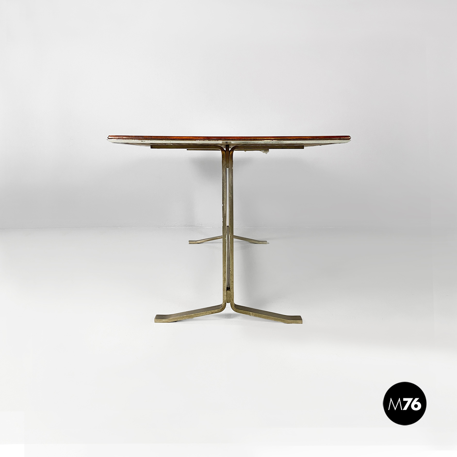 Tavolo o scrivania con piano in legno di palissandro con finitura in acciaio sul bordo e struttura in acciaio pieno con finitura satinata.