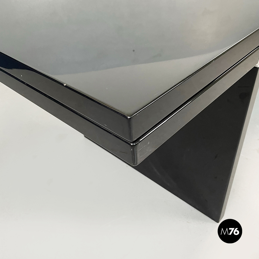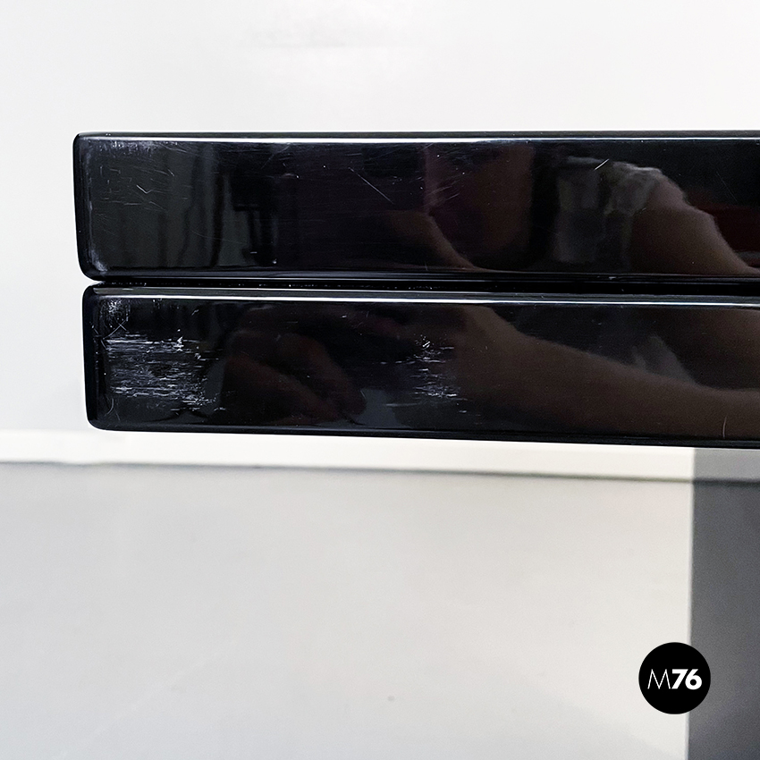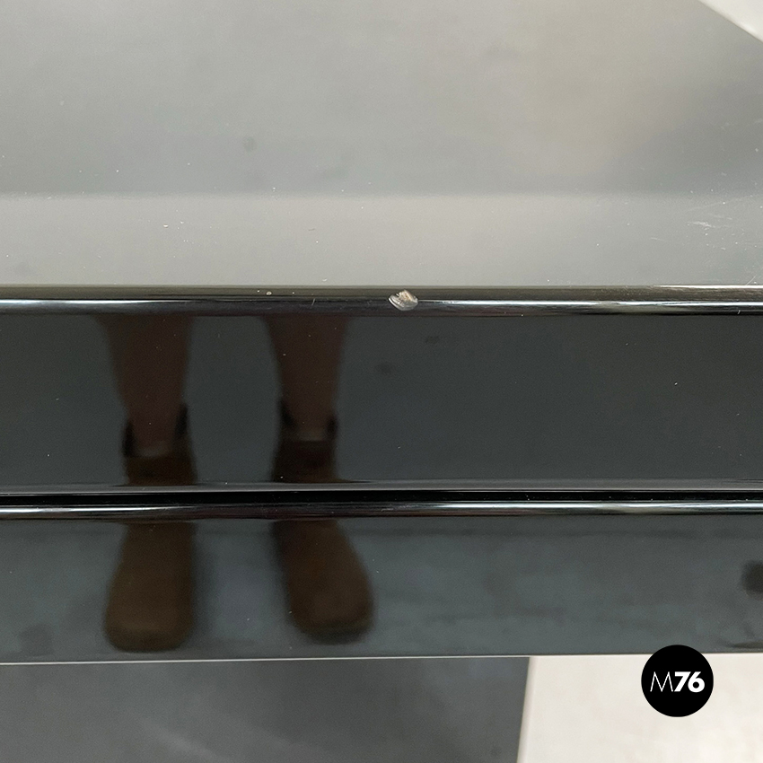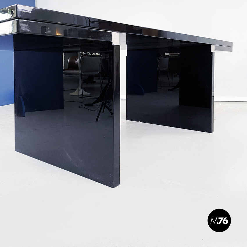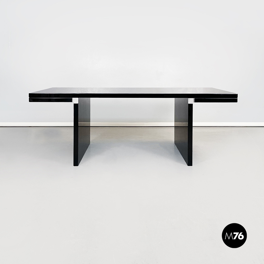 Tavolo da pranzo modello Orseolo con piano rettangolare. La struttura in legno laccato nero è realizzata tramite assemblaggio di pannelli geometrici elementari in particolare le parti esterne del piano presentano doppio spessore. L’unione tra queste parti avviene attraverso delle giunzioni in fusione di alluminio satinato.