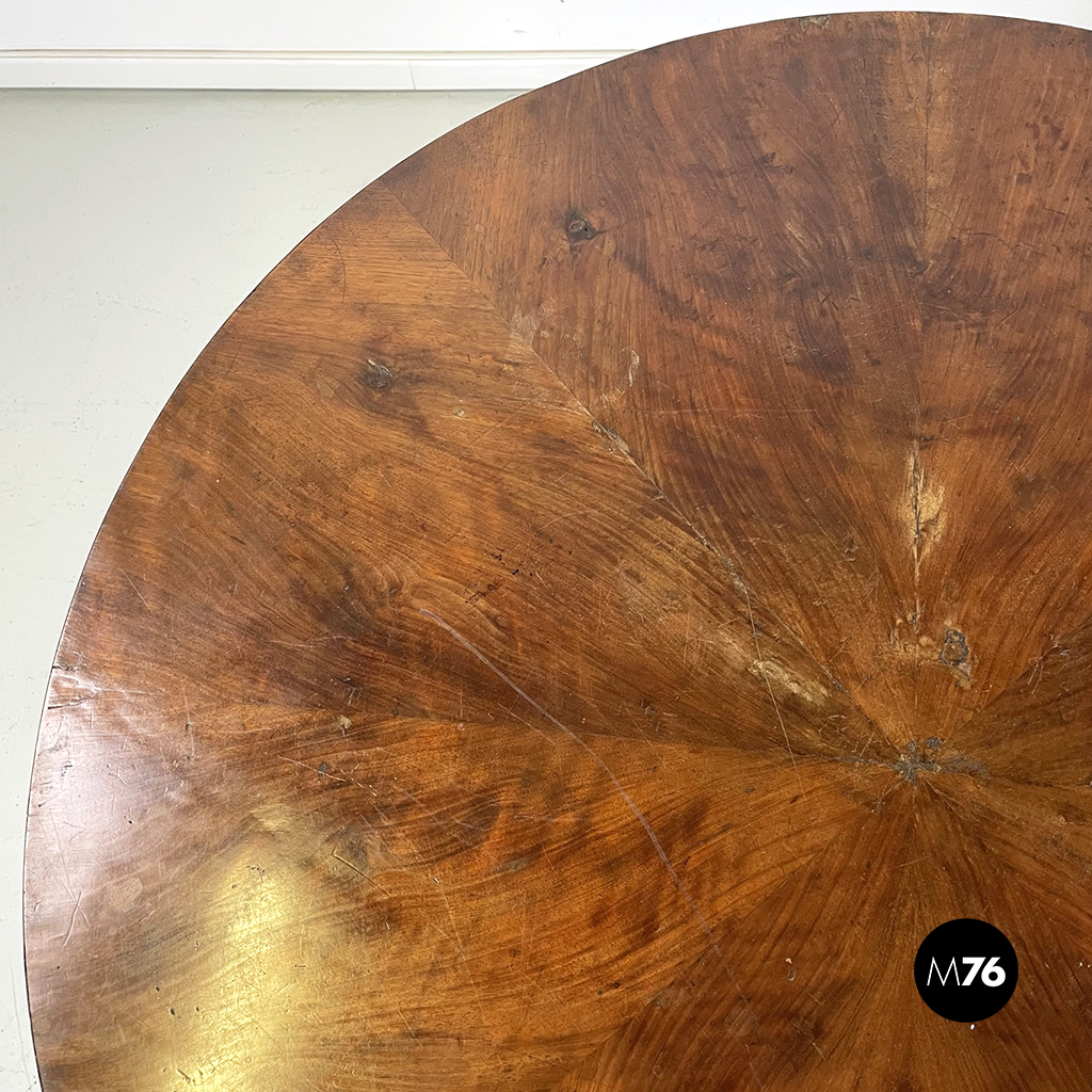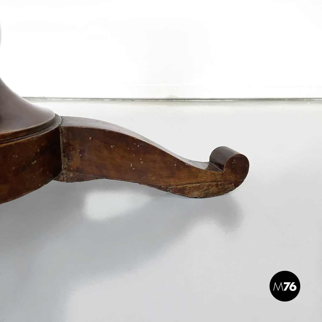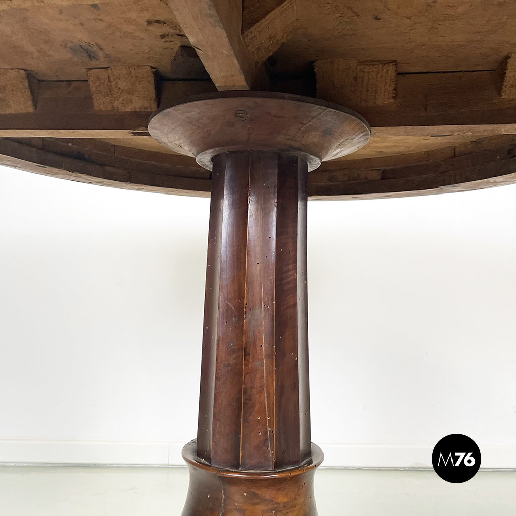 Tavolo rotondo in massello di mogano con elementi torniti e intagliati nella parte del piedistallo e della base della zampa.