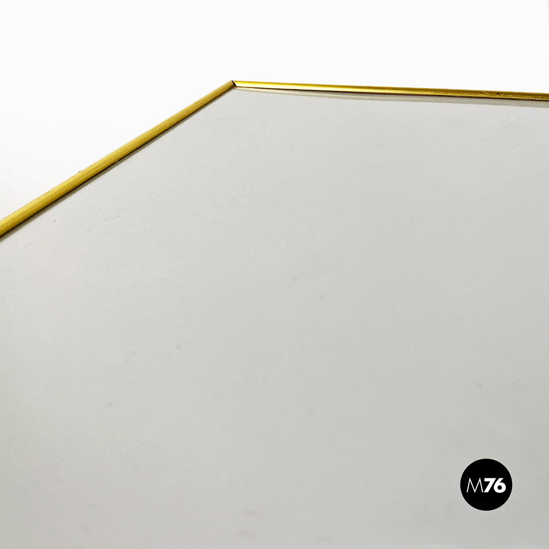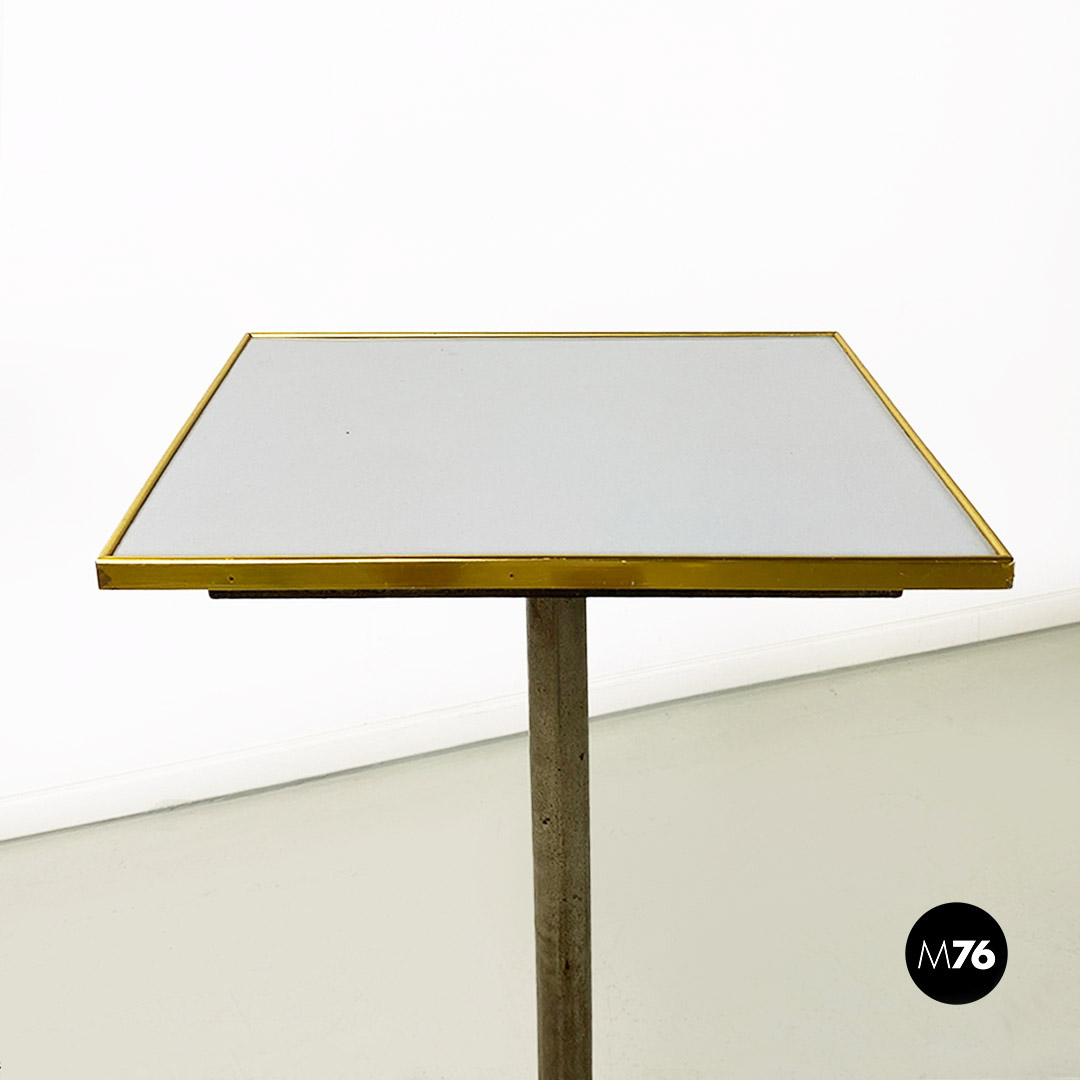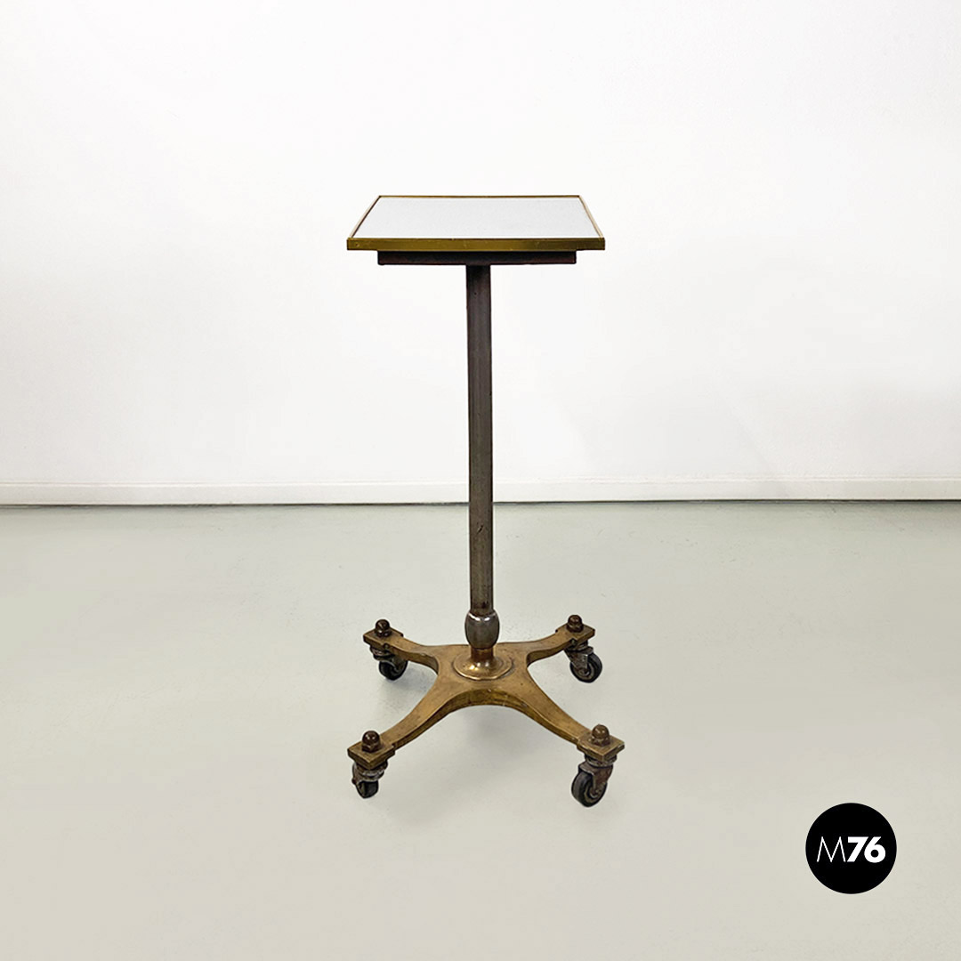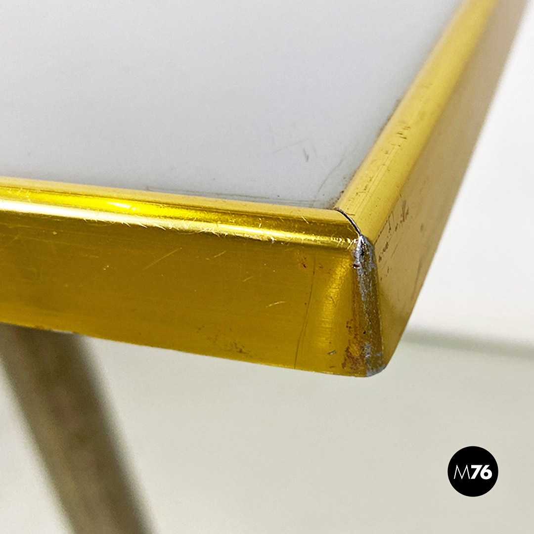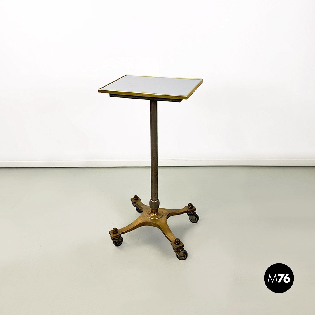 Tavolino con piano rettangolare in formica bianco struttura in ottone e base a quattro razze con ruote.