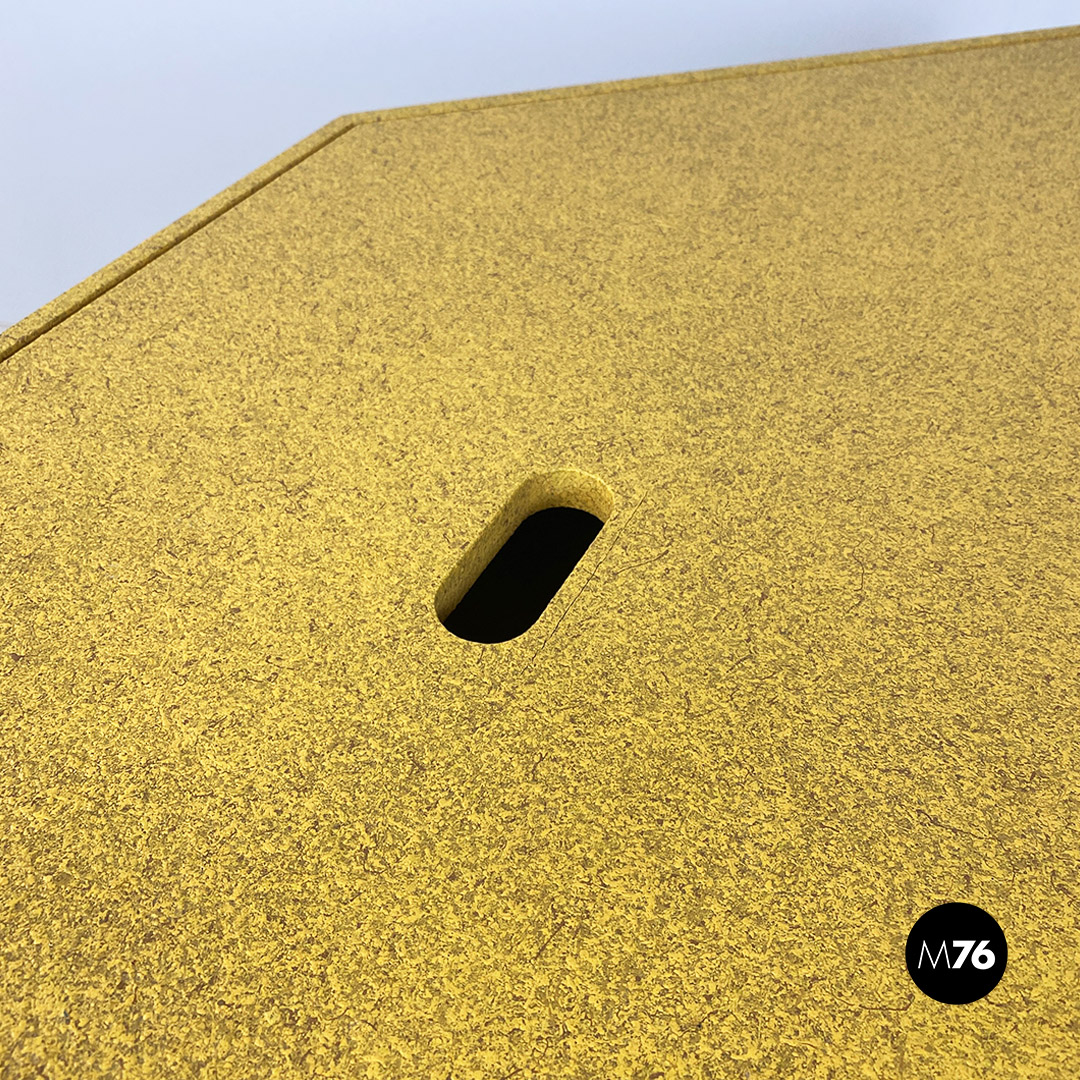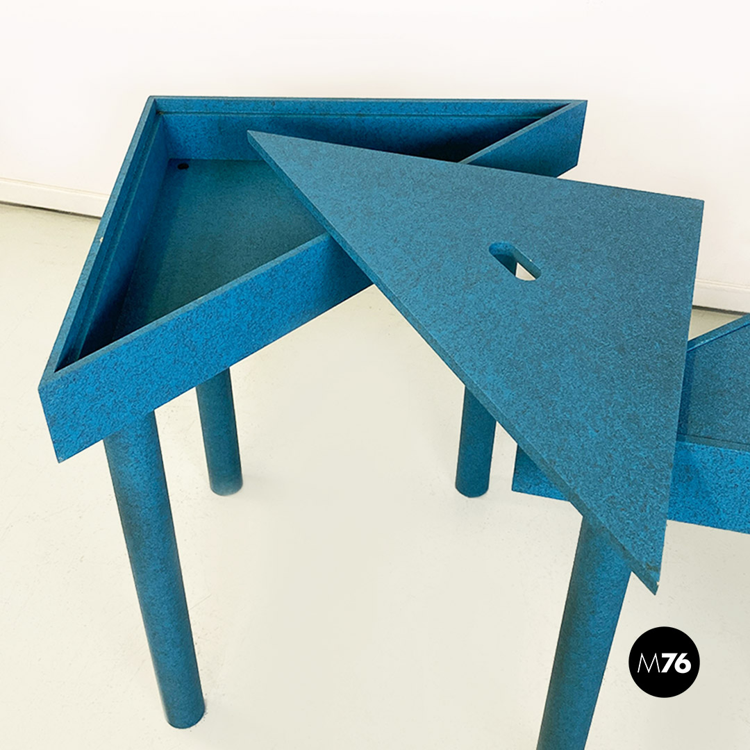 Tavolo modulare modello Tangram utilizzabile in varie configurazioni come tavolo da pranzo consolle o scrivania. Composto da quattro pezzi di cui due gemelli a triangolo di colore blu uno giallo dalla forma a trapezio con piano estraibile a coperchio come per i primi due moduli blu ed infine quarto pezzo di forma triangolare di colore grigio con area pari alla somma dei primi tre moduli. Struttura in legno di faggio colorato. Interamente smontabili.