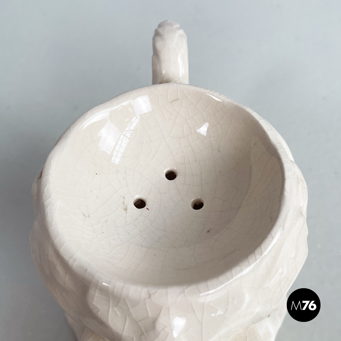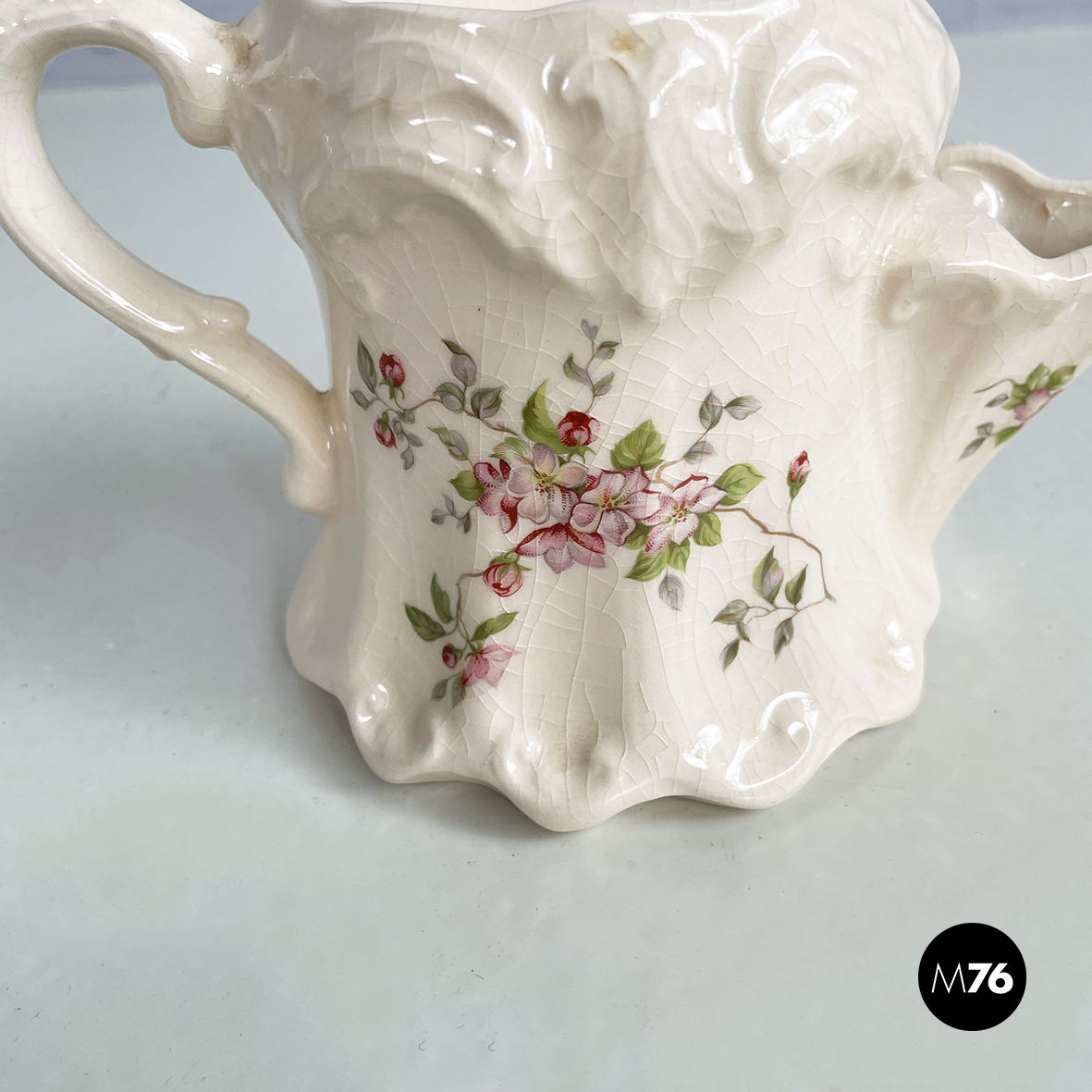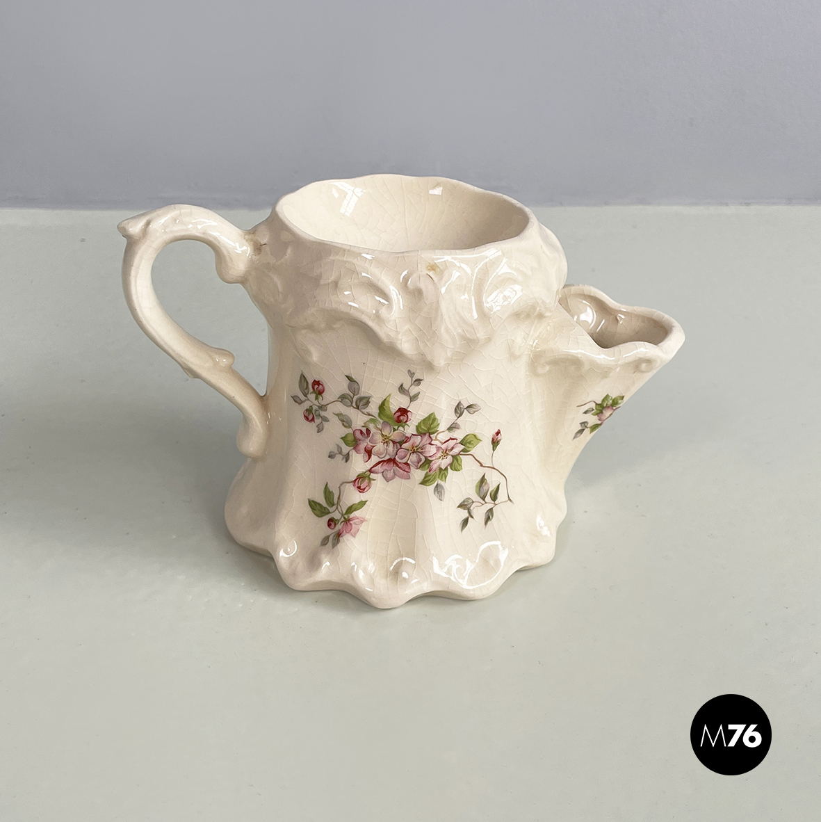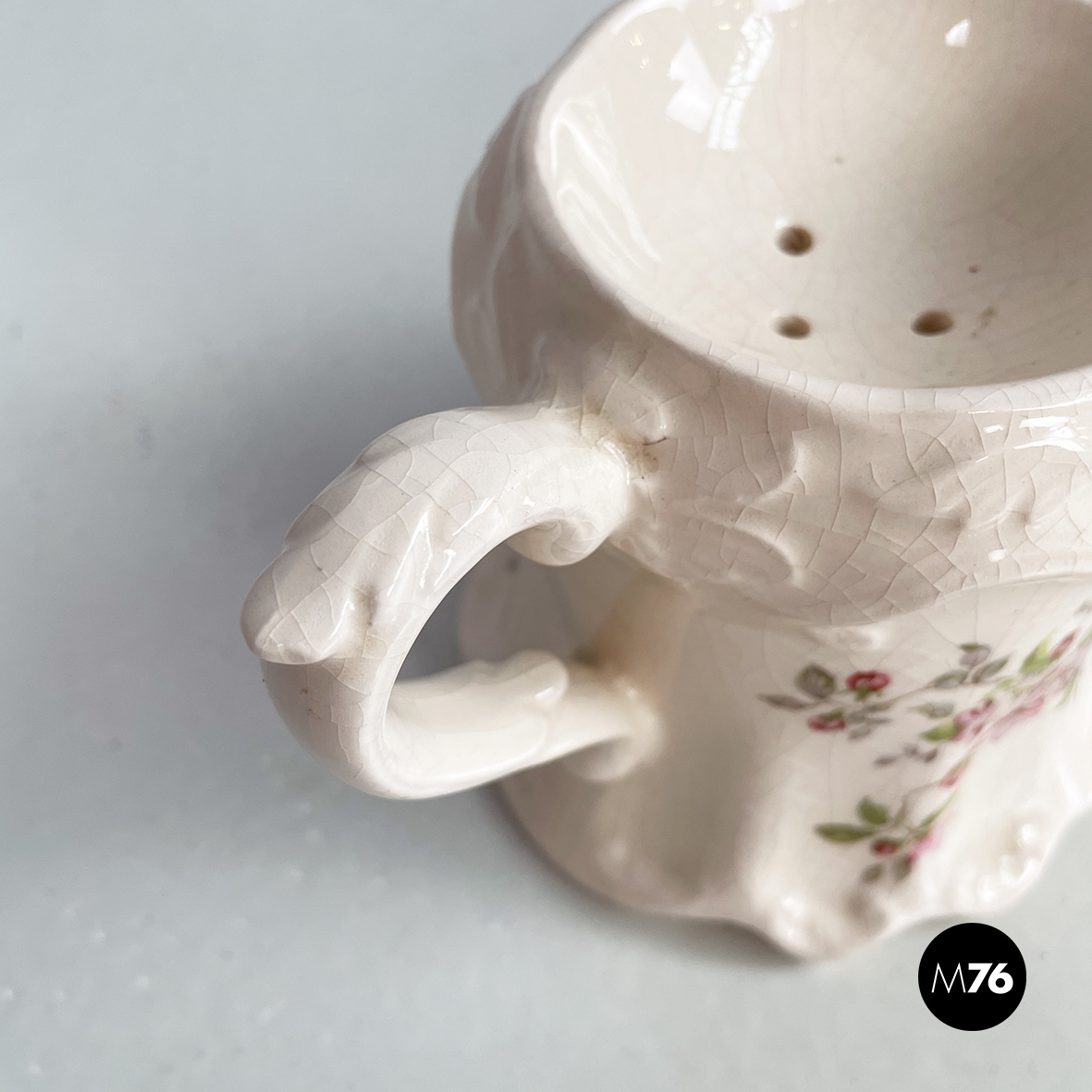 Tazza per schiuma da barba a base tonda in ceramica bianca decorata con fiori rosa chairo. Nella parte superiore presenta la parte conca con tre fori. Manico presente. Finemente lavorato nella forma.