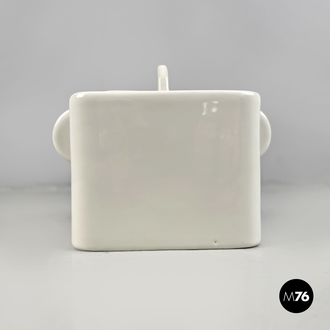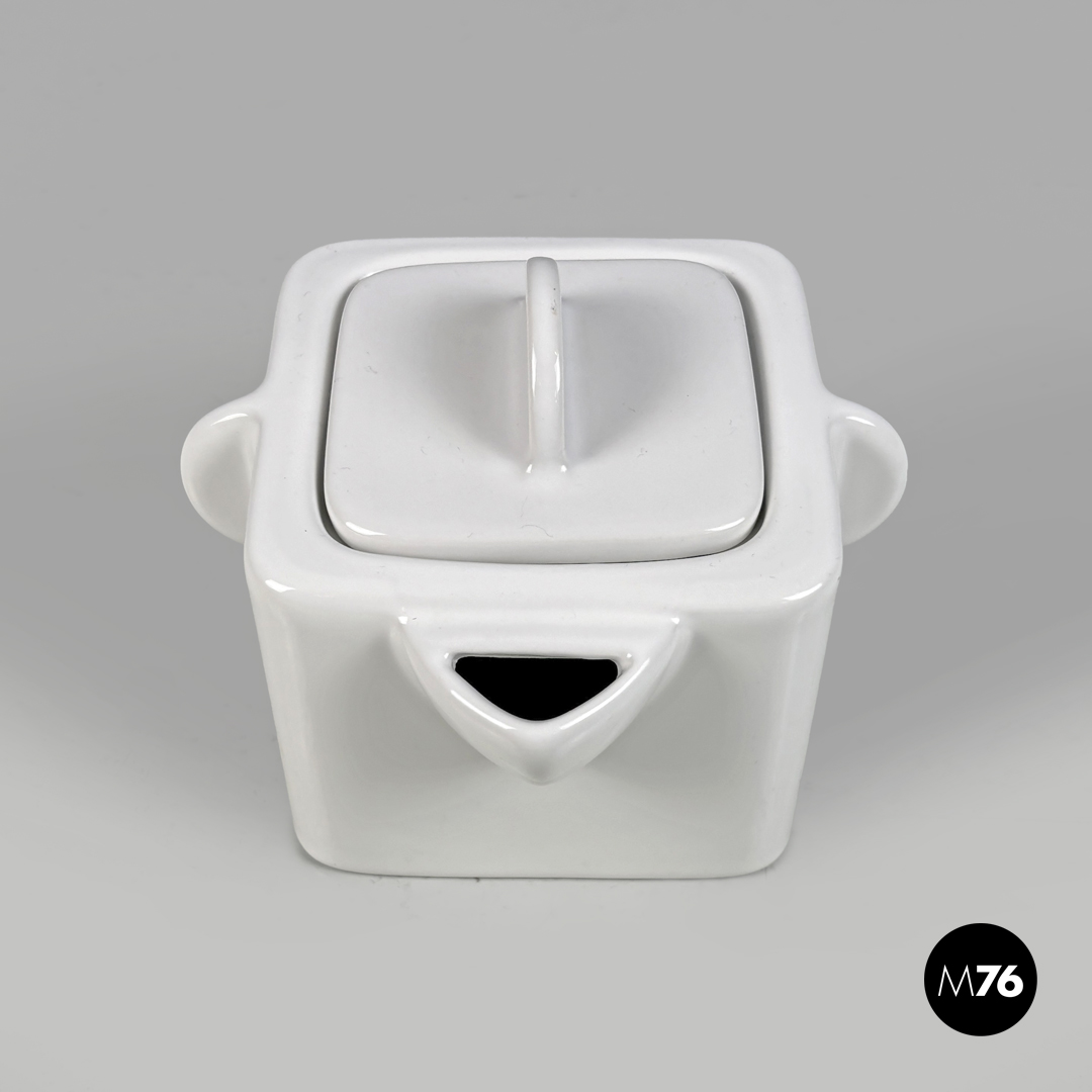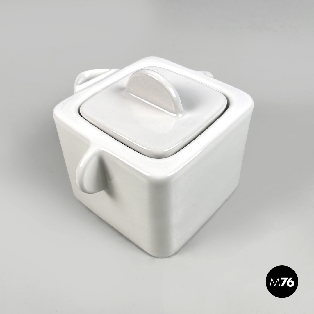Teiera a base quadrata in ceramica bianca. Il tappo quadrato presenta una piccola maniglia semicircolare le stesse maniglie si trovano sui lati la stessa forma circolare stondata si ripete anche per il beccuccio.