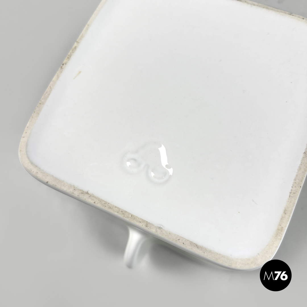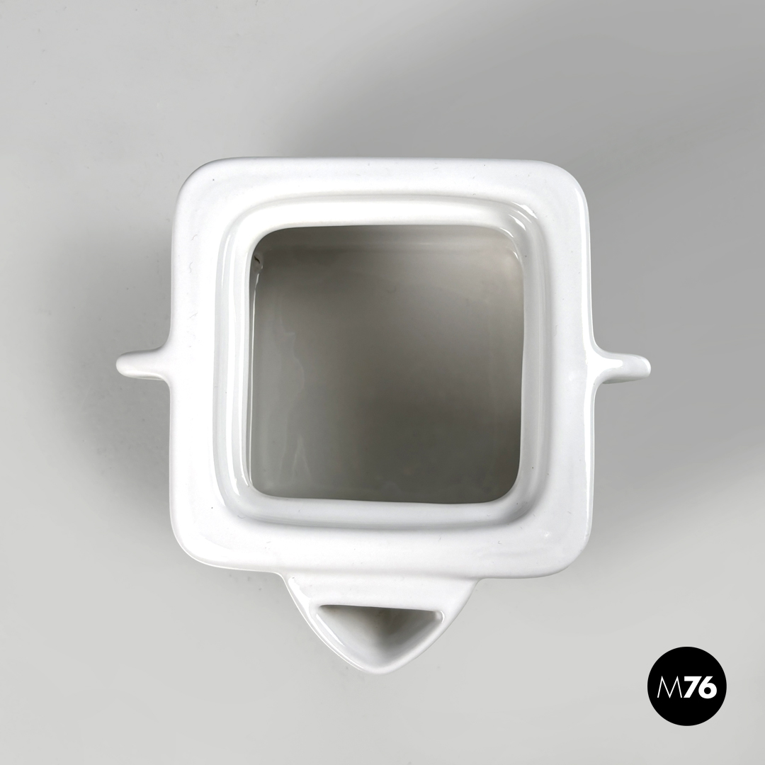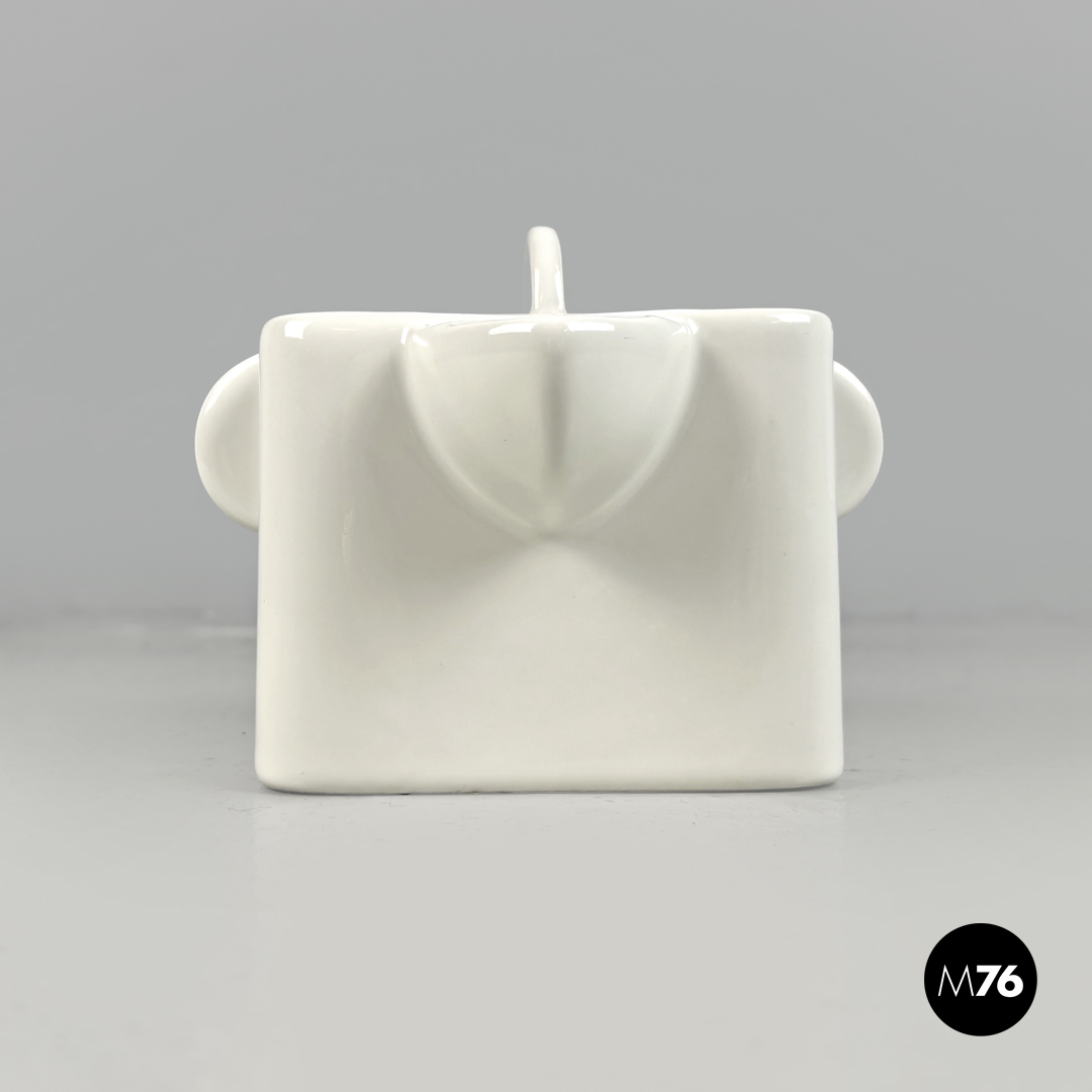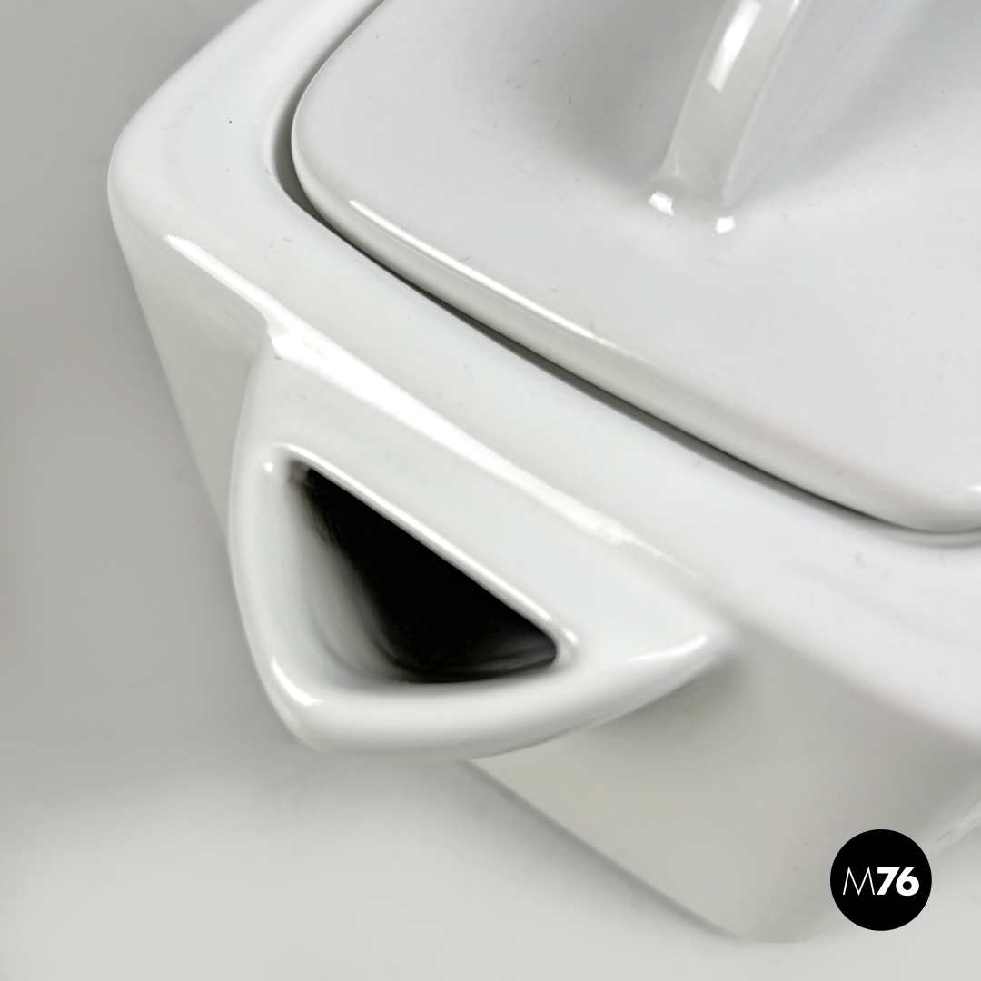 Teiera a base quadrata in ceramica bianca. Il tappo quadrato presenta una piccola maniglia semicircolare le stesse maniglie si trovano sui lati la stessa forma circolare stondata si ripete anche per il beccuccio.