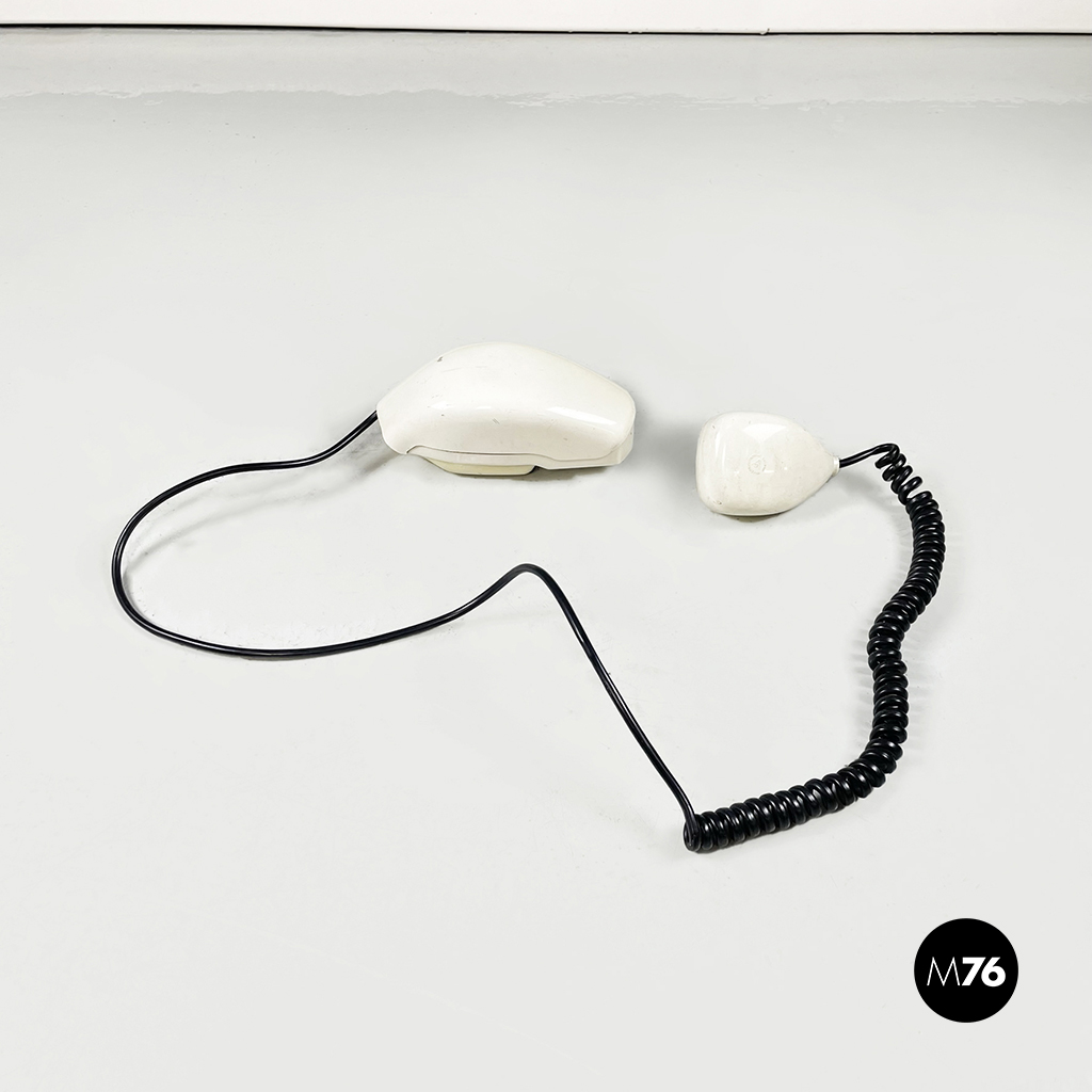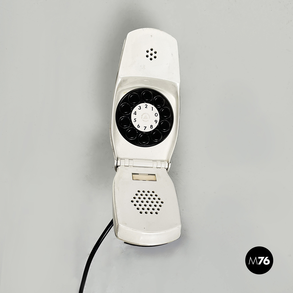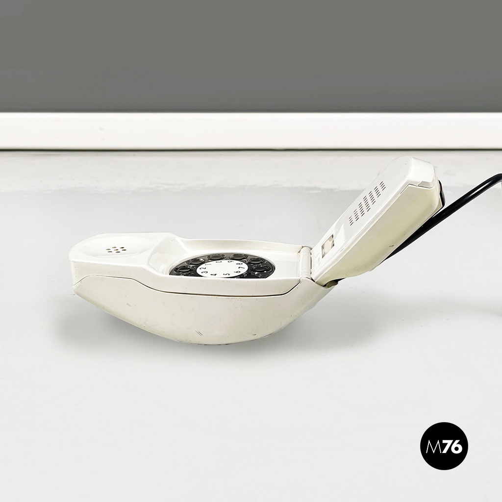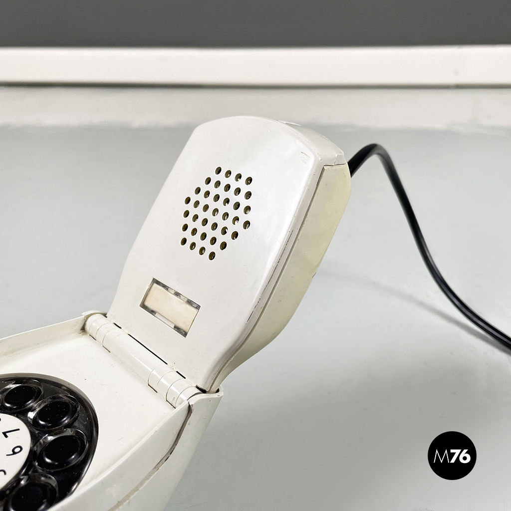 Telefono modello Grillo a forma di “conchiglia” in plastica. La cornetta telefonica è composta da due parti pieghevoli in plastica bianca con tasti neri.