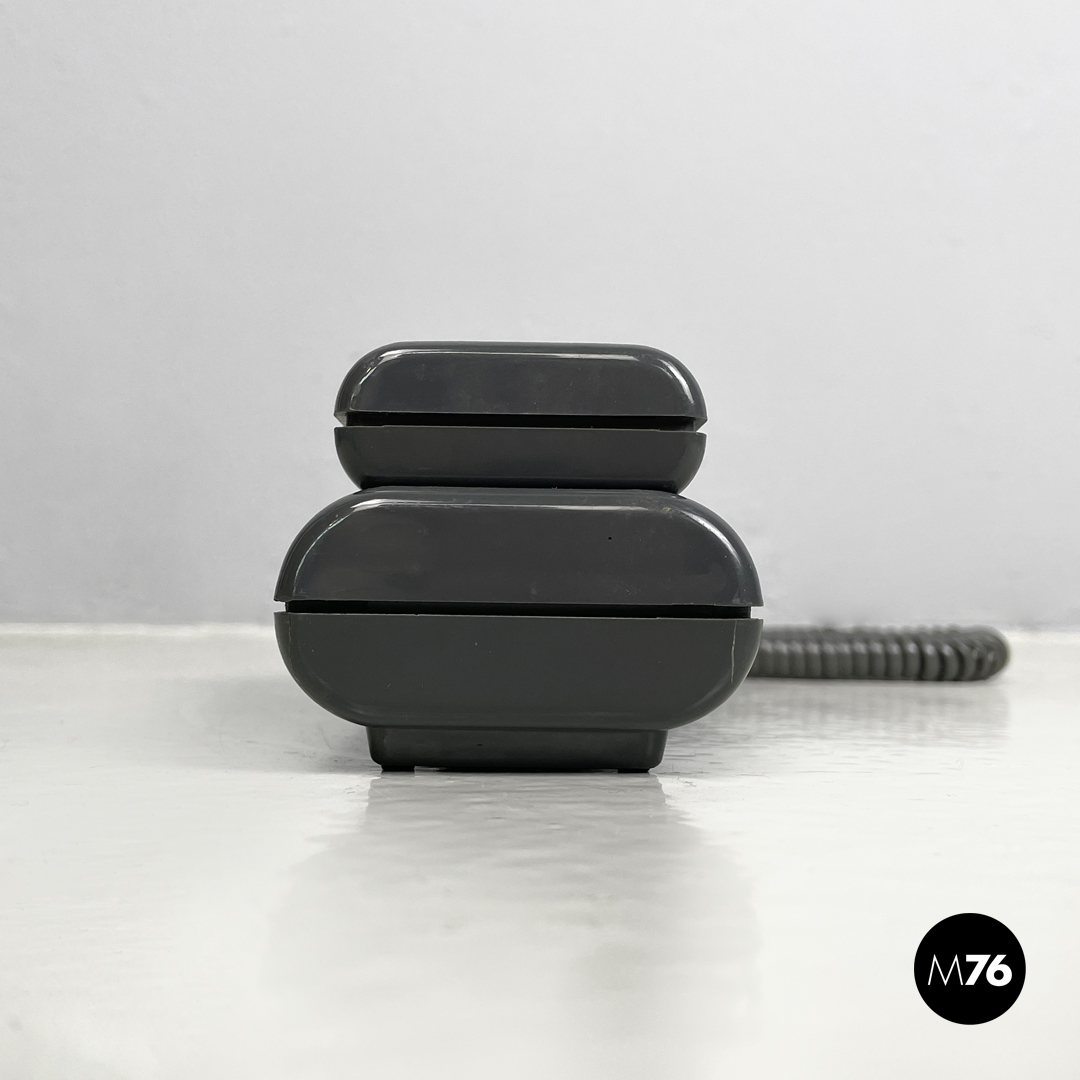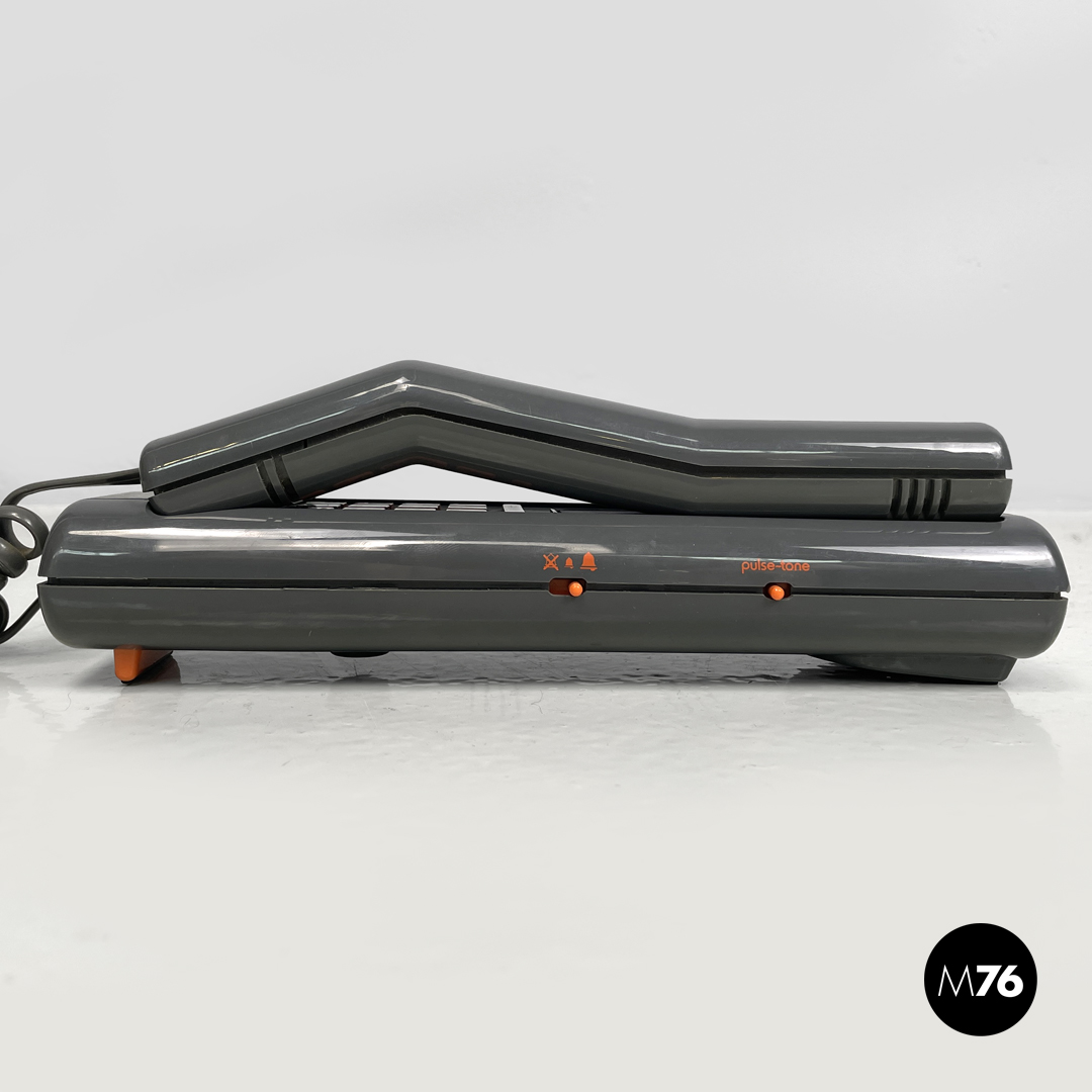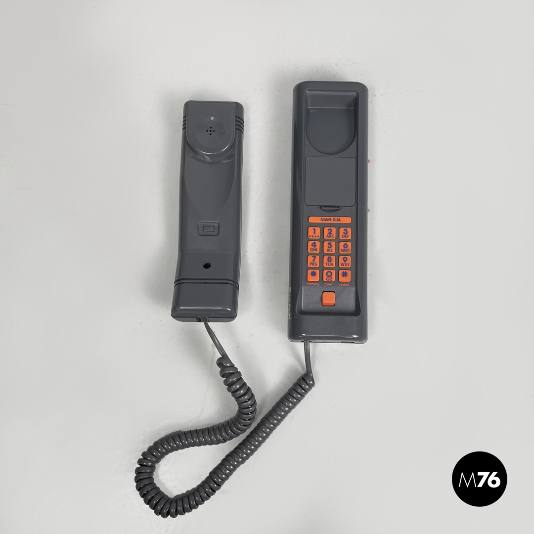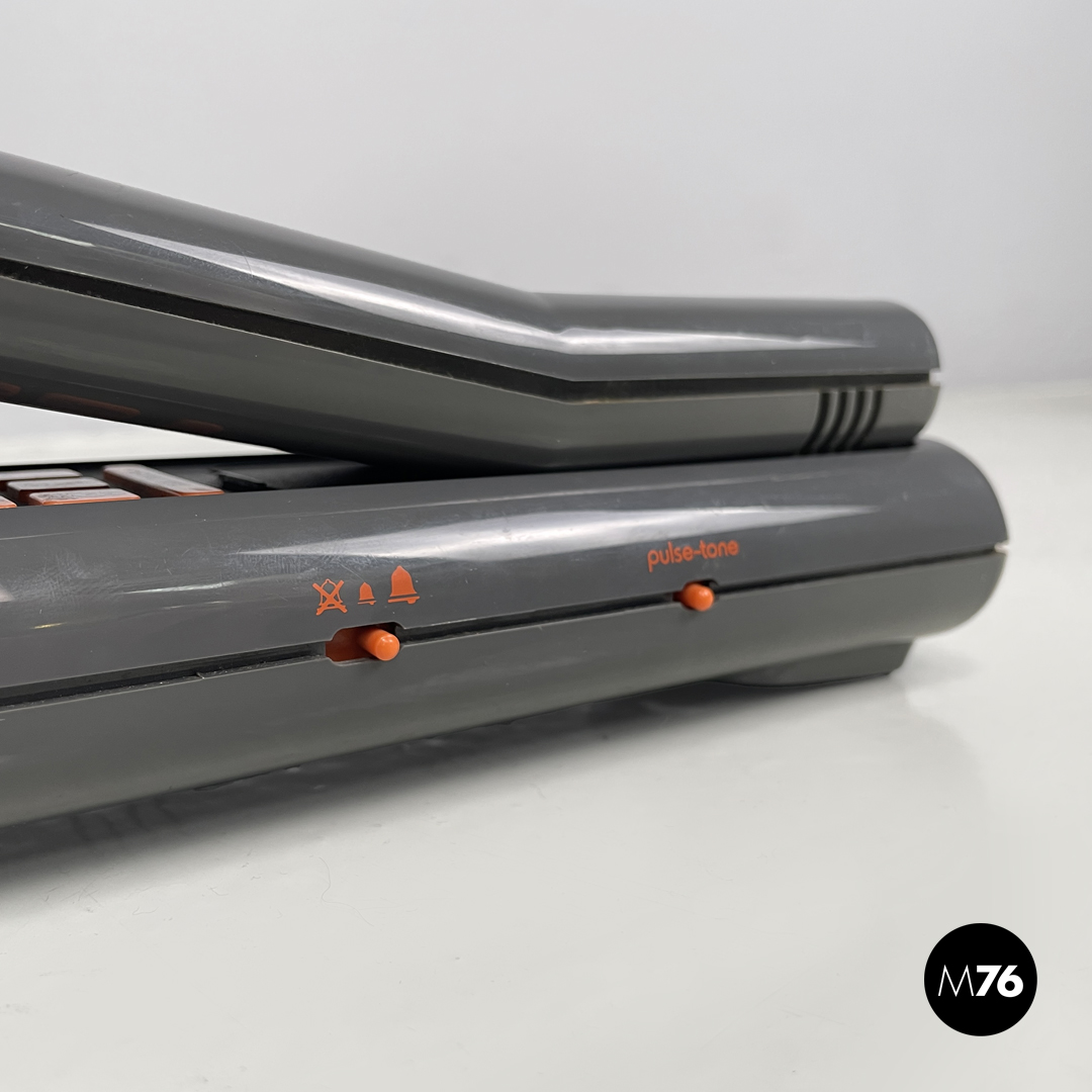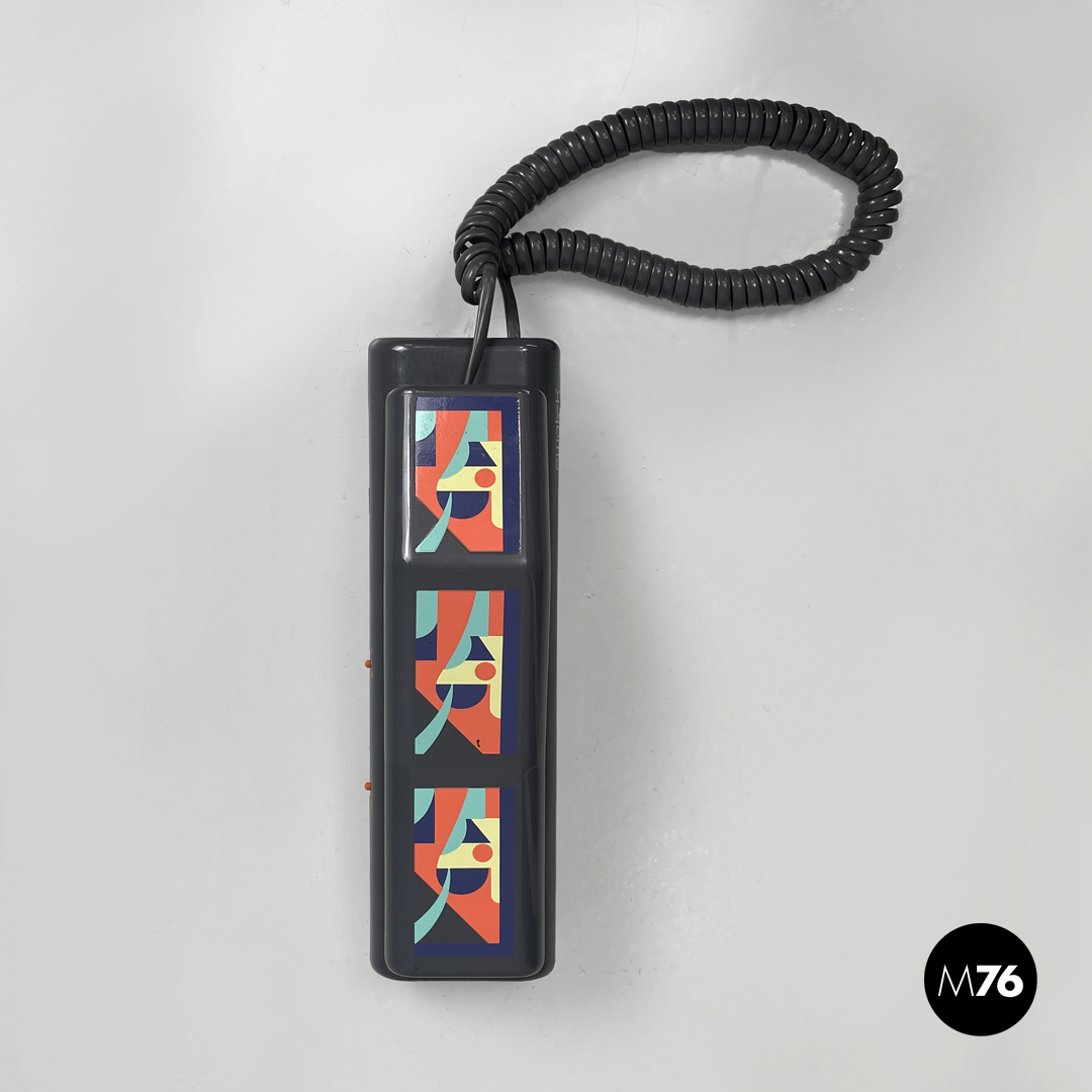 Telefono fisso modello Twin Phone Deco in plastica grigia. Sulla cornetta sono presenti decorazioni geometriche stampate dai colori rosso giallo blu e celeste. I tasti con i numeri e quelli laterali sono in plastica arancione così come i due piedini.