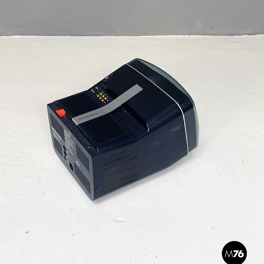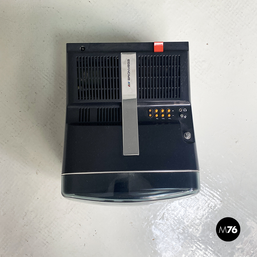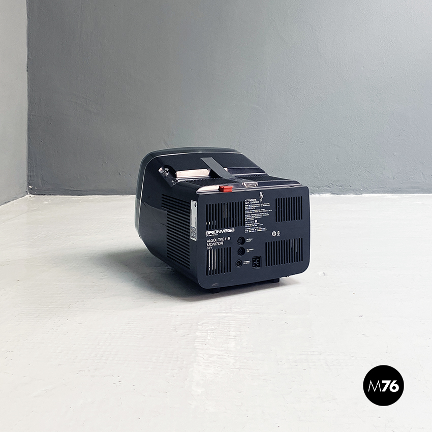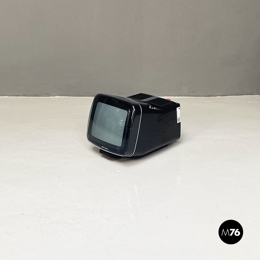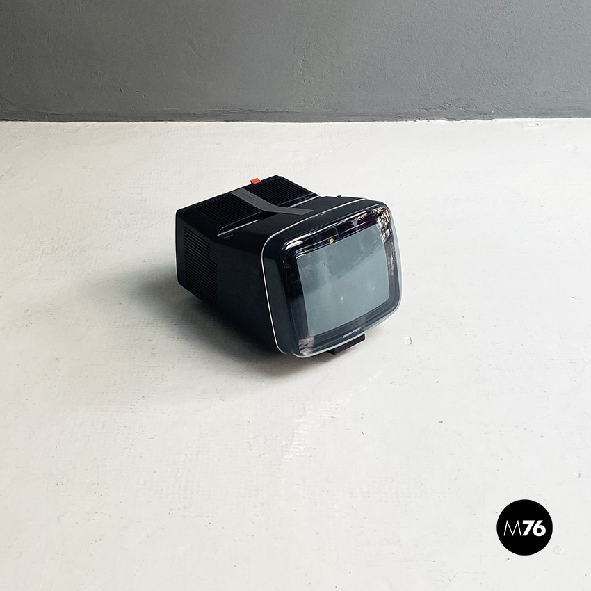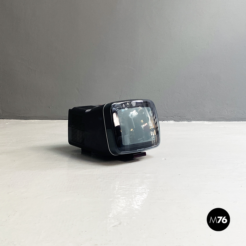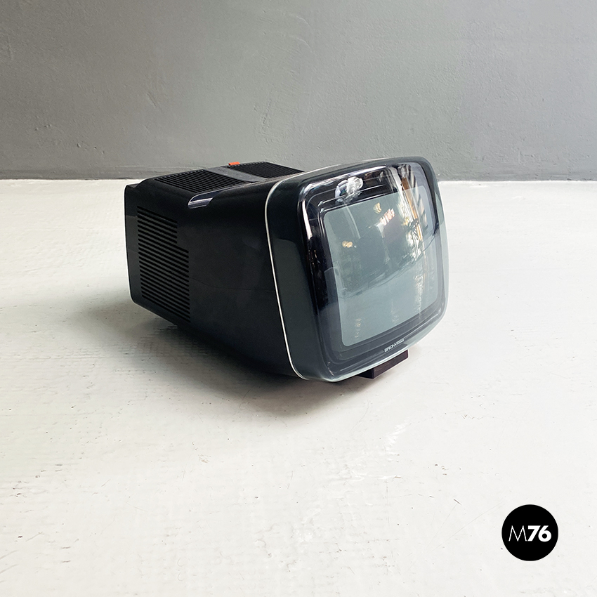 Televisione Brionvega Algol 11 nera realizzata con materiale plastico colorato (ABS) e con l’utilizzo dei transistor. La parte anteriore della struttura si conclude con lo schermo che permette la visione anche quando l’apparecchio è posato a terra.