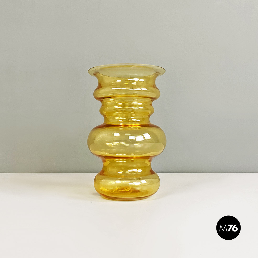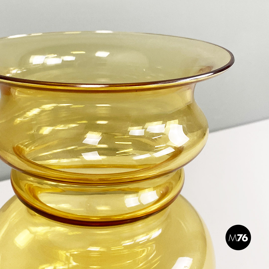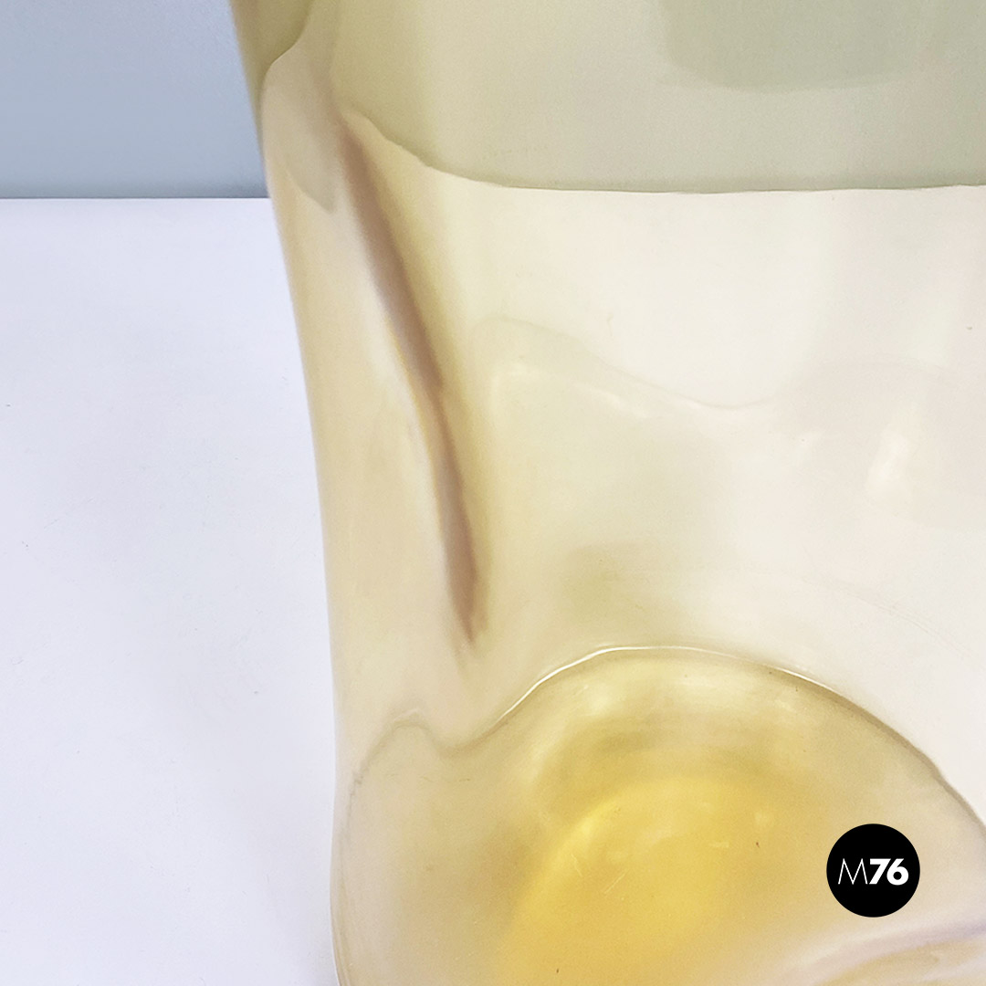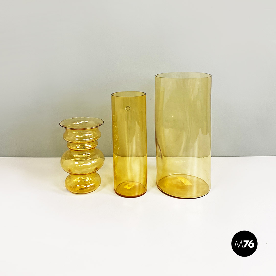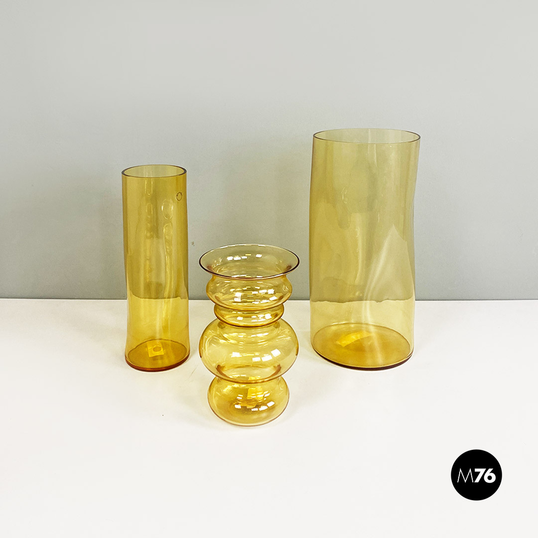 Set composto da tre vasi in vetro di Murano soffiato di colore giallo con tre forme e dimensioni diverse.