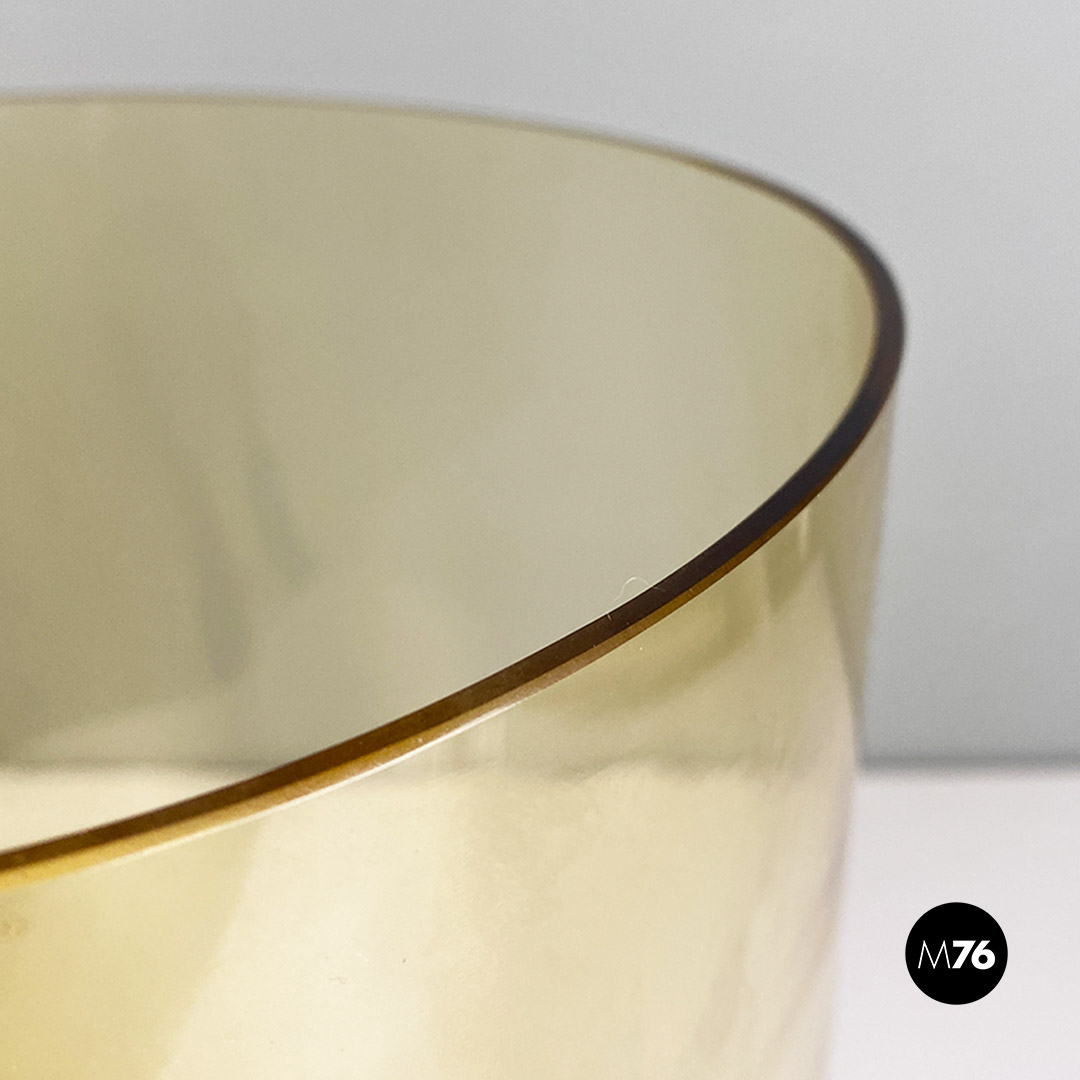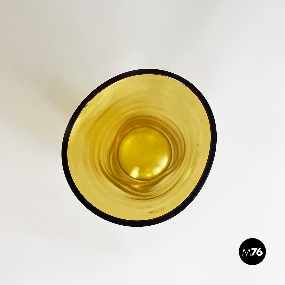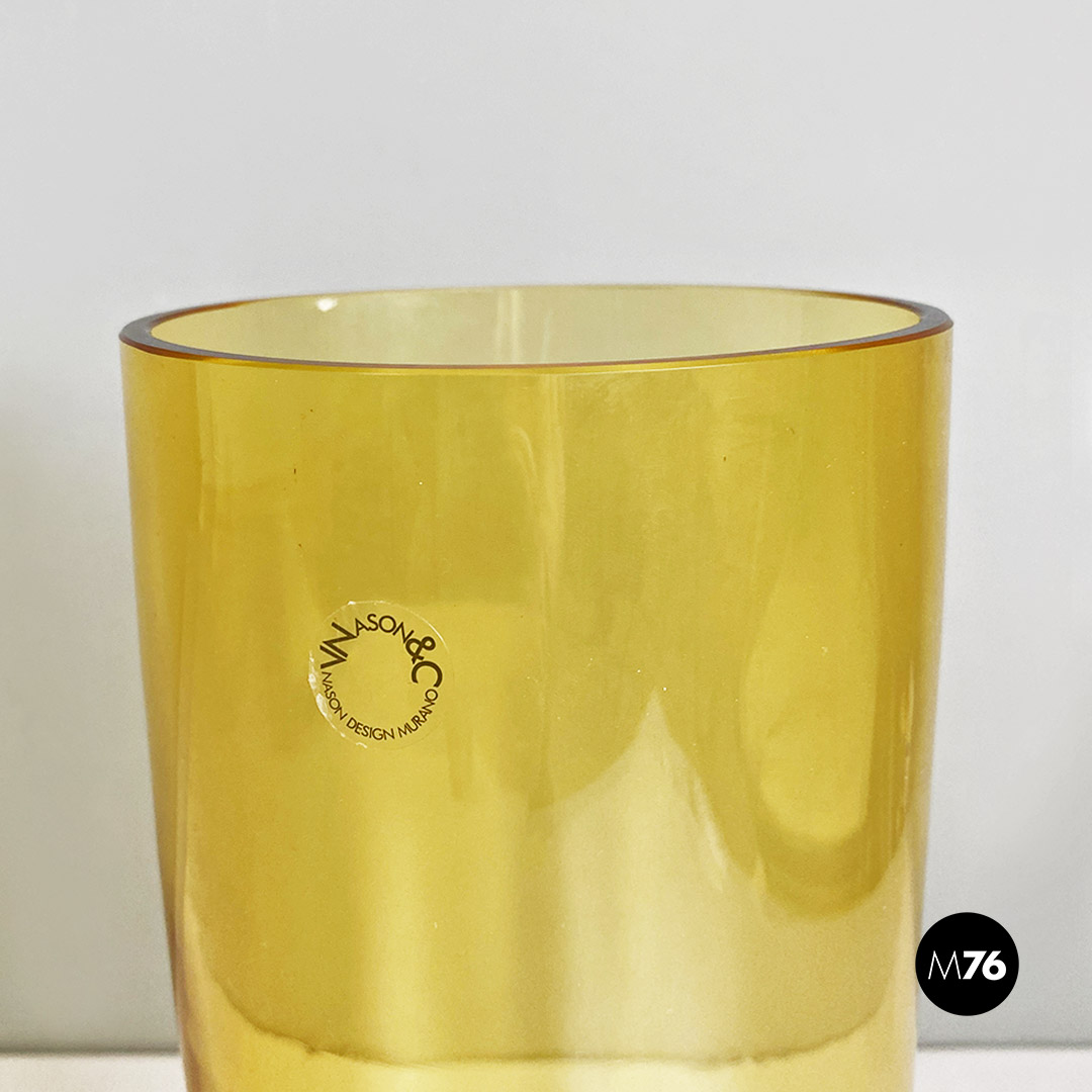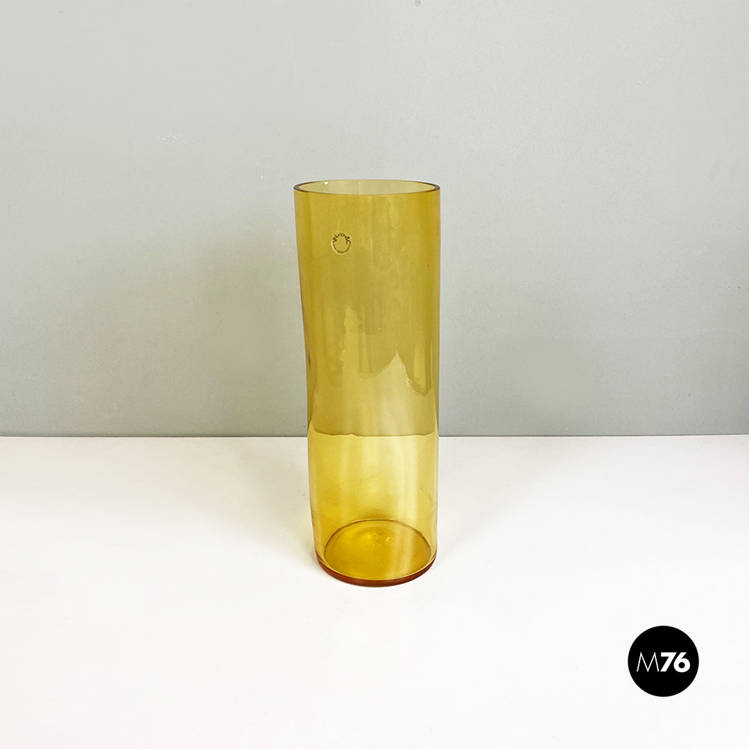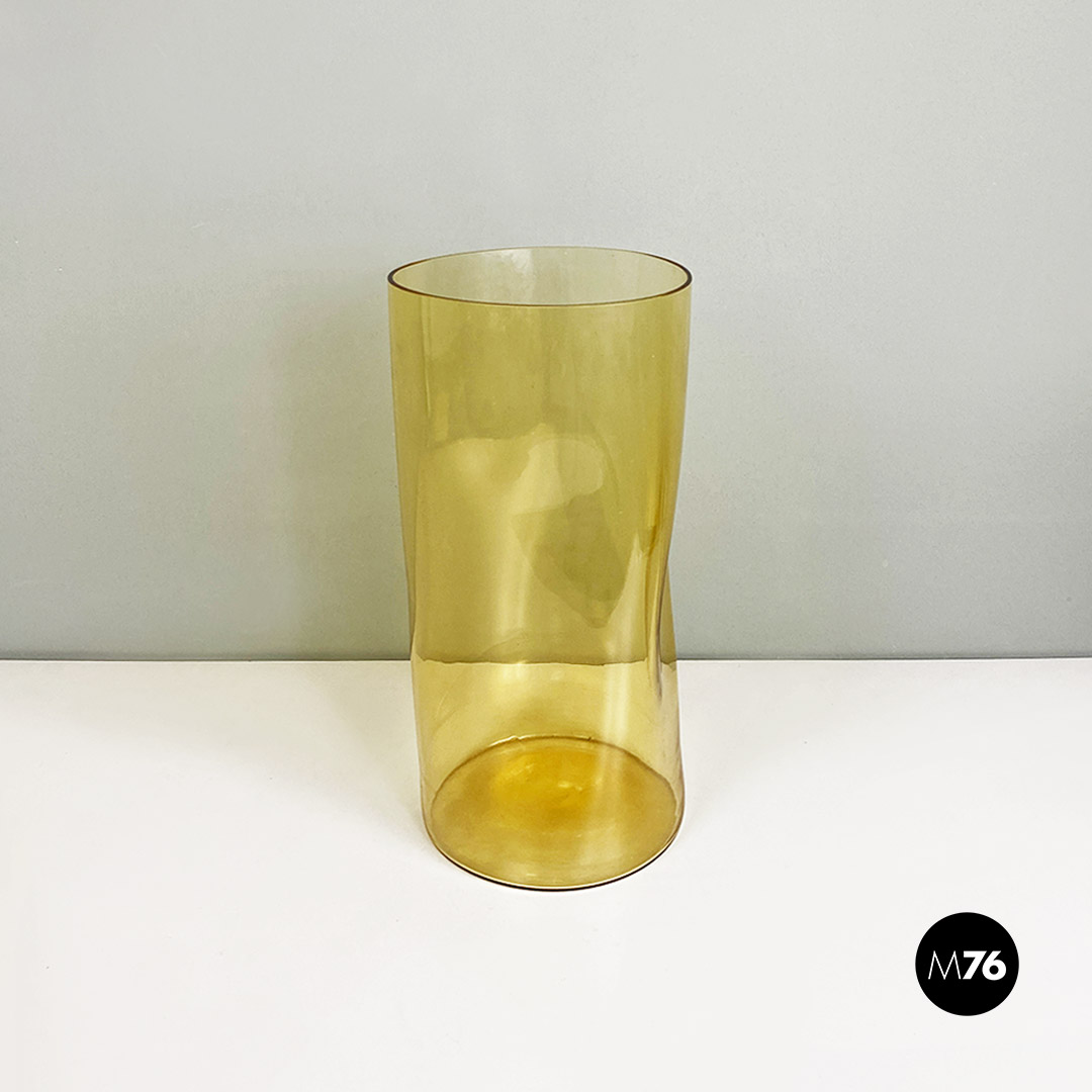 Set composto da tre vasi in vetro di Murano soffiato di colore giallo con tre forme e dimensioni diverse.