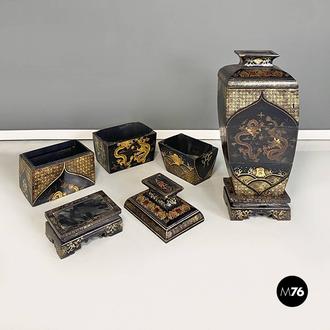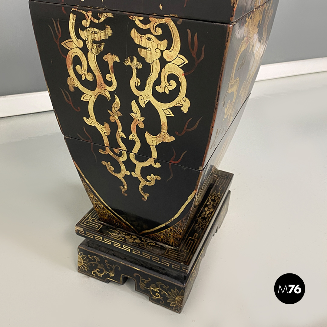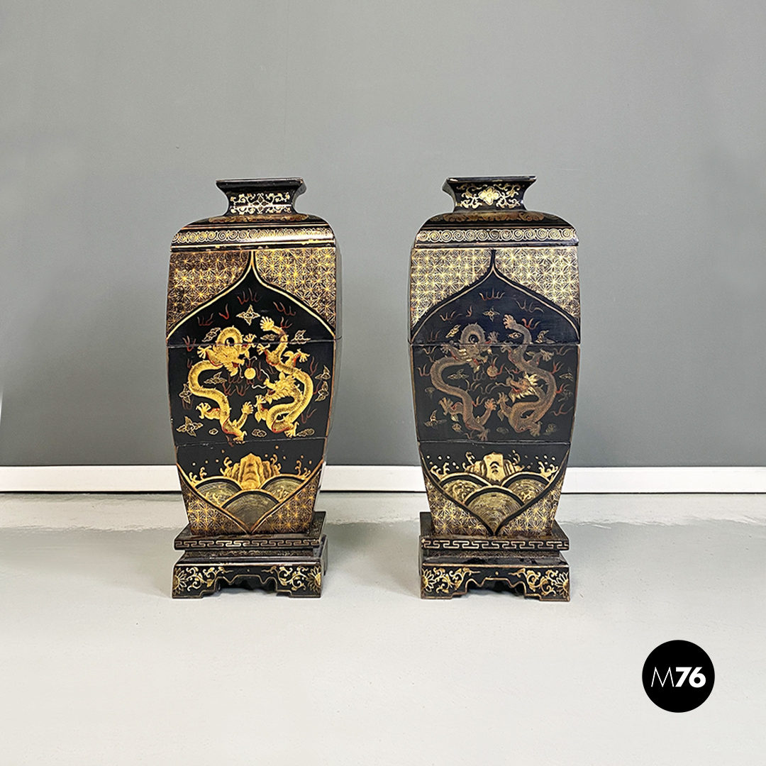 Coppia di sculture componibili orientali in legno a forma di vaso o urna. Ognuna di esse è composta da cinque pezzi partendo dal basamento con tre contenitori intermedi e un ultimo pezzo a chiudere il contenitore più alto. Struttura interamente decorata con disegni orientali tipici come foo dog e draghi uguali sui due vasi ma con finitura dorata più scura su uno rispetto all’altro.