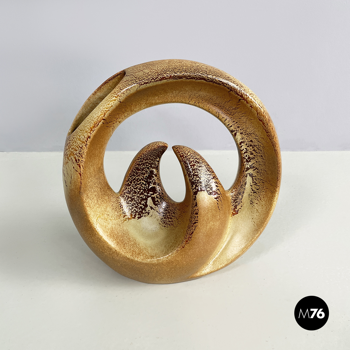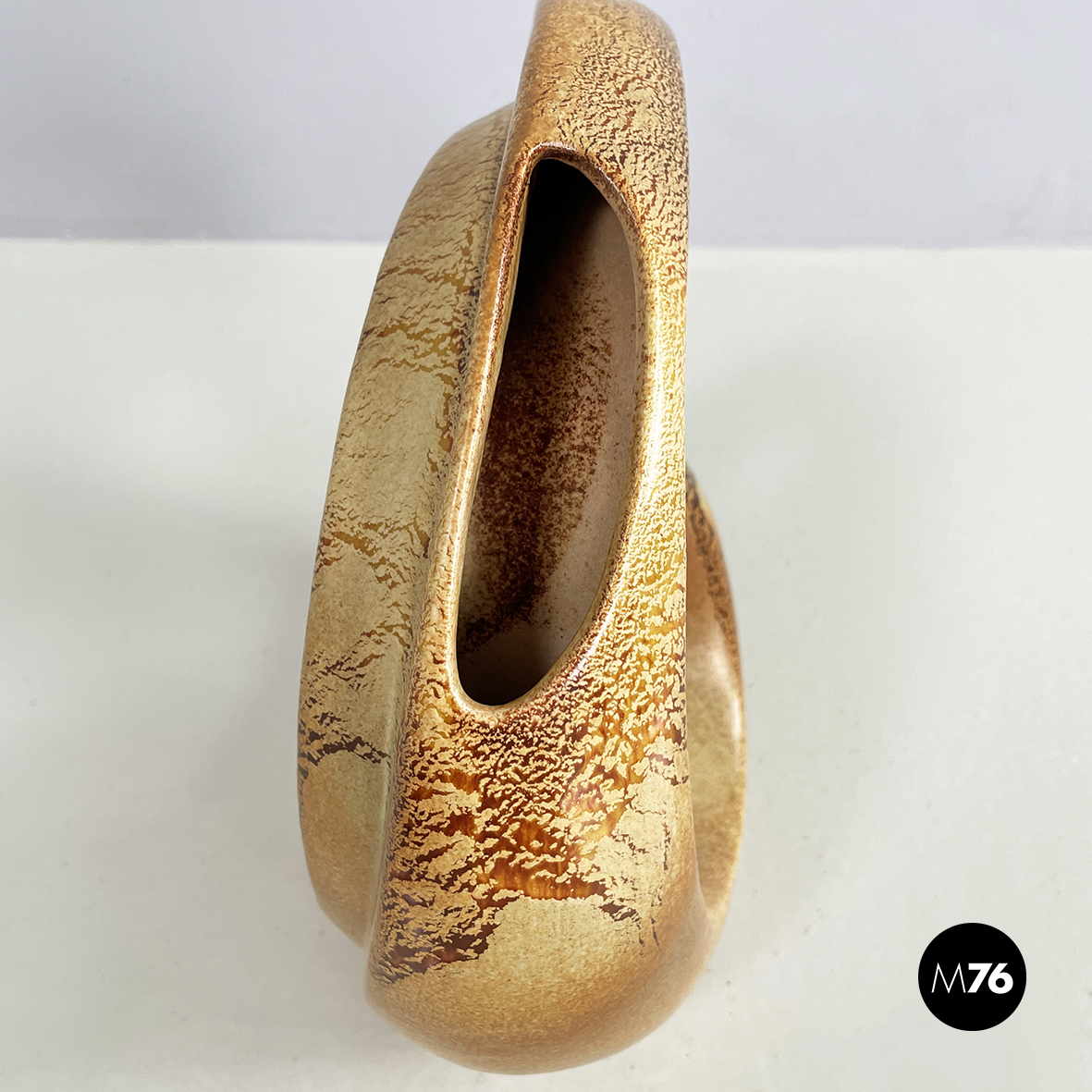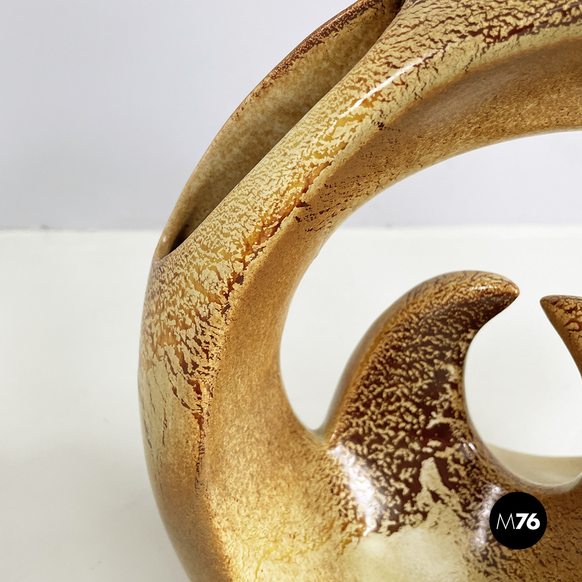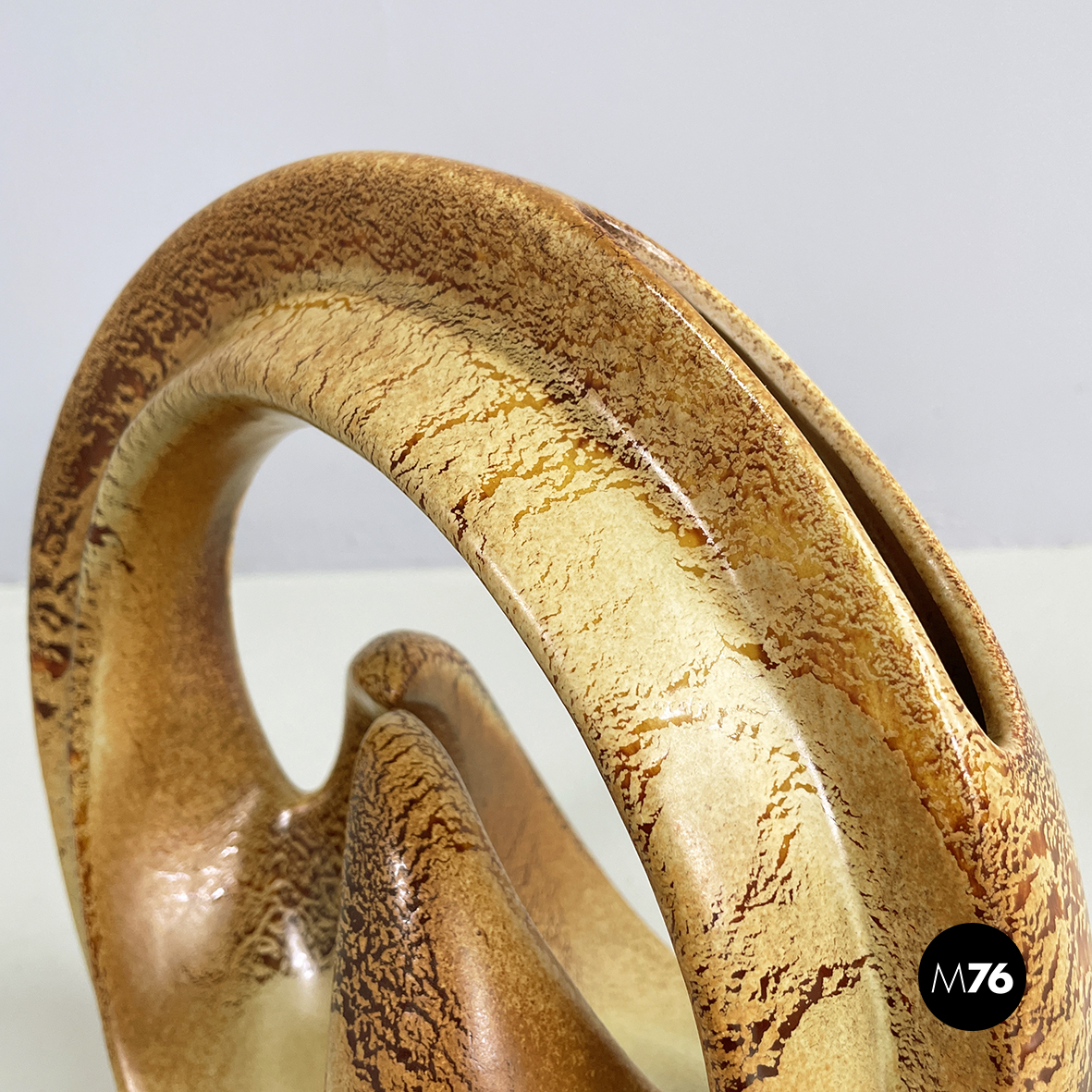 Vaso scultoreo in ceramica dipinta tra i toni del marrone e del beige. Il vaso è composto da forme tonde e organiche. Nella parte superiore presenta il foro tondo.