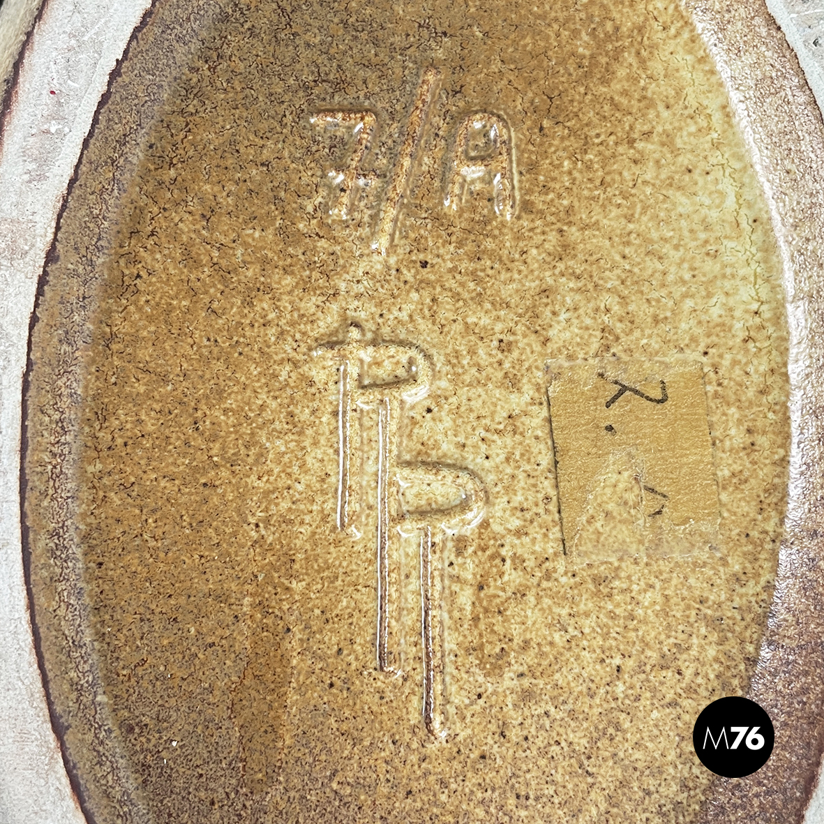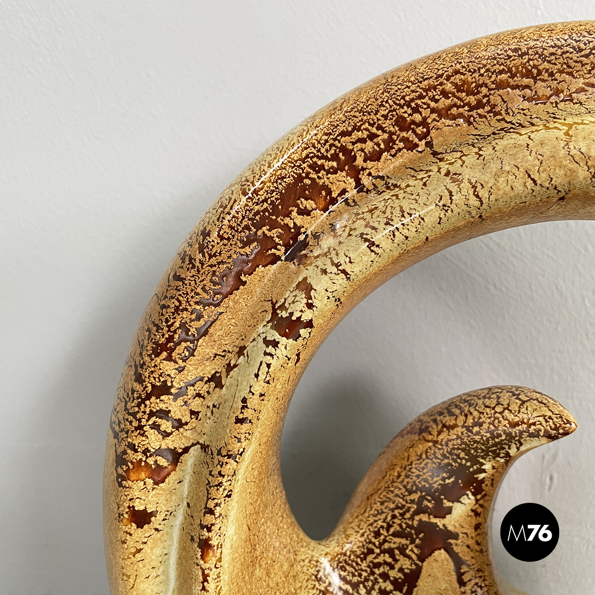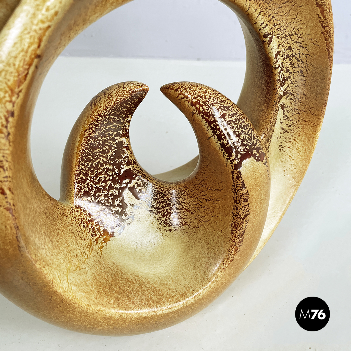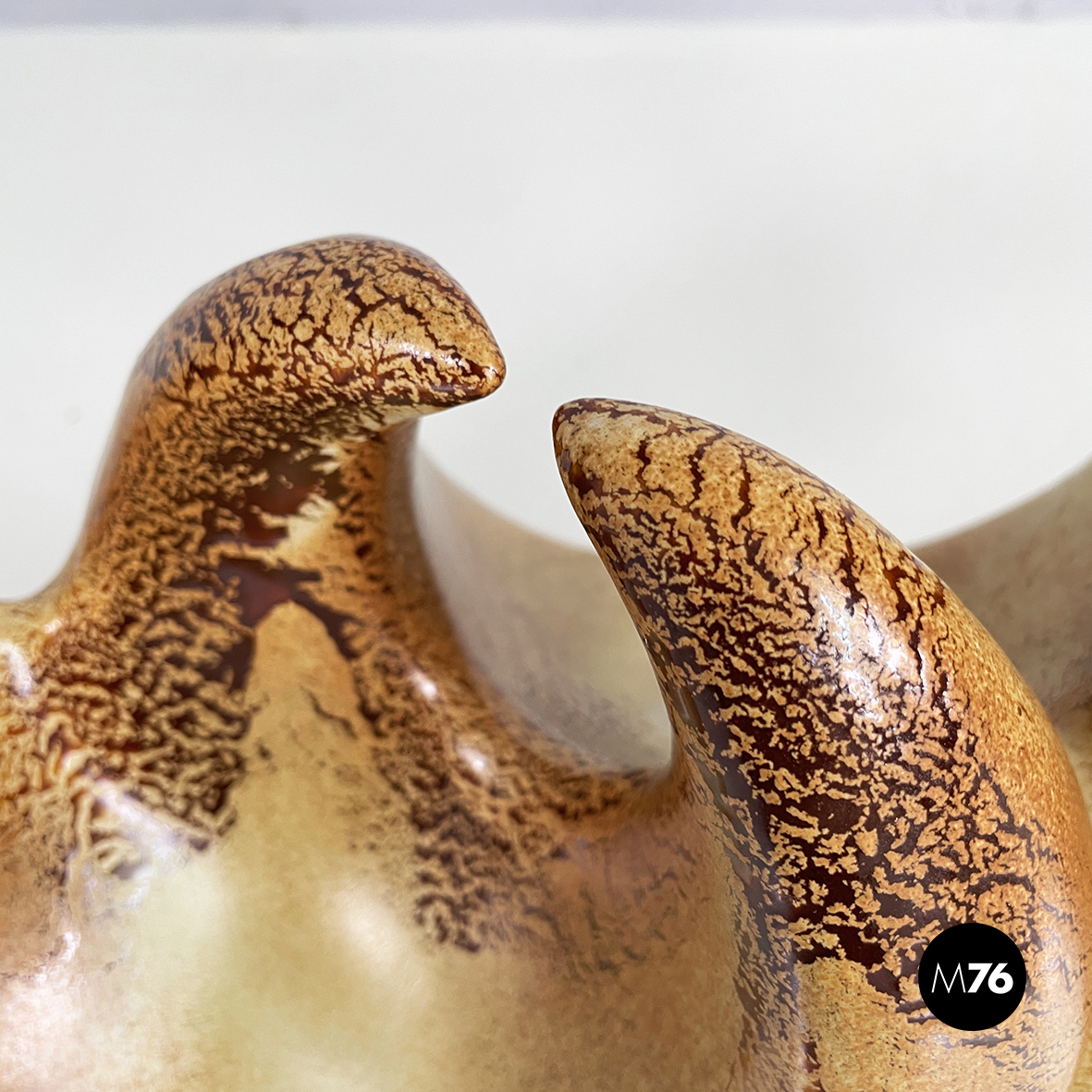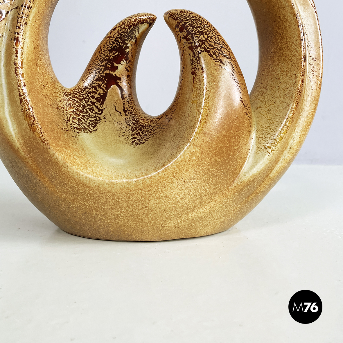 Vaso scultoreo in ceramica dipinta tra i toni del marrone e del beige. Il vaso è composto da forme tonde e organiche. Nella parte superiore presenta il foro tondo.