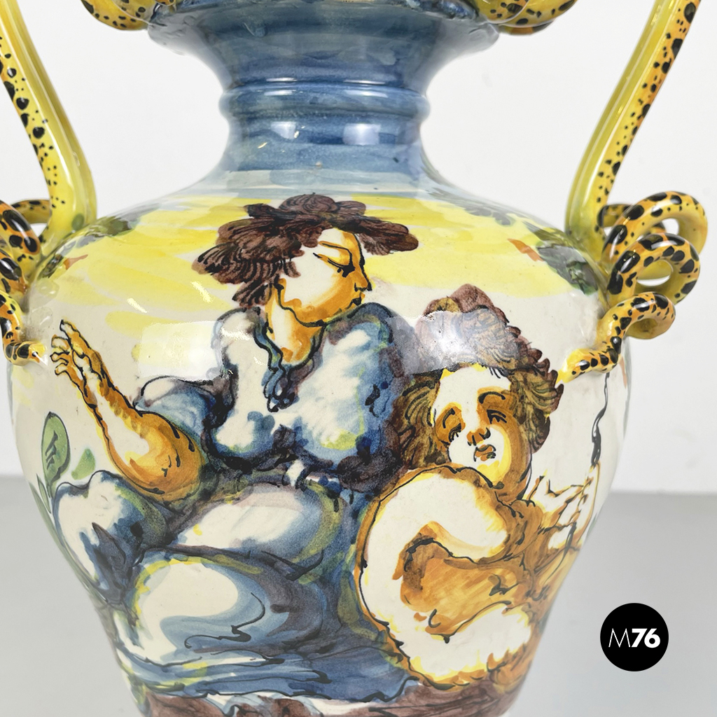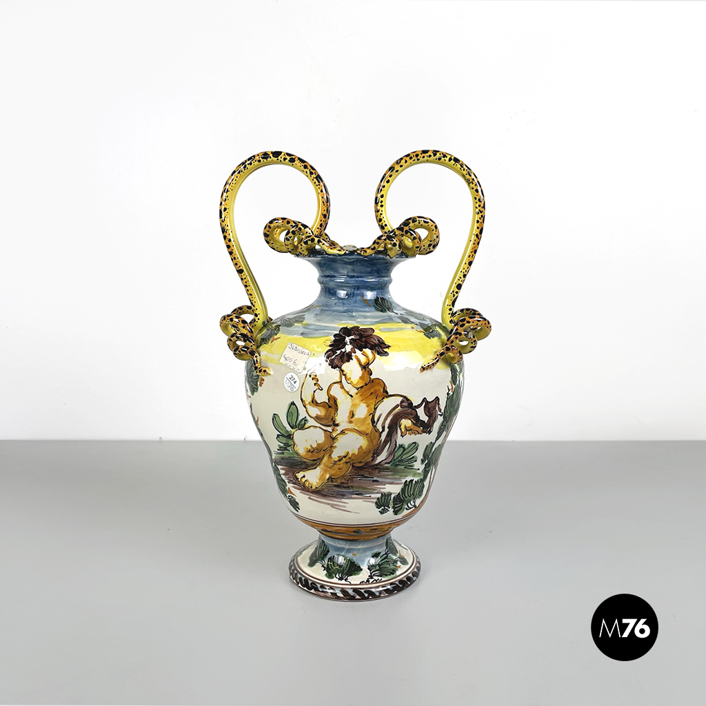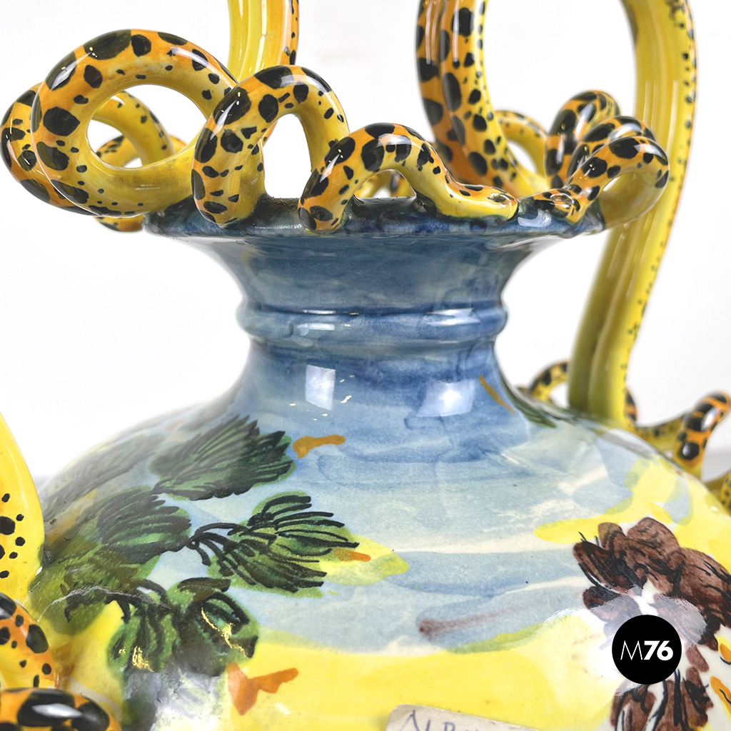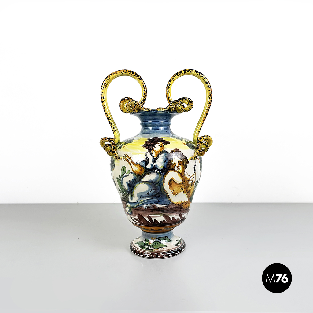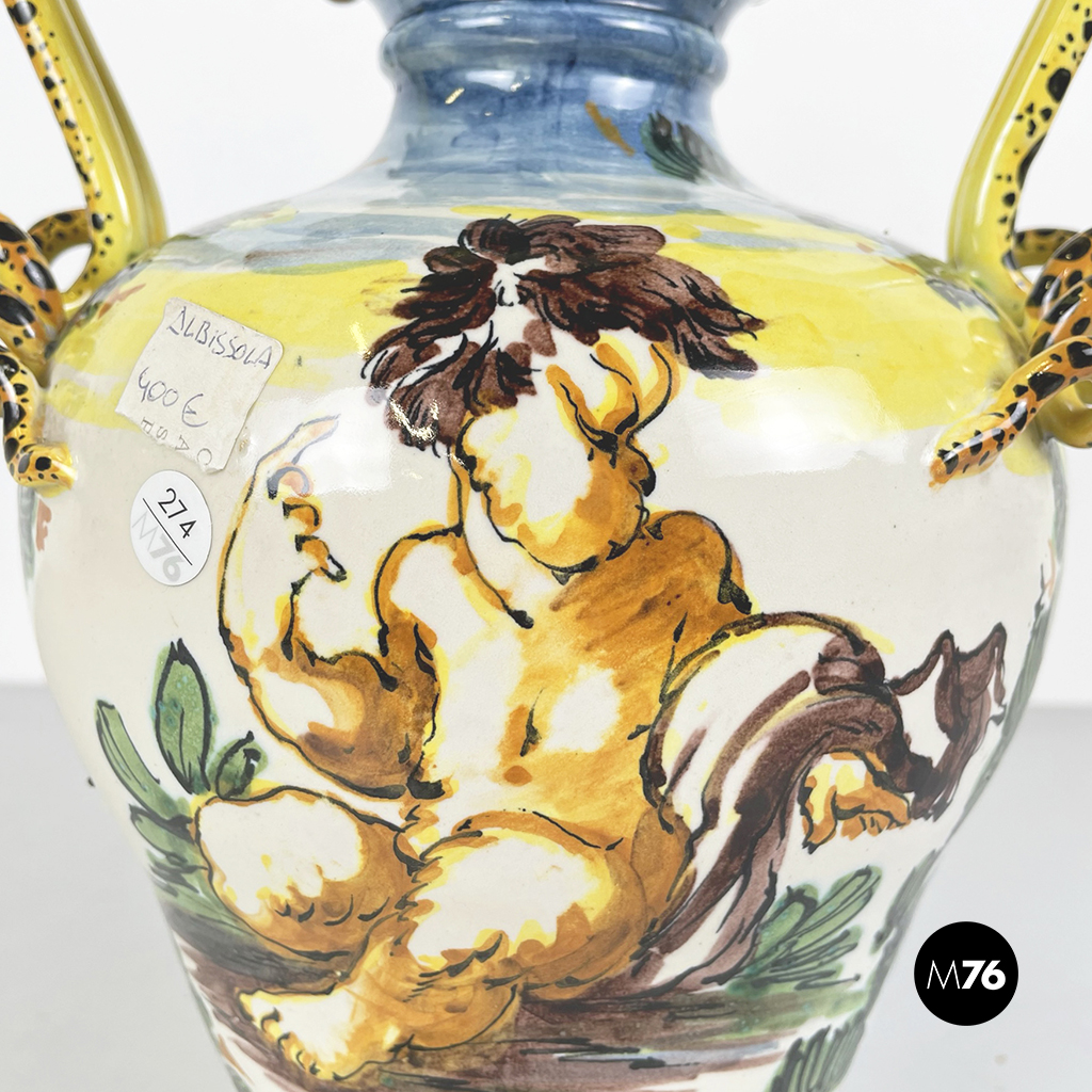 Vaso Albissola completamente artigianale i colori predominanti del vaso sono il verde acqua il marrone e il giallo. Sono raffigurati una donna e un bambino nudo. I manici di questo splendido vaso lo rendono davvero originale e unico. La lavorazione dell’argilla ad Albissola è millenaria e questa tradizione si tramanda fino ad oggi.