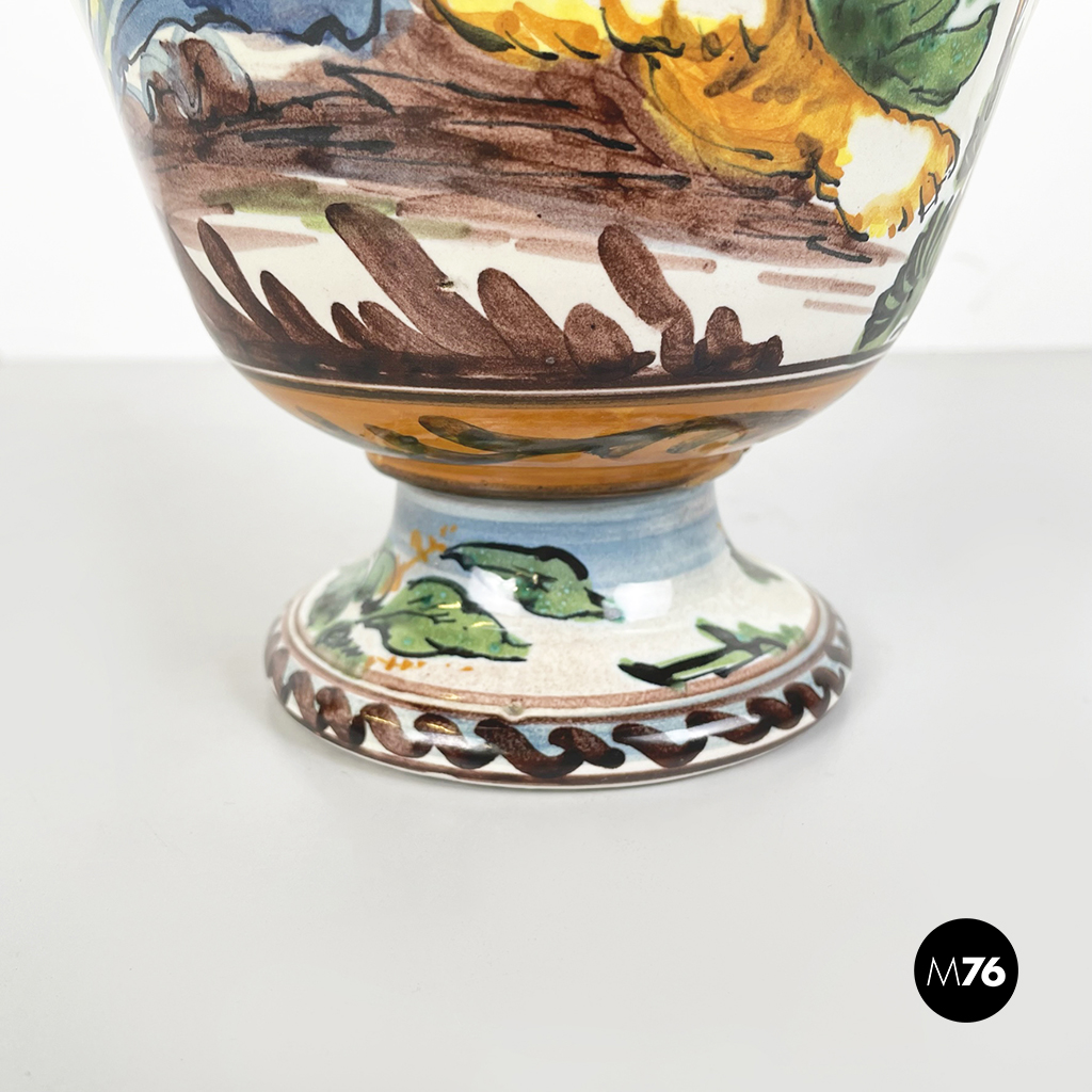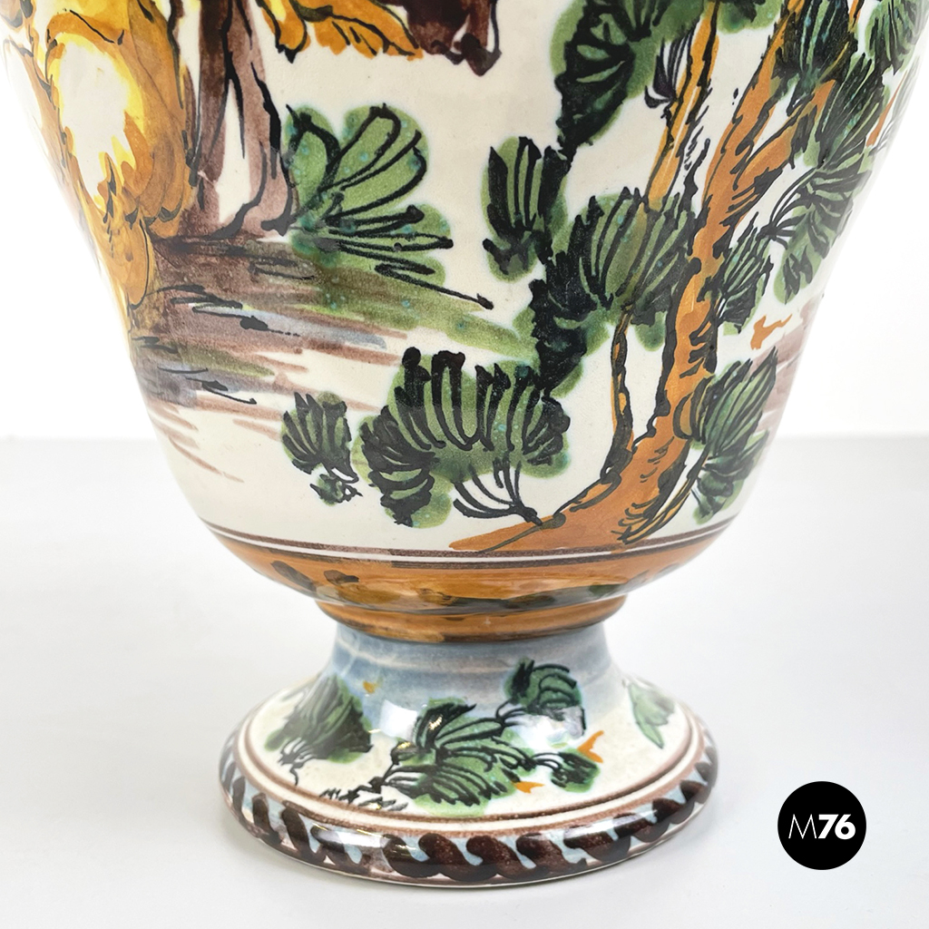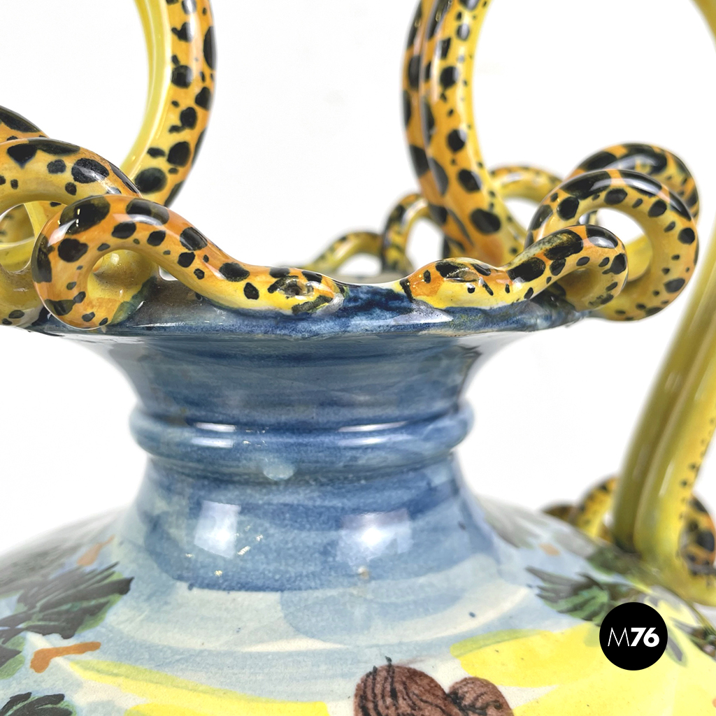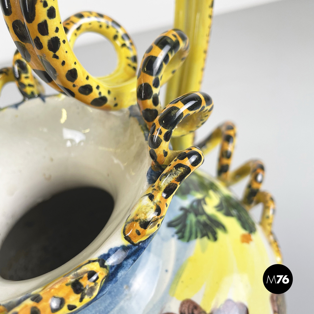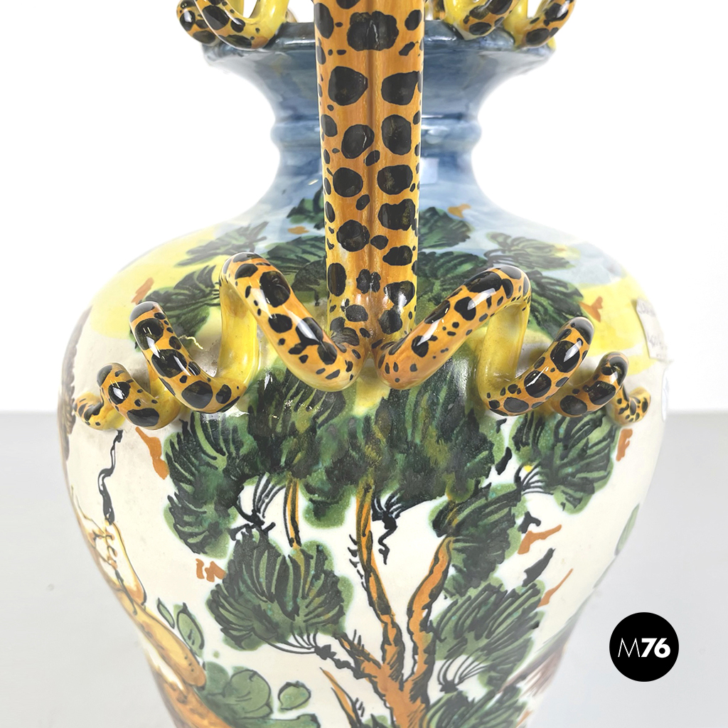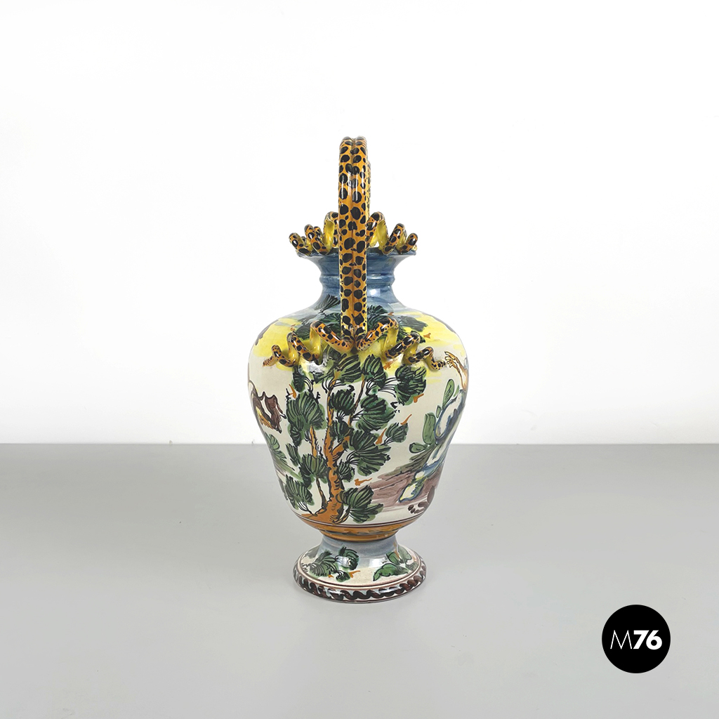 Vaso Albissola completamente artigianale i colori predominanti del vaso sono il verde acqua il marrone e il giallo. Sono raffigurati una donna e un bambino nudo. I manici di questo splendido vaso lo rendono davvero originale e unico. La lavorazione dell’argilla ad Albissola è millenaria e questa tradizione si tramanda fino ad oggi.