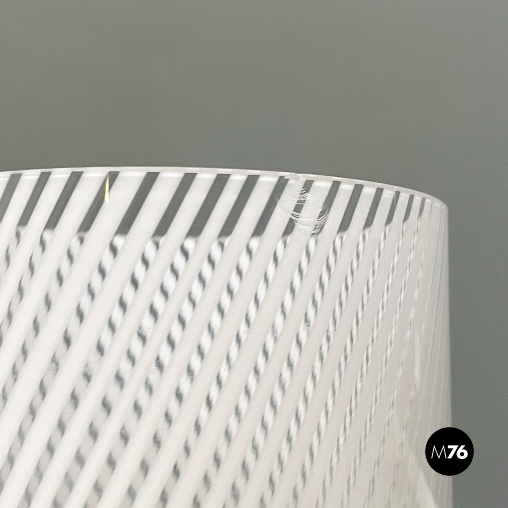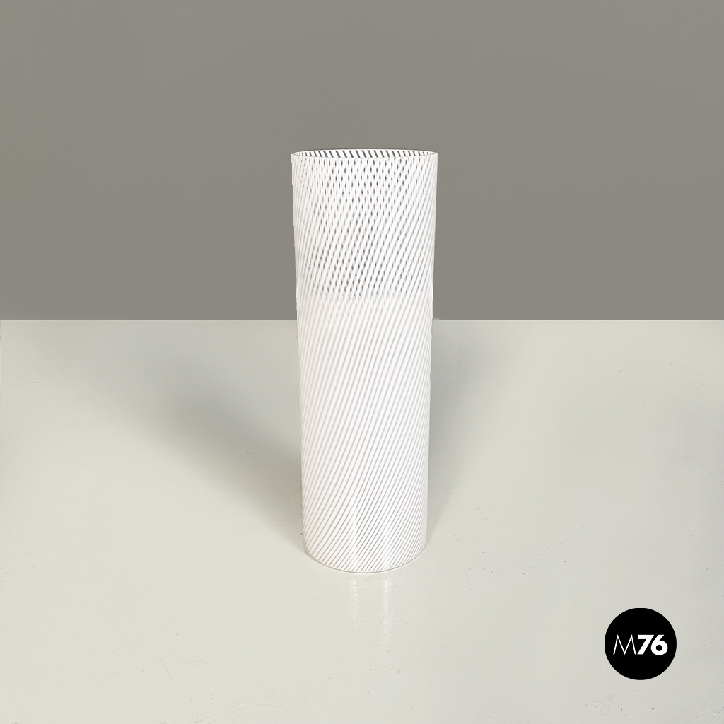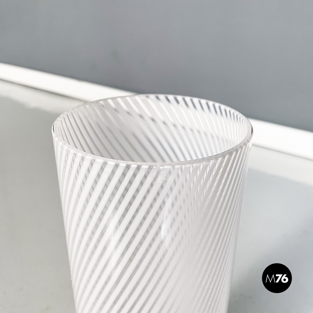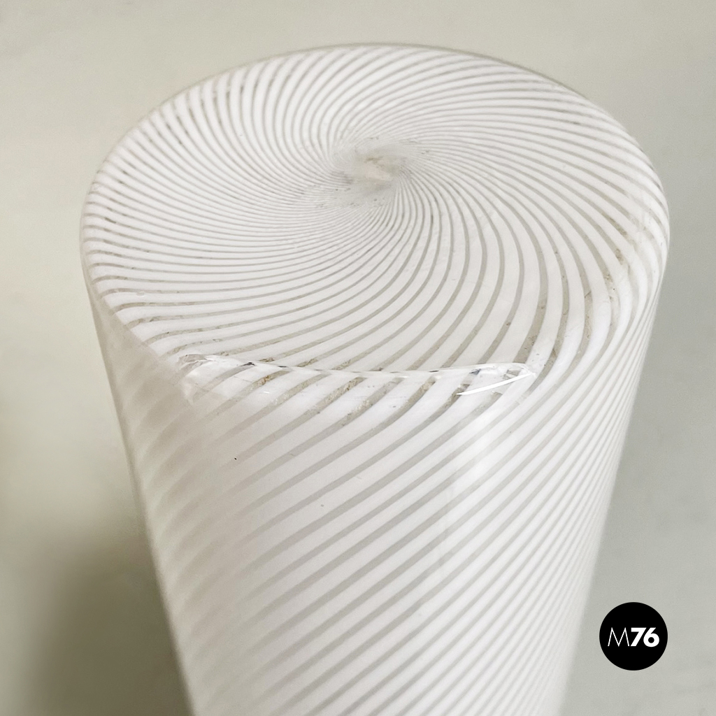 Vaso di forma cilindrica in vetro di Murano bianco e trasparente. I due colori si intrecciano formando una spirale.