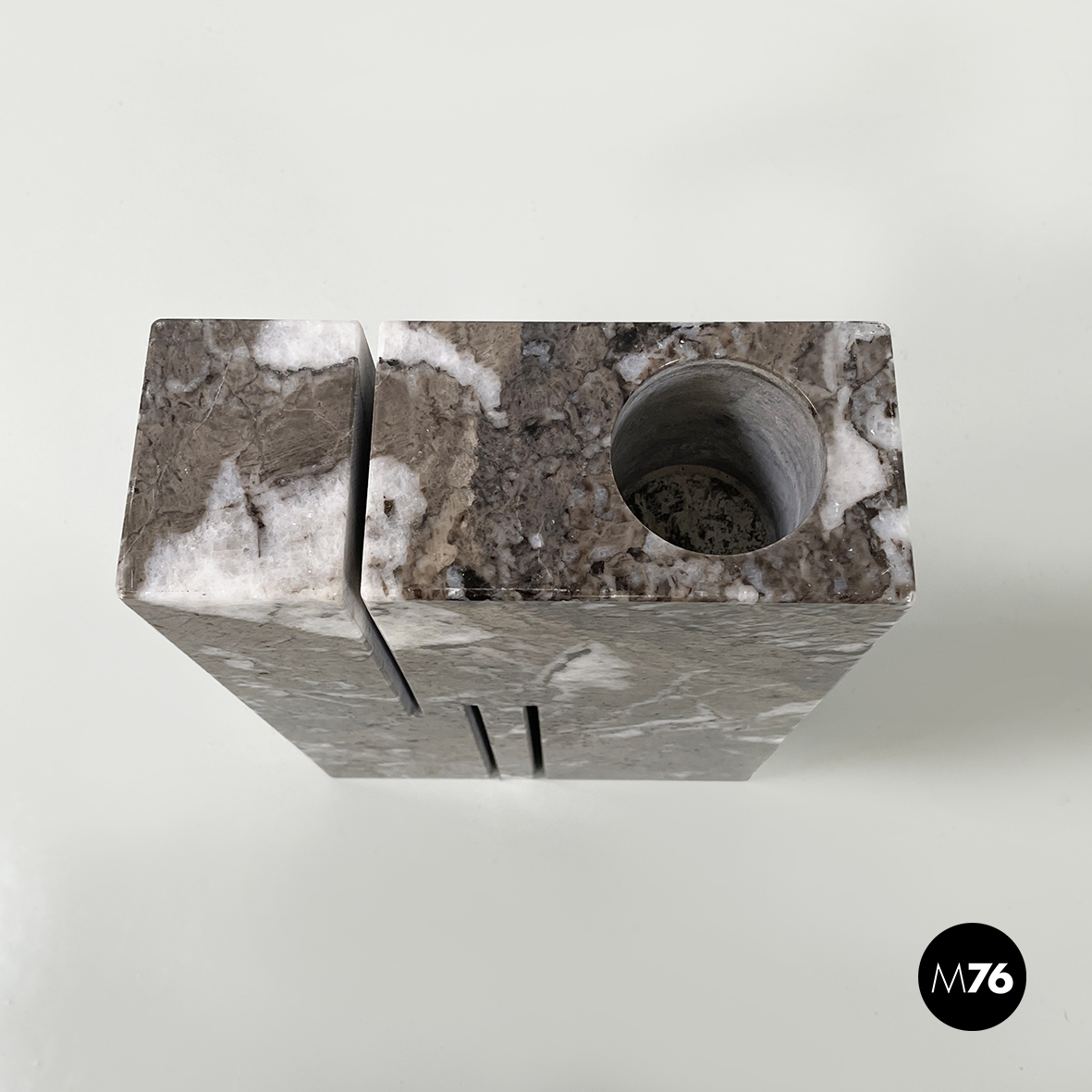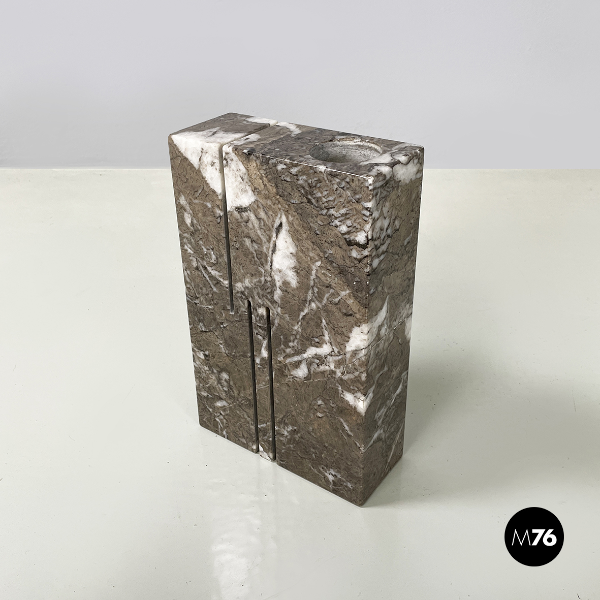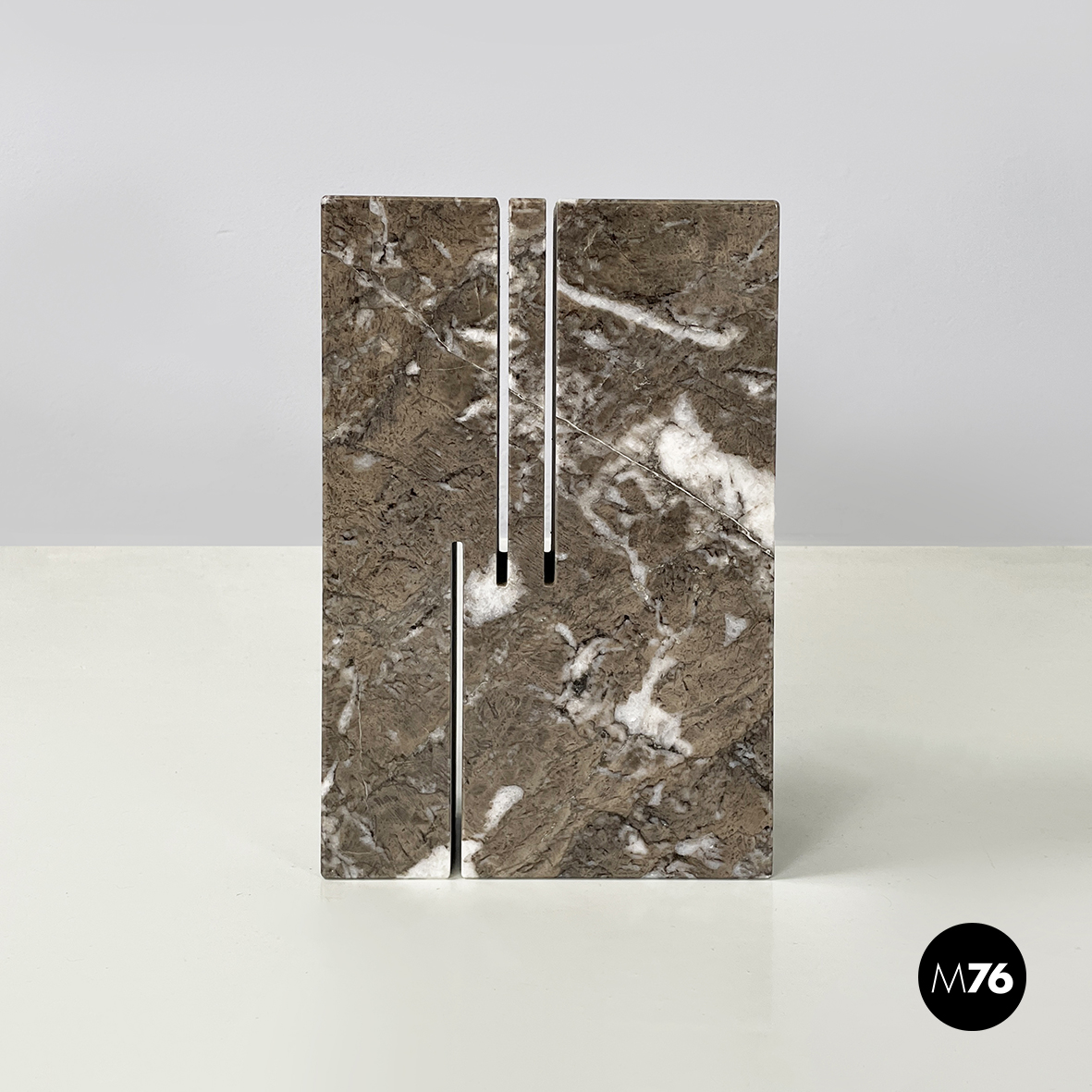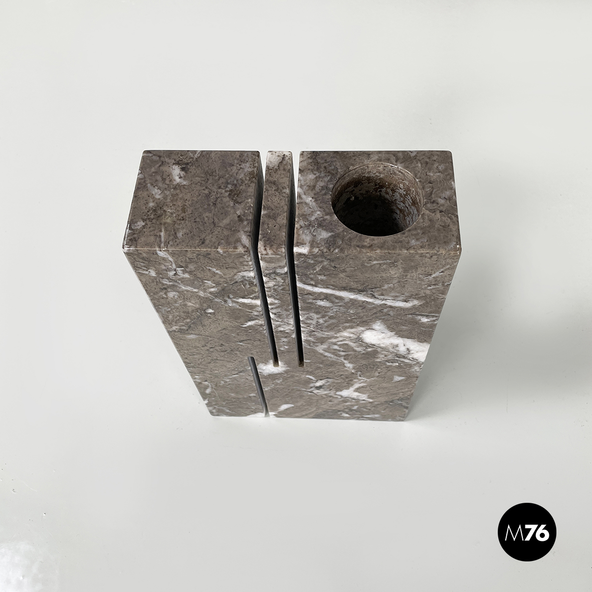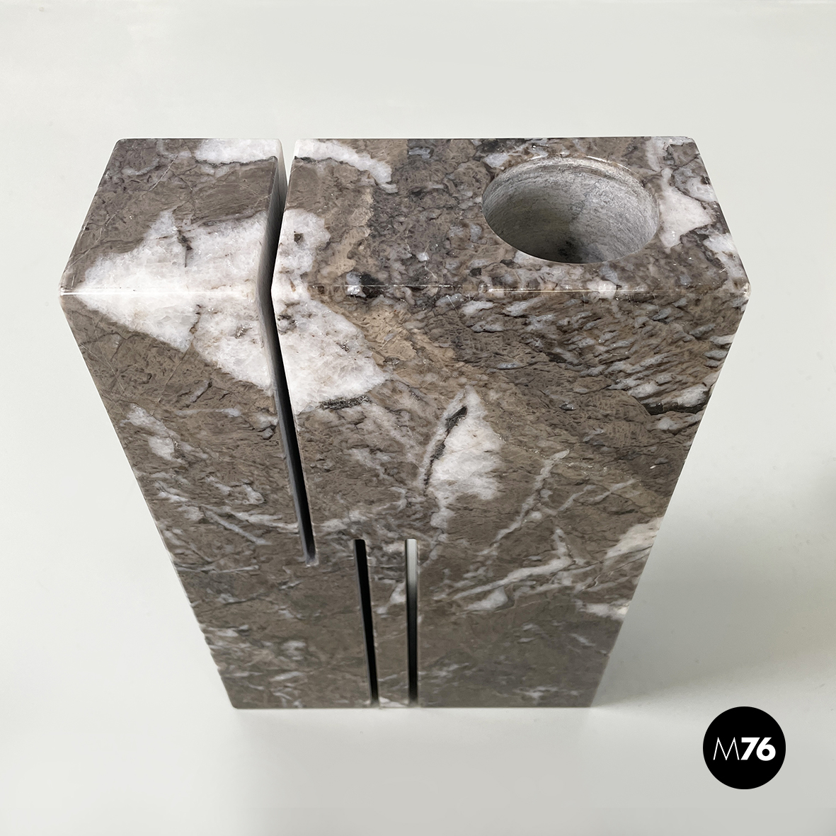 Vaso scultoreo a base rettangolare interamente in marmo grigio. Su uno dei due lati corti presenta un foro tondo e due scanalature decorative mentre sul lato opposto un foro e una scanalatura decorativa. Utilizzabile come scultura o oggetto di arredamento.
