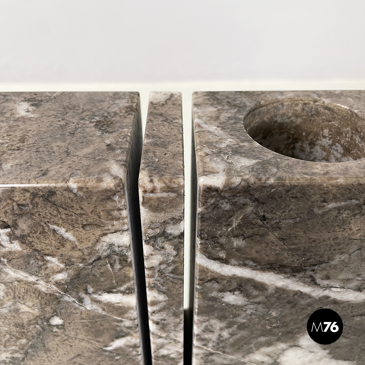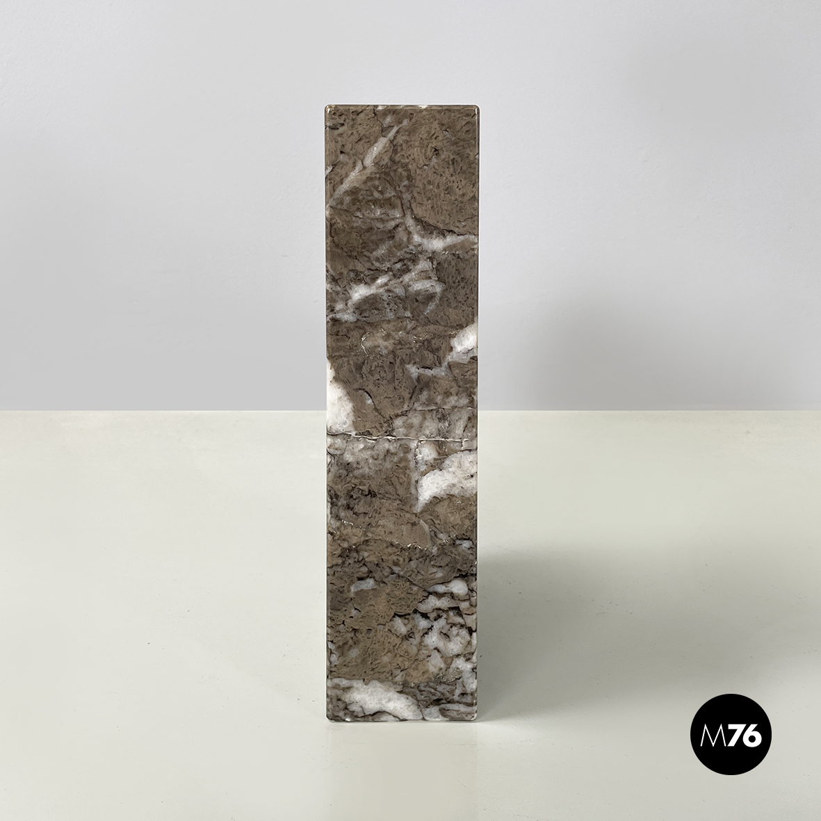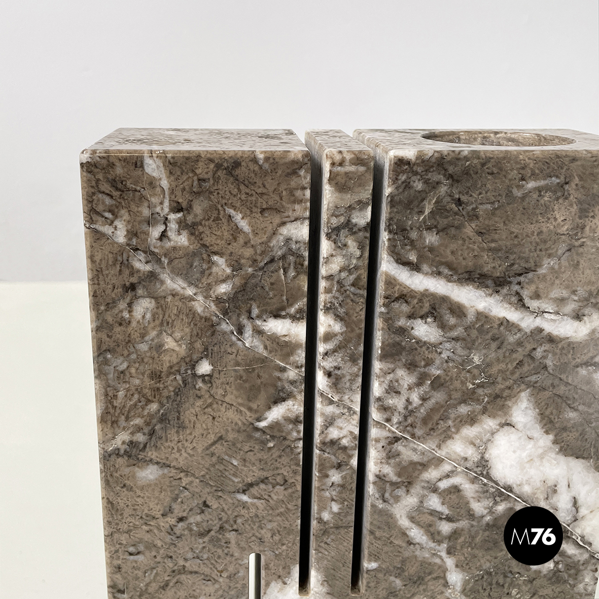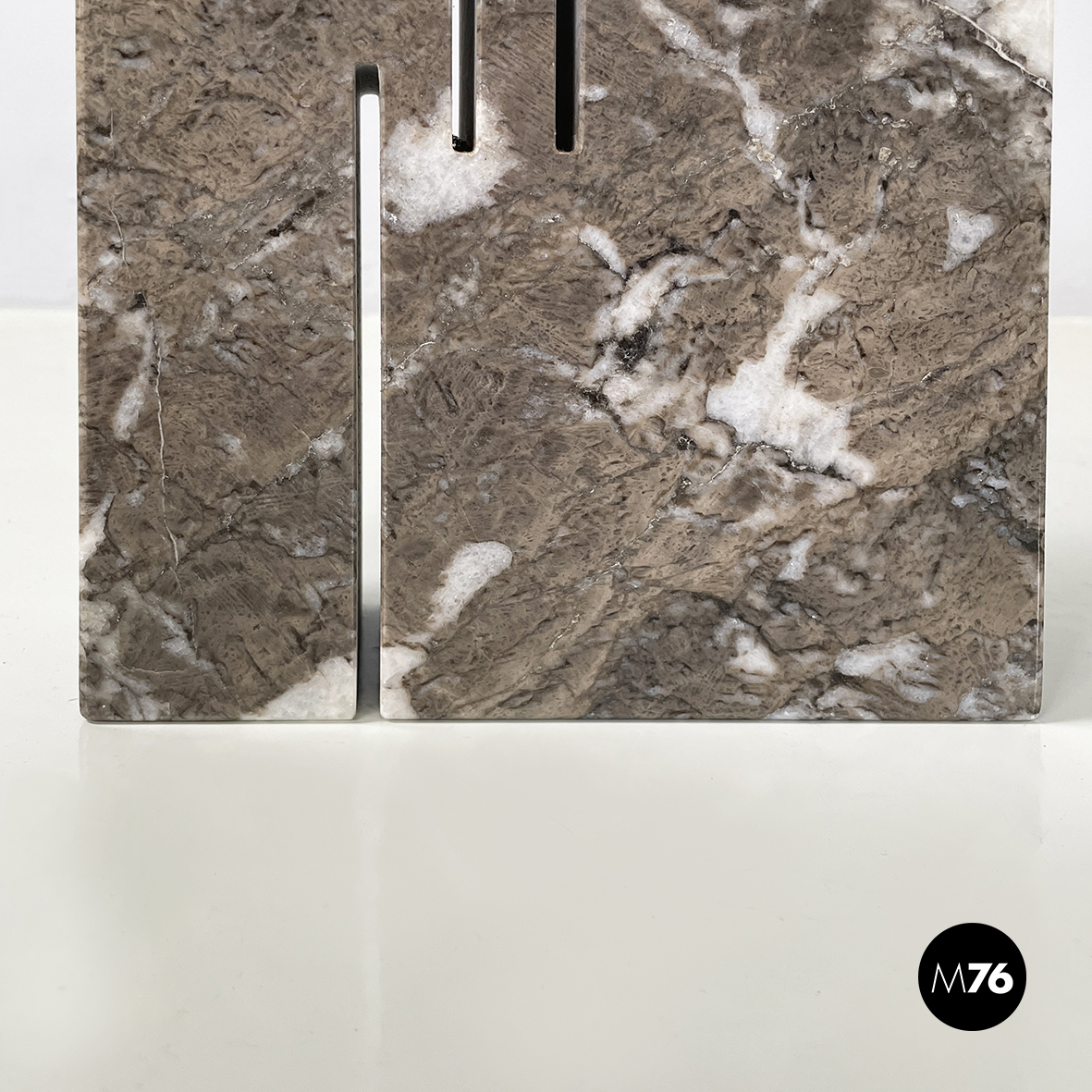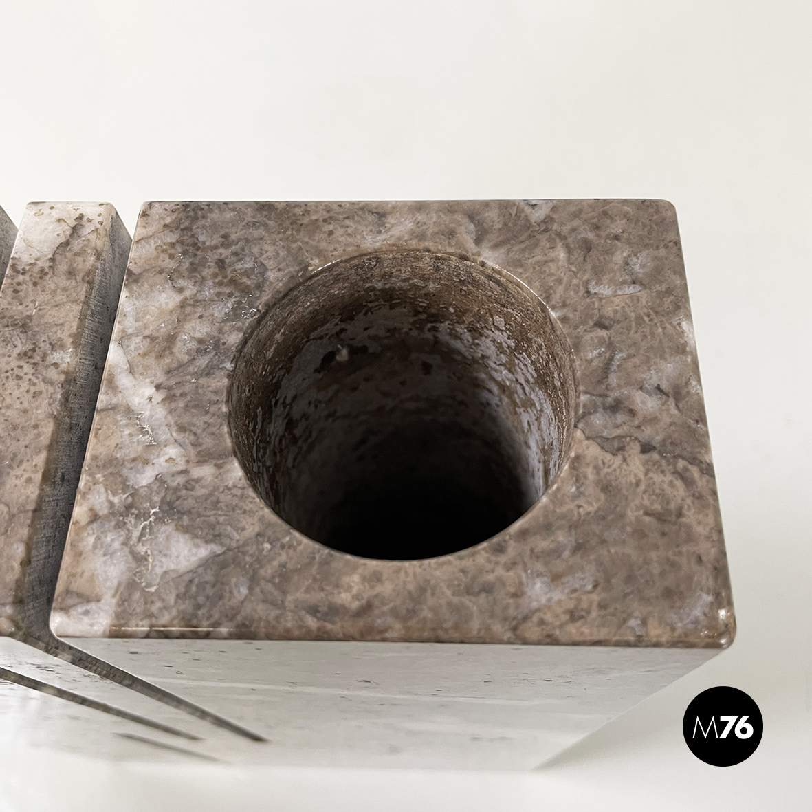 Vaso scultoreo a base rettangolare interamente in marmo grigio. Su uno dei due lati corti presenta un foro tondo e due scanalature decorative mentre sul lato opposto un foro e una scanalatura decorativa. Utilizzabile come scultura o oggetto di arredamento.