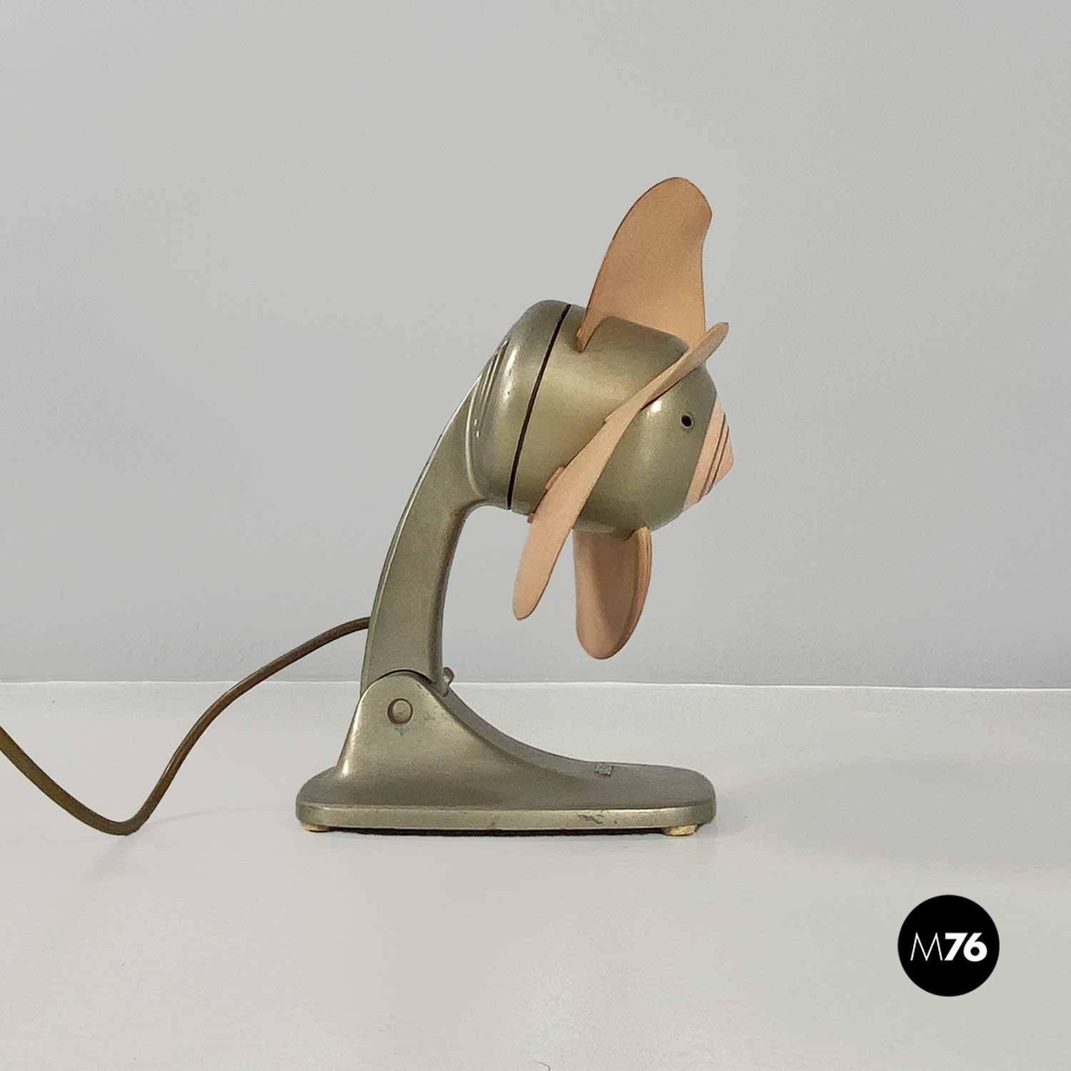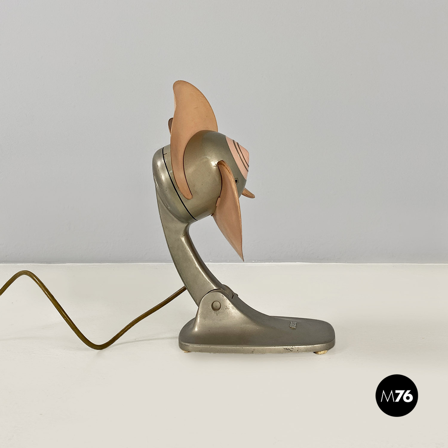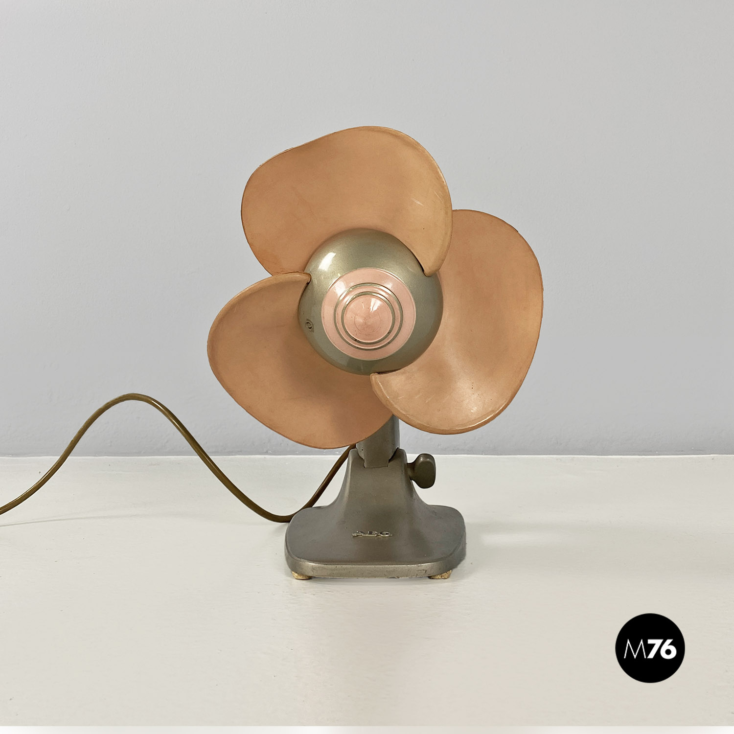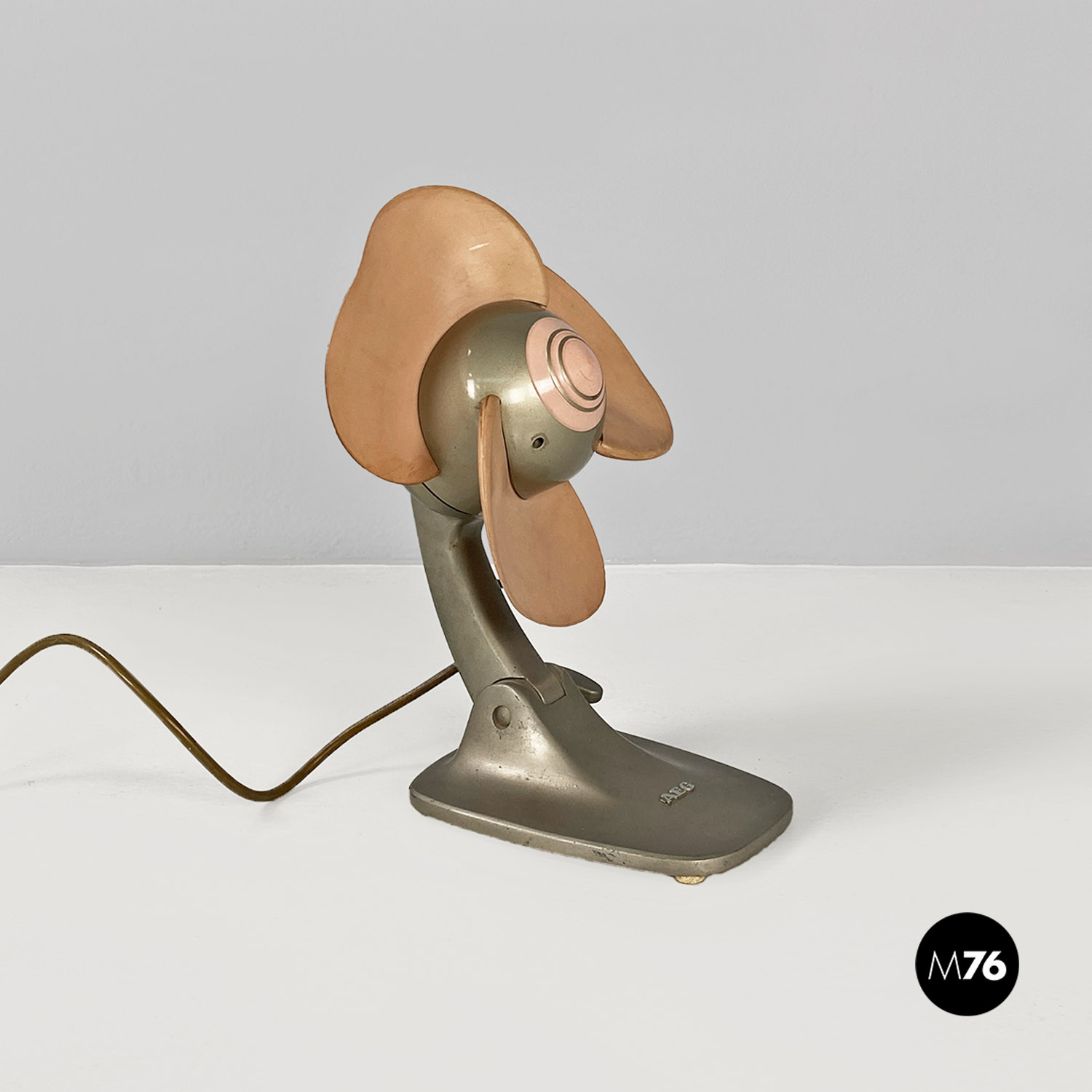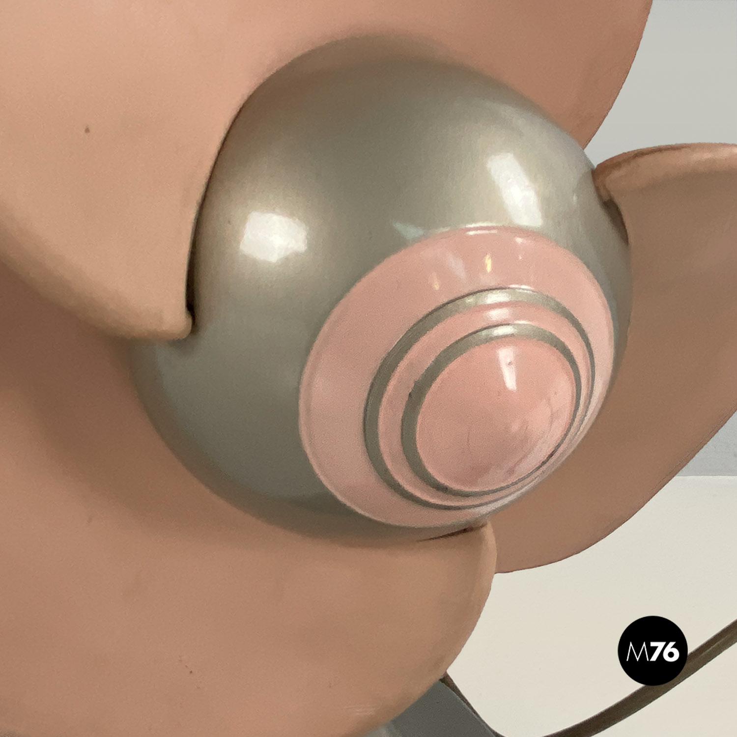 Apparecchio per ventilazione domestica o da ufficio da tavolo con pale in gomma rosa e base in metallo.