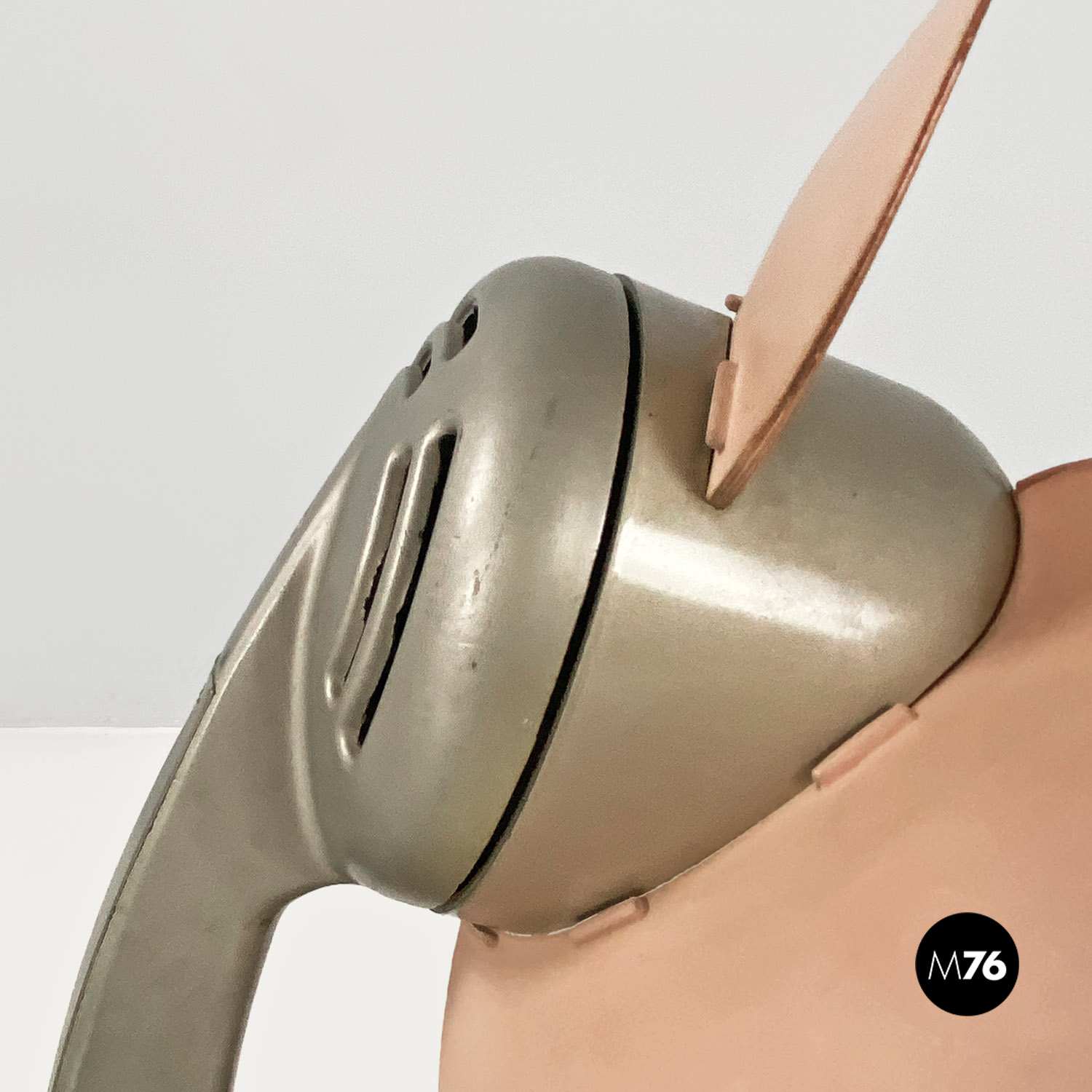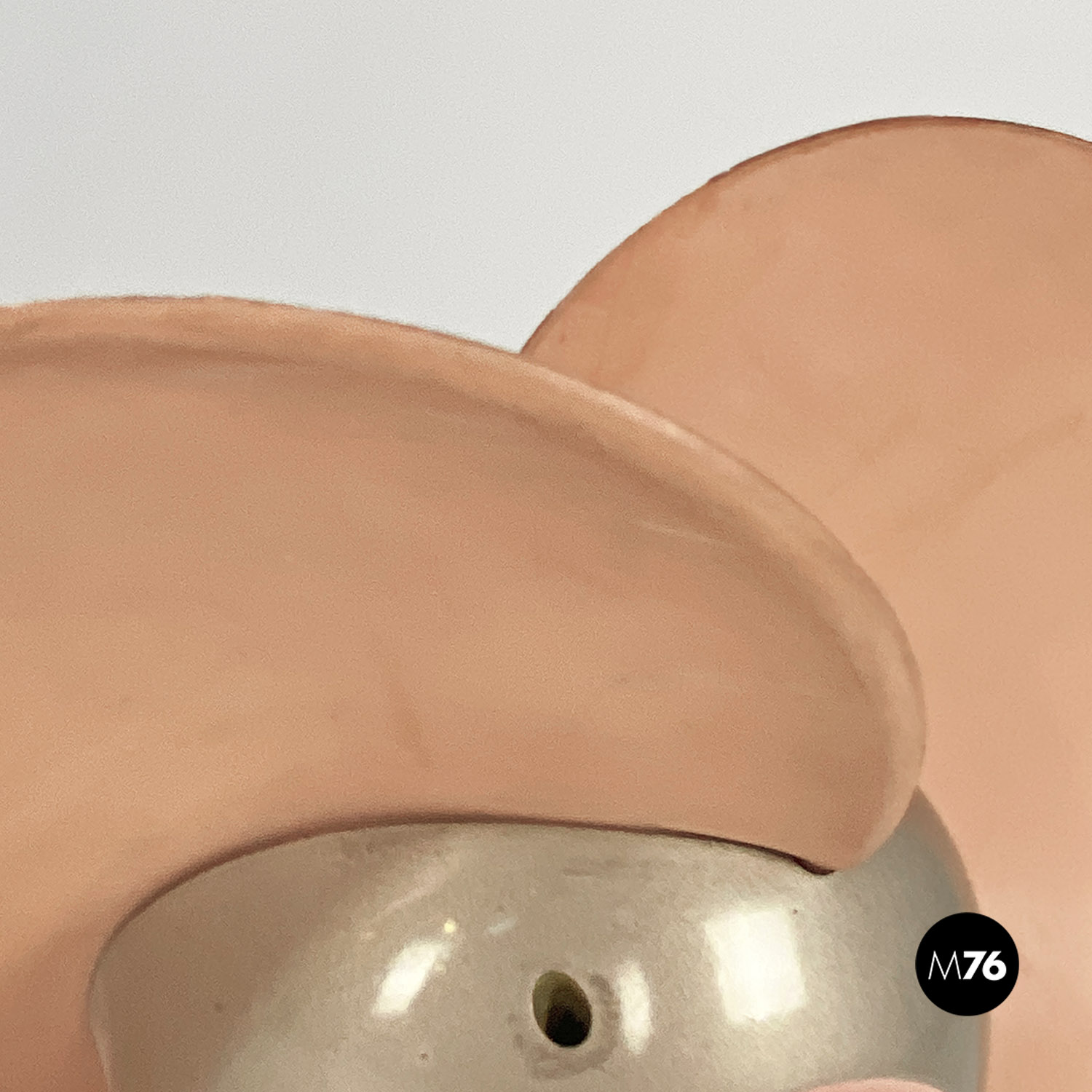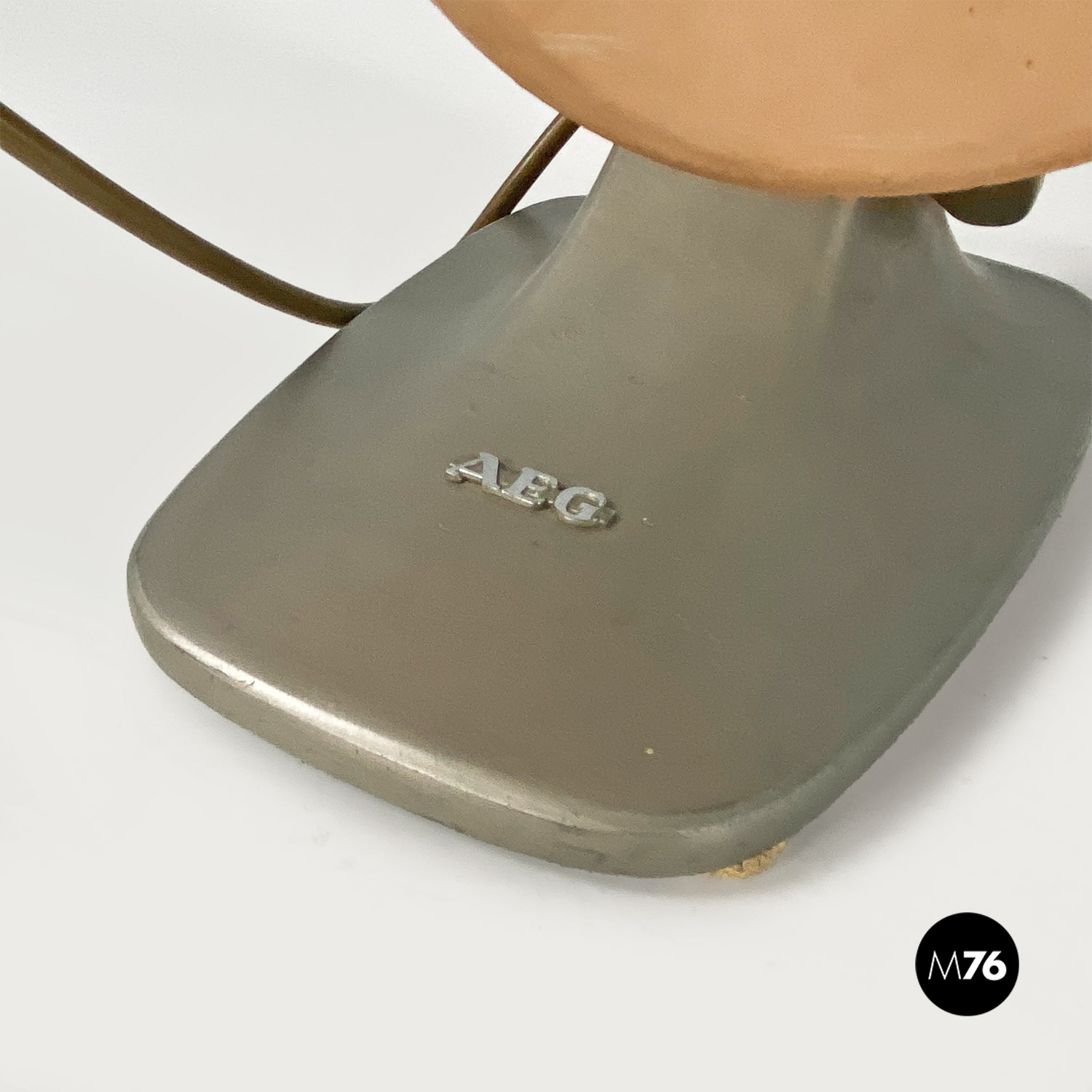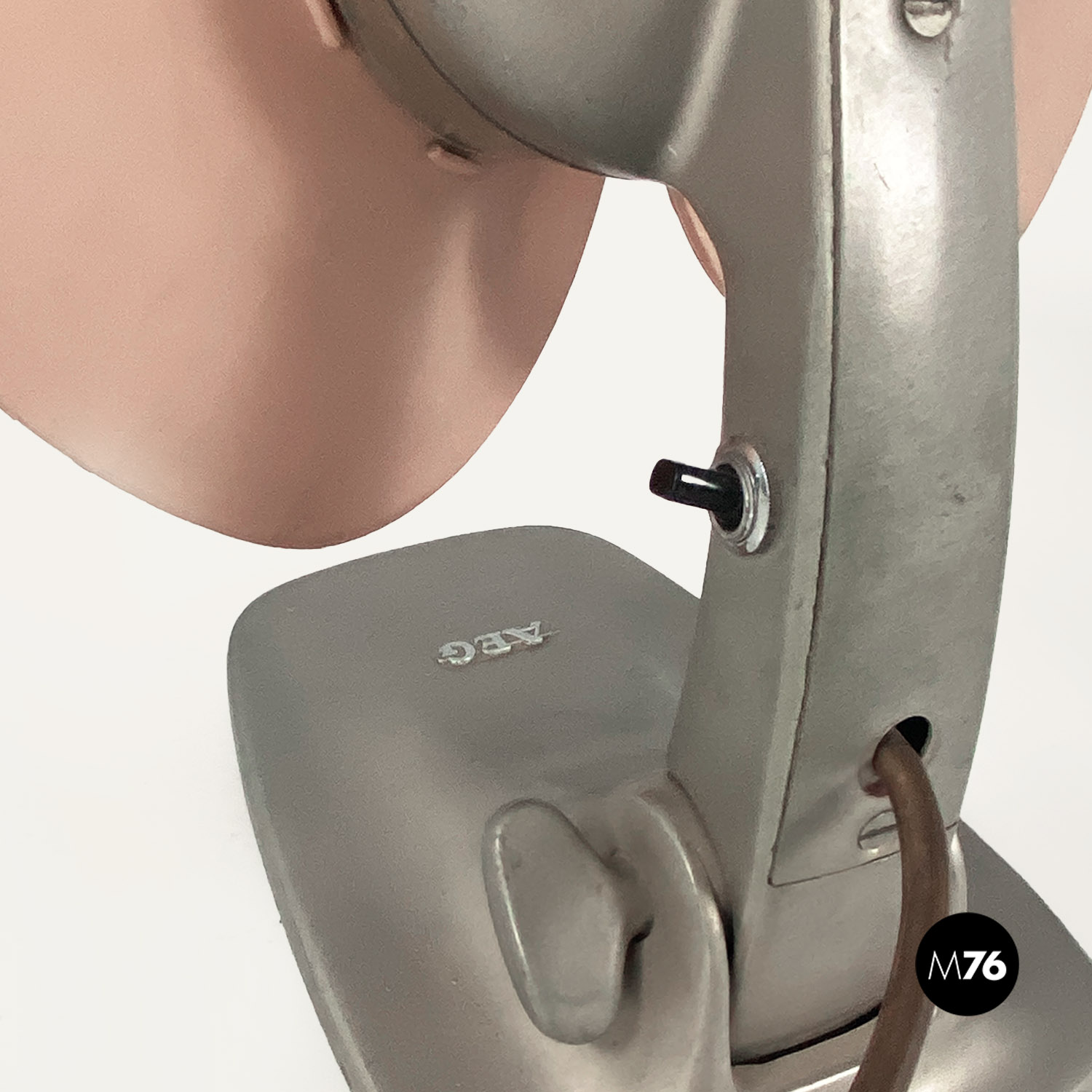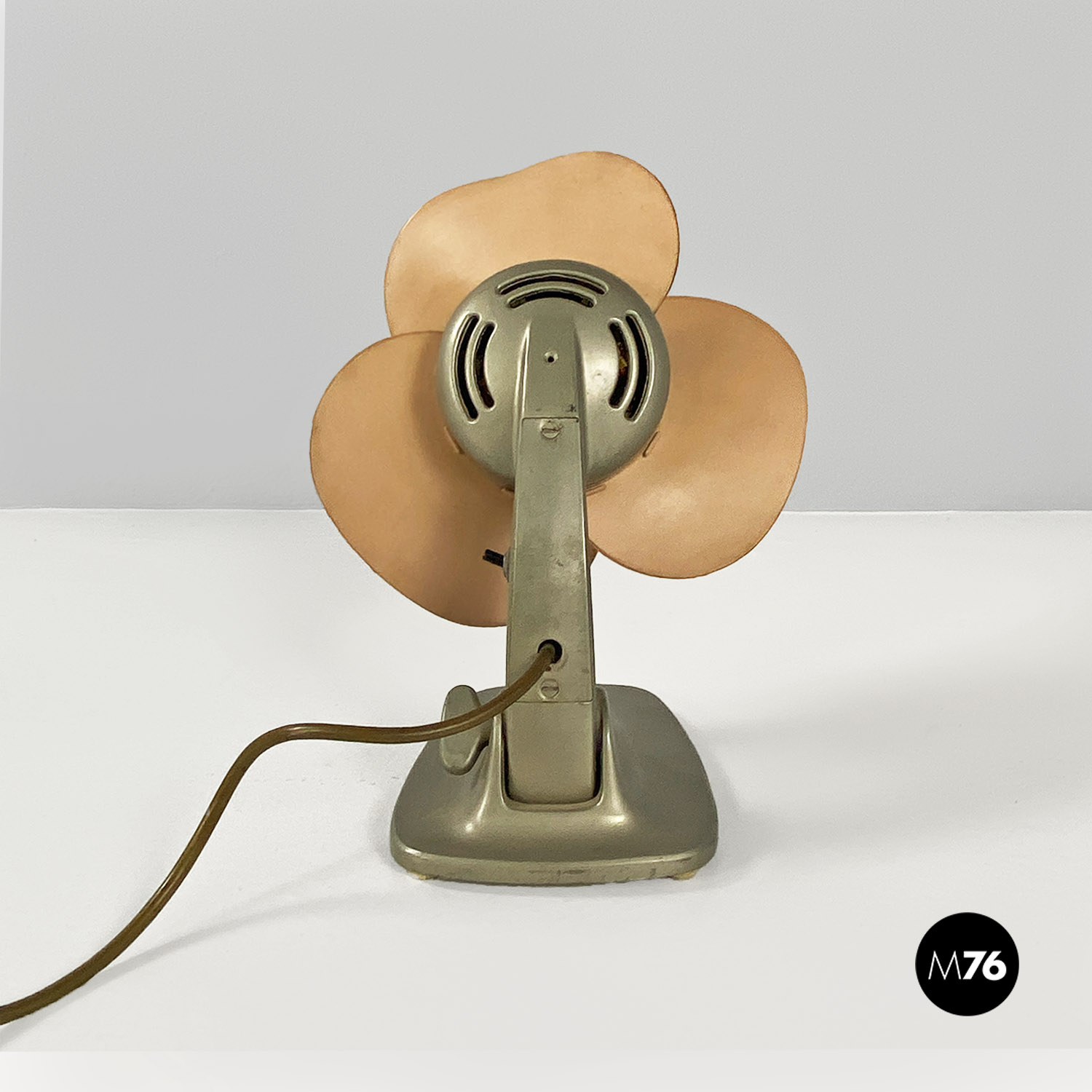 Apparecchio per ventilazione domestica o da ufficio da tavolo con pale in gomma rosa e base in metallo.