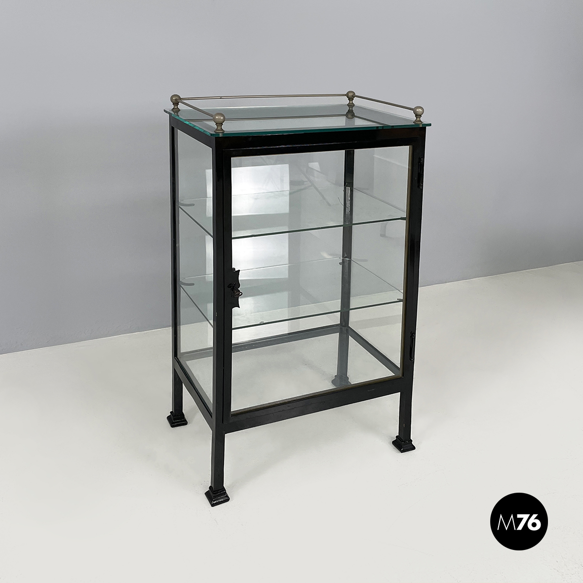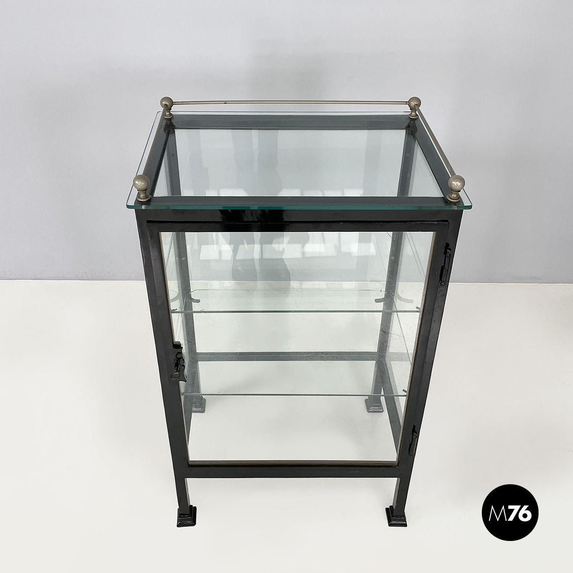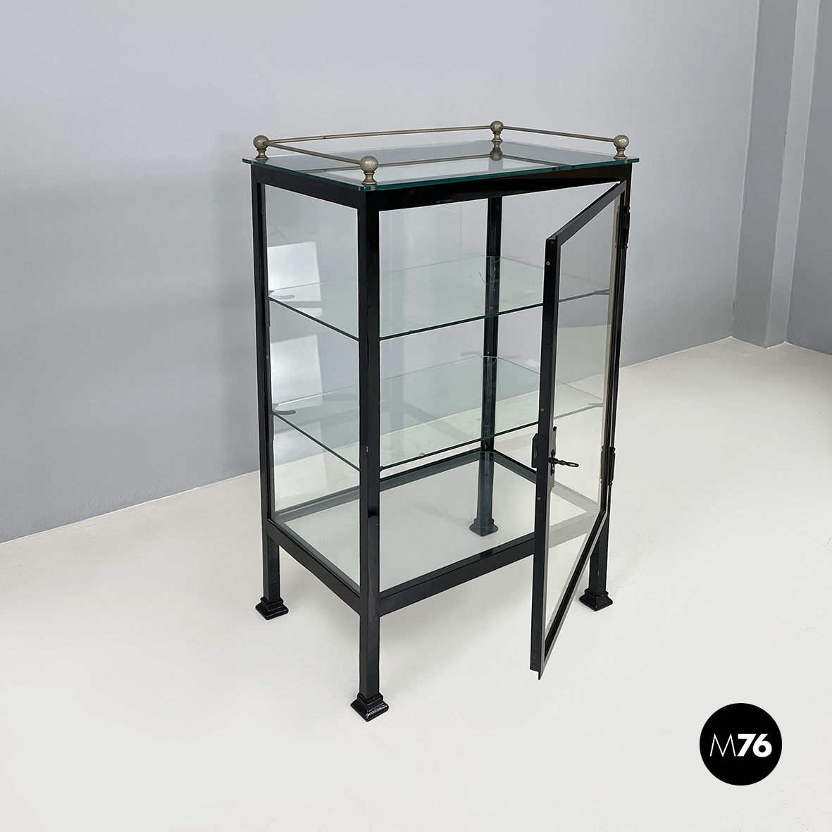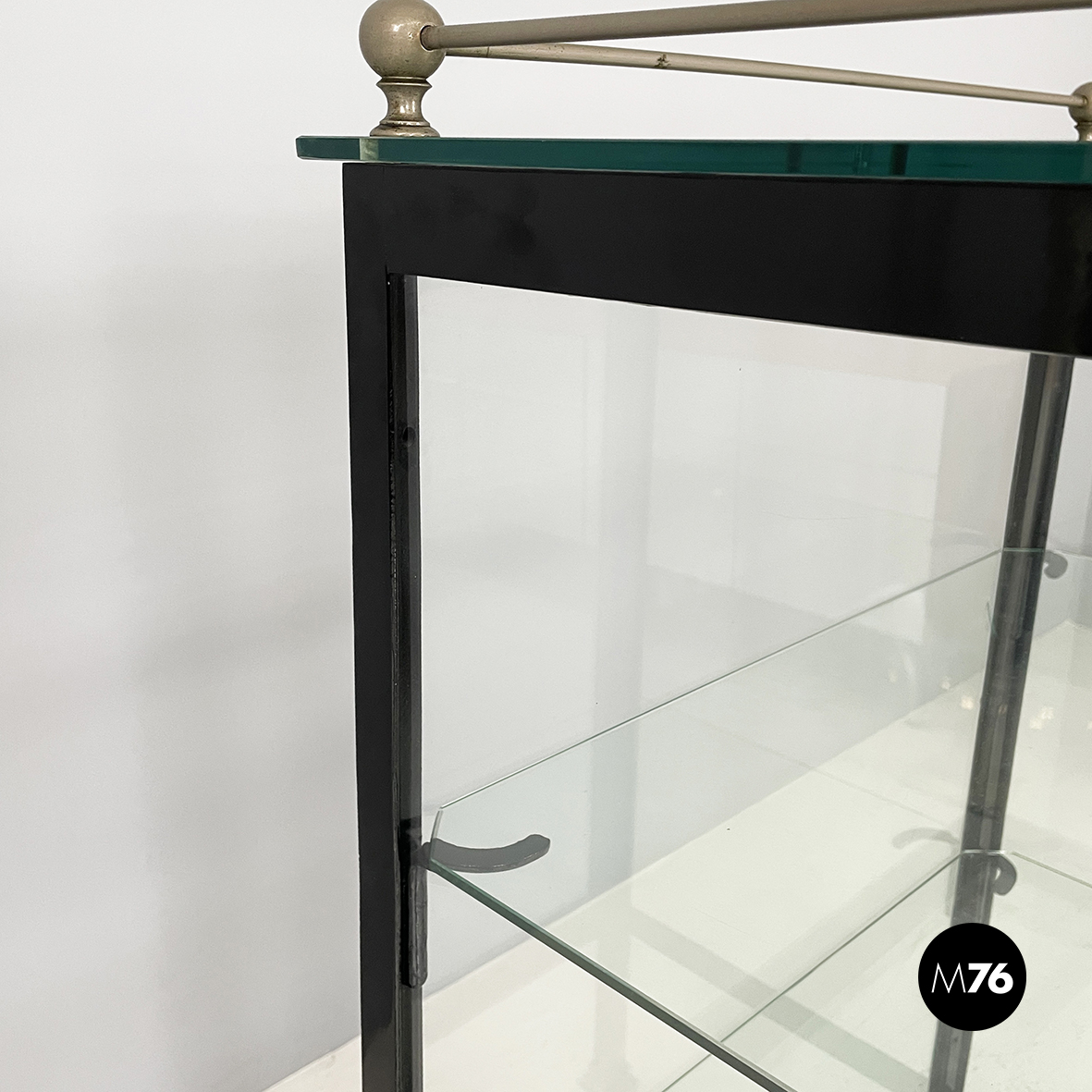 Vetrina espositiva a base rettangolare in metallo verniciato nero e vetro. Il telaio è in listelli di metallo verniciato nero mentre i vari lati sono in vetro trasparente. Ai quattro angoli della parte superiore sono posizionate quattro sfere decorative in metallo unite da un tondino di metallo. All’interno sono presenti due mensole in vetro spesso poggiate su piccole parti metalliche nere. Sul fronte dell’espositore è presente una serratura con relativa chiave. Zampe a sezione quadrata finemente lavorate in metallo verniciato nero. Utilizzabile anche come piccolo armadio o credenza.