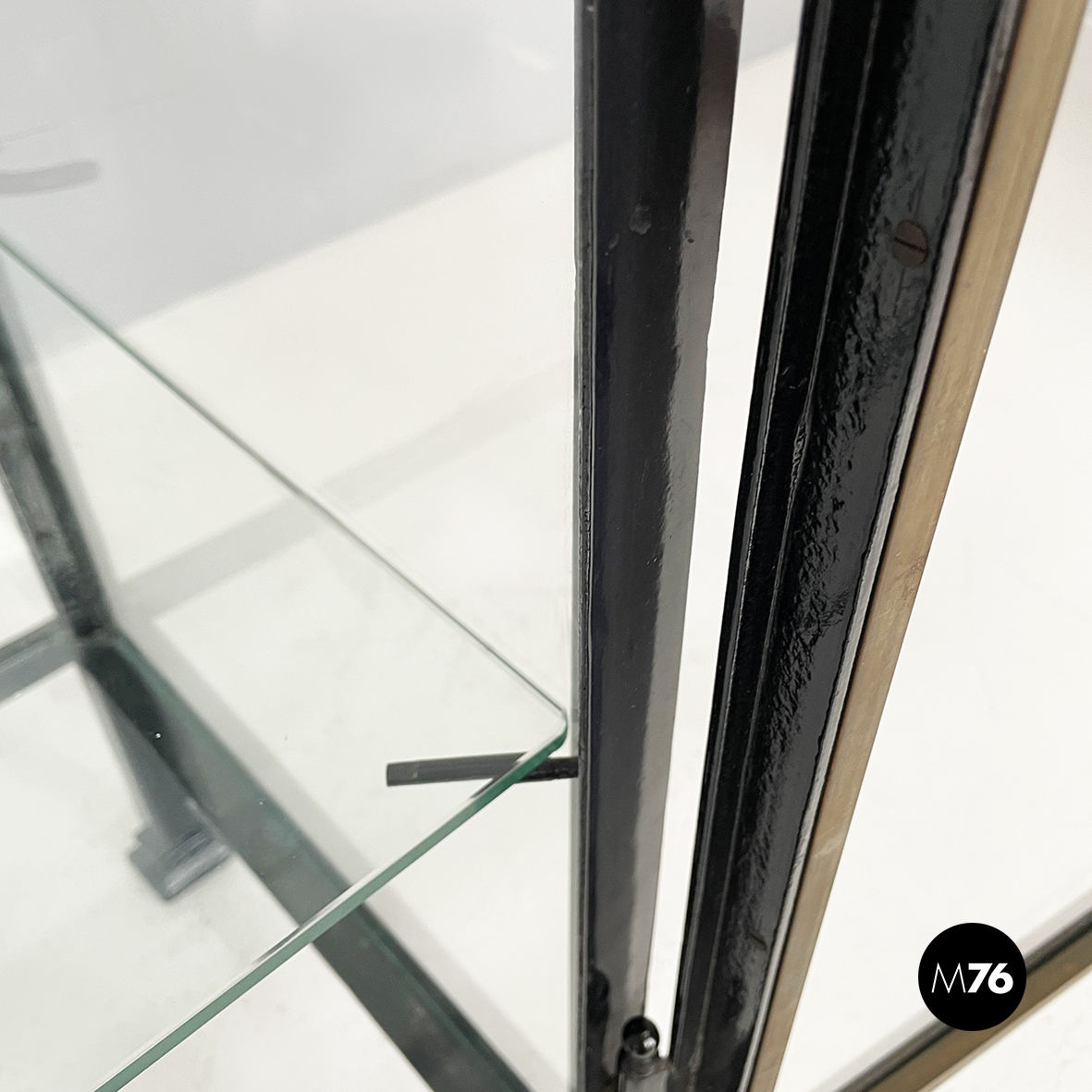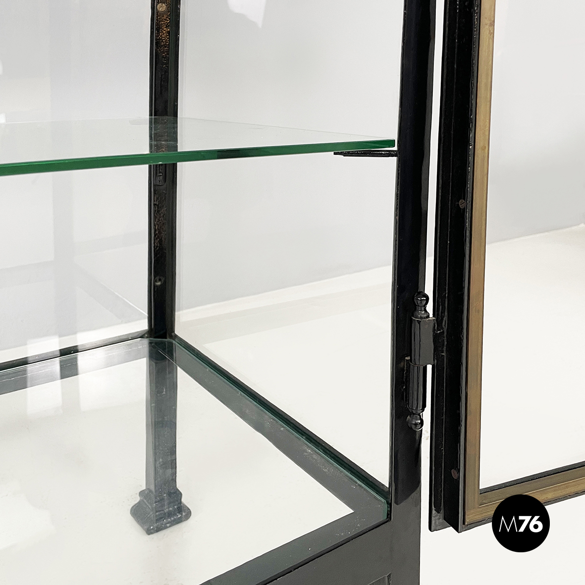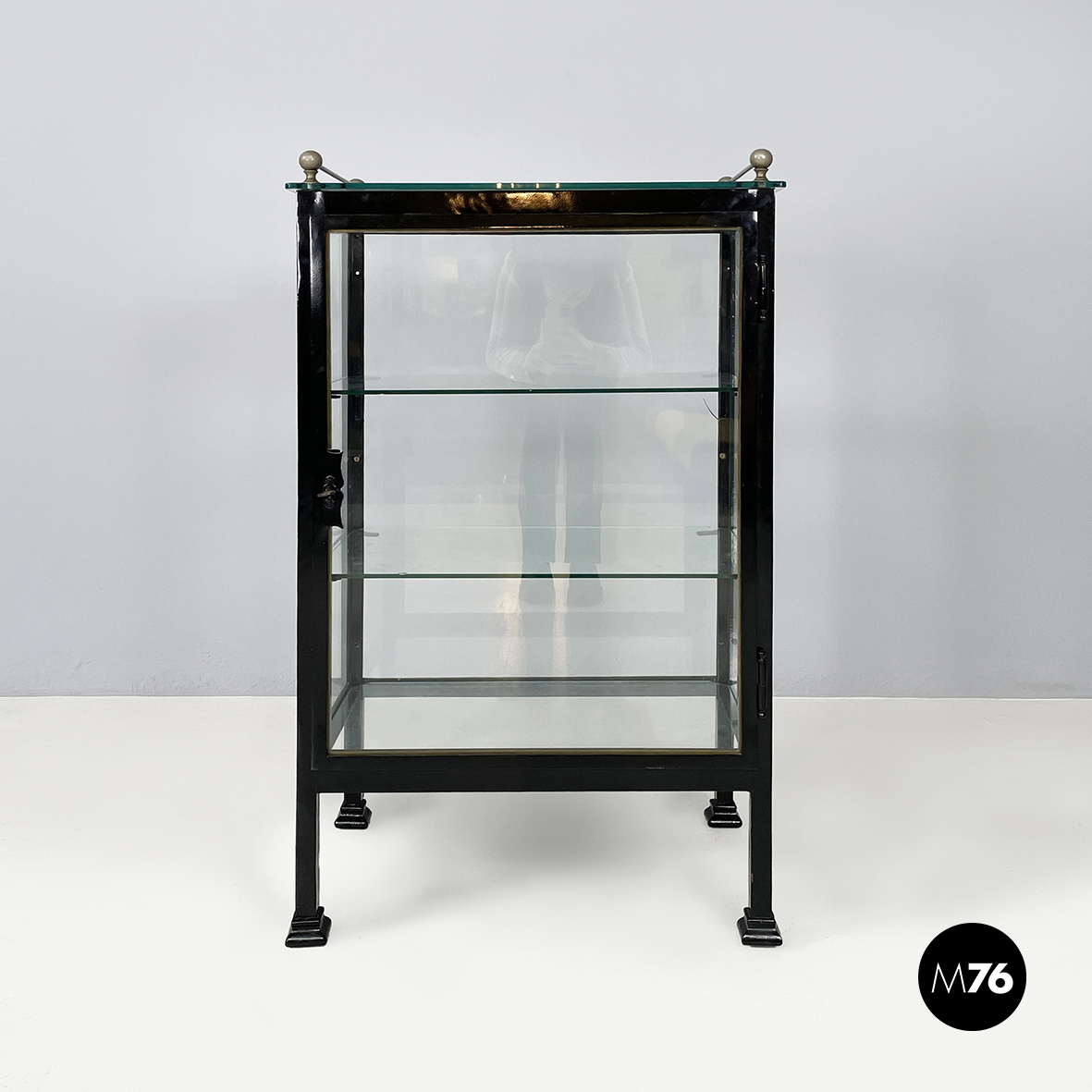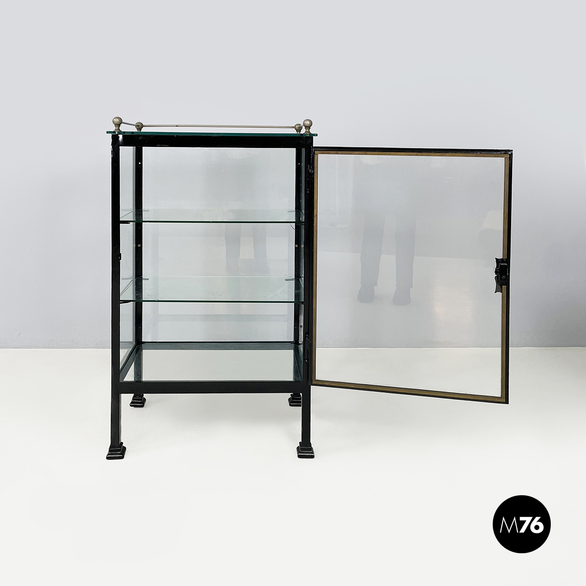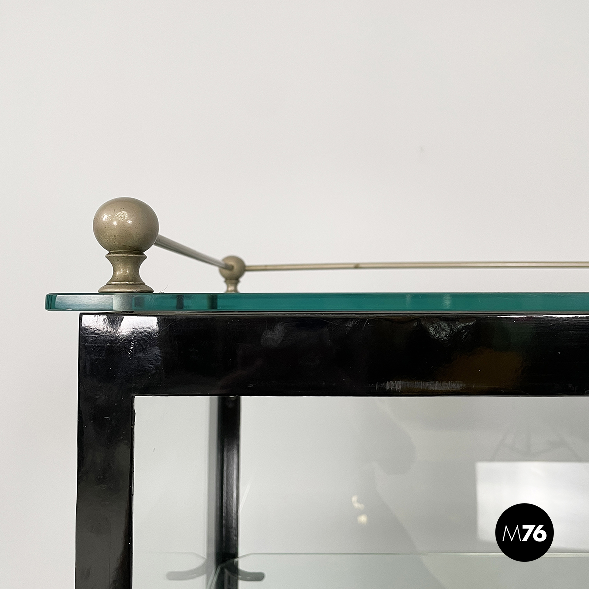 Vetrina espositiva a base rettangolare in metallo verniciato nero e vetro. Il telaio è in listelli di metallo verniciato nero mentre i vari lati sono in vetro trasparente. Ai quattro angoli della parte superiore sono posizionate quattro sfere decorative in metallo unite da un tondino di metallo. All’interno sono presenti due mensole in vetro spesso poggiate su piccole parti metalliche nere. Sul fronte dell’espositore è presente una serratura con relativa chiave. Zampe a sezione quadrata finemente lavorate in metallo verniciato nero. Utilizzabile anche come piccolo armadio o credenza.