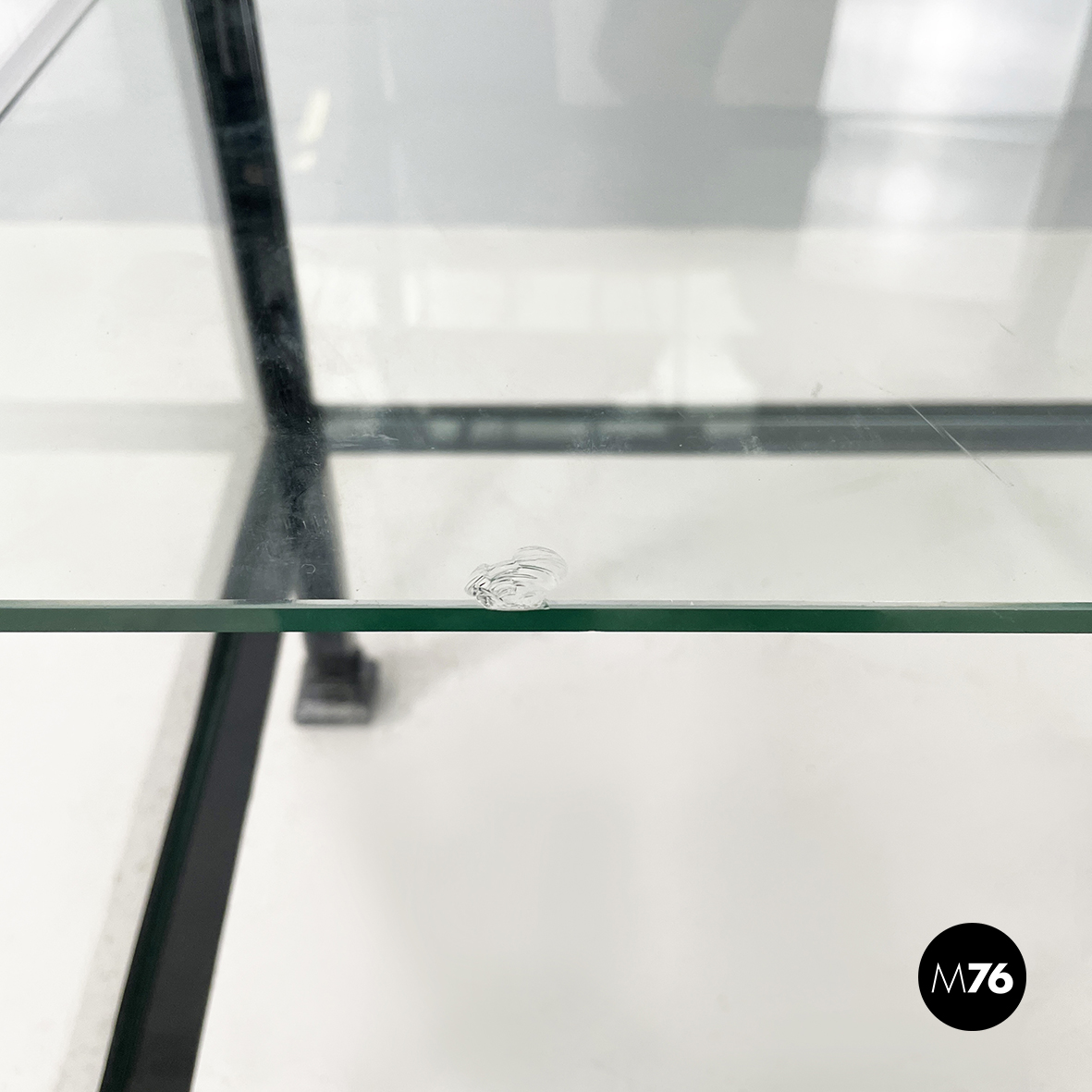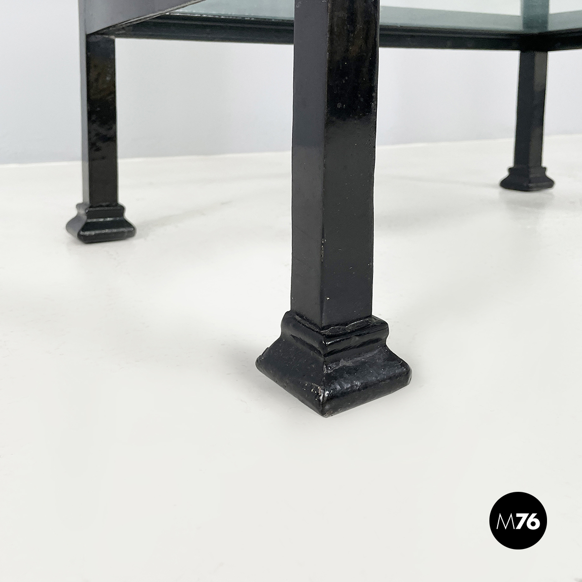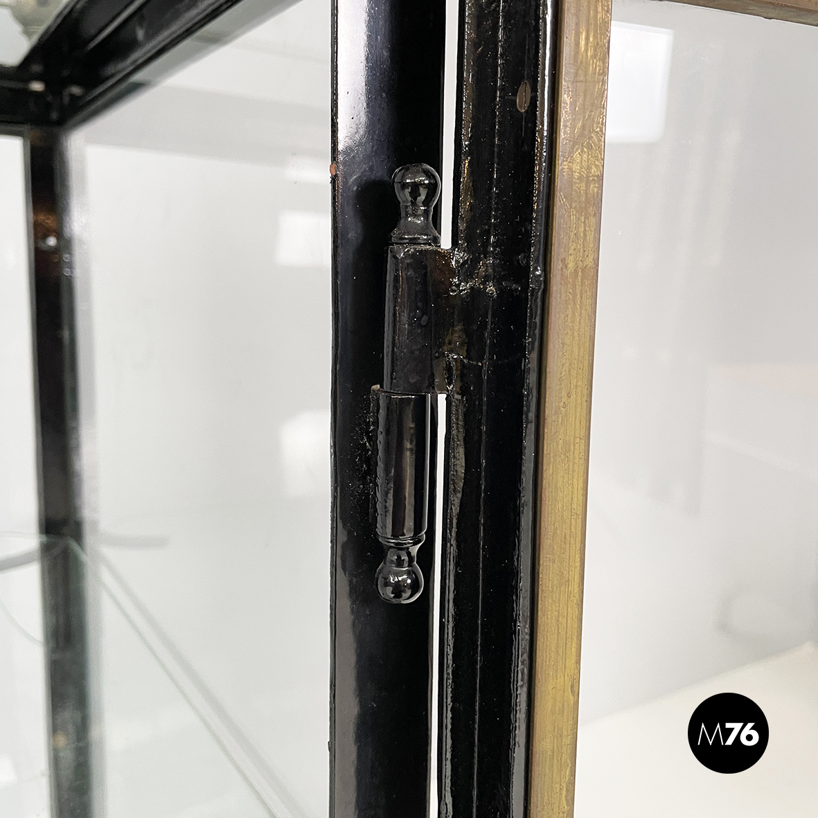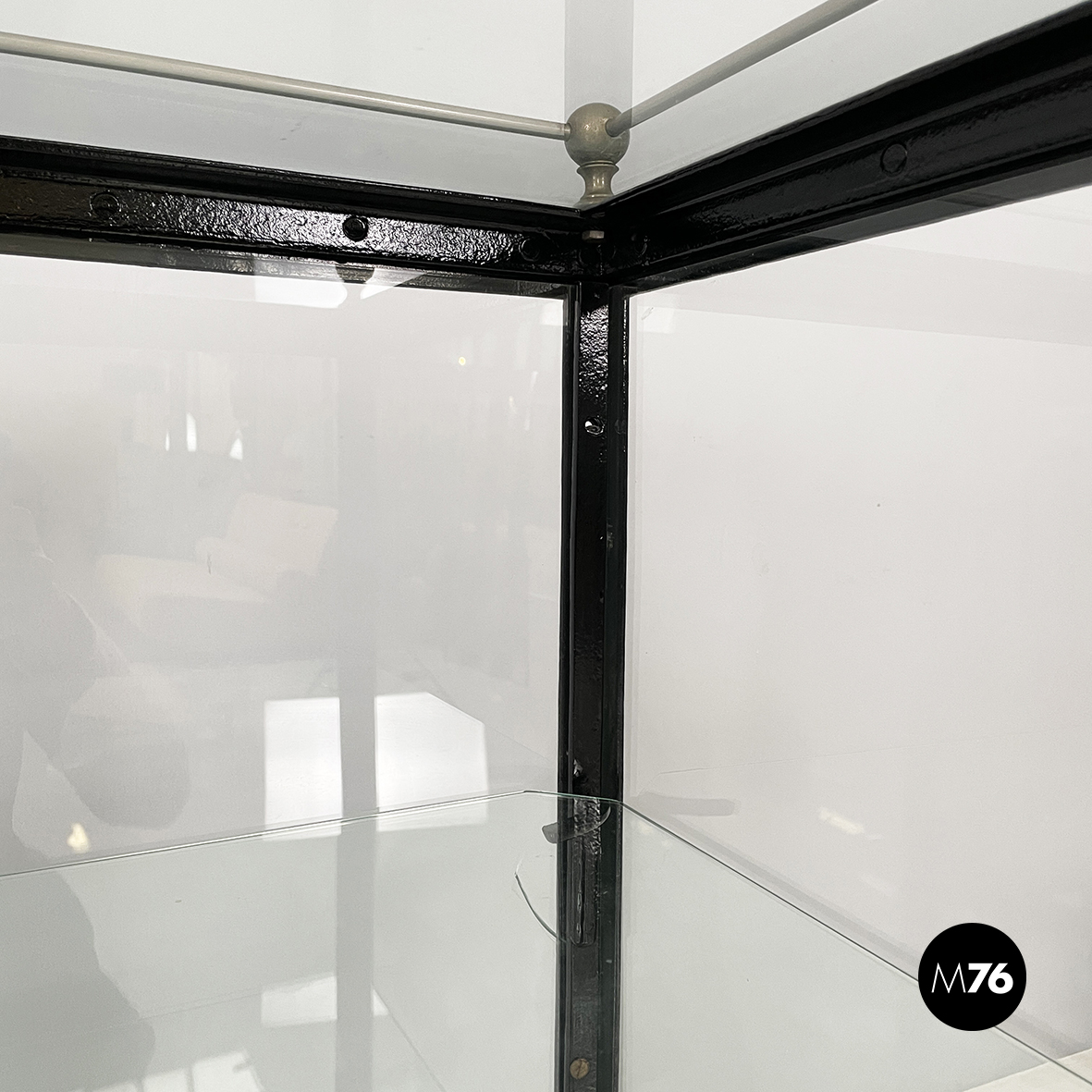 Vetrina espositiva a base rettangolare in metallo verniciato nero e vetro. Il telaio è in listelli di metallo verniciato nero mentre i vari lati sono in vetro trasparente. Ai quattro angoli della parte superiore sono posizionate quattro sfere decorative in metallo unite da un tondino di metallo. All’interno sono presenti due mensole in vetro spesso poggiate su piccole parti metalliche nere. Sul fronte dell’espositore è presente una serratura con relativa chiave. Zampe a sezione quadrata finemente lavorate in metallo verniciato nero. Utilizzabile anche come piccolo armadio o credenza.