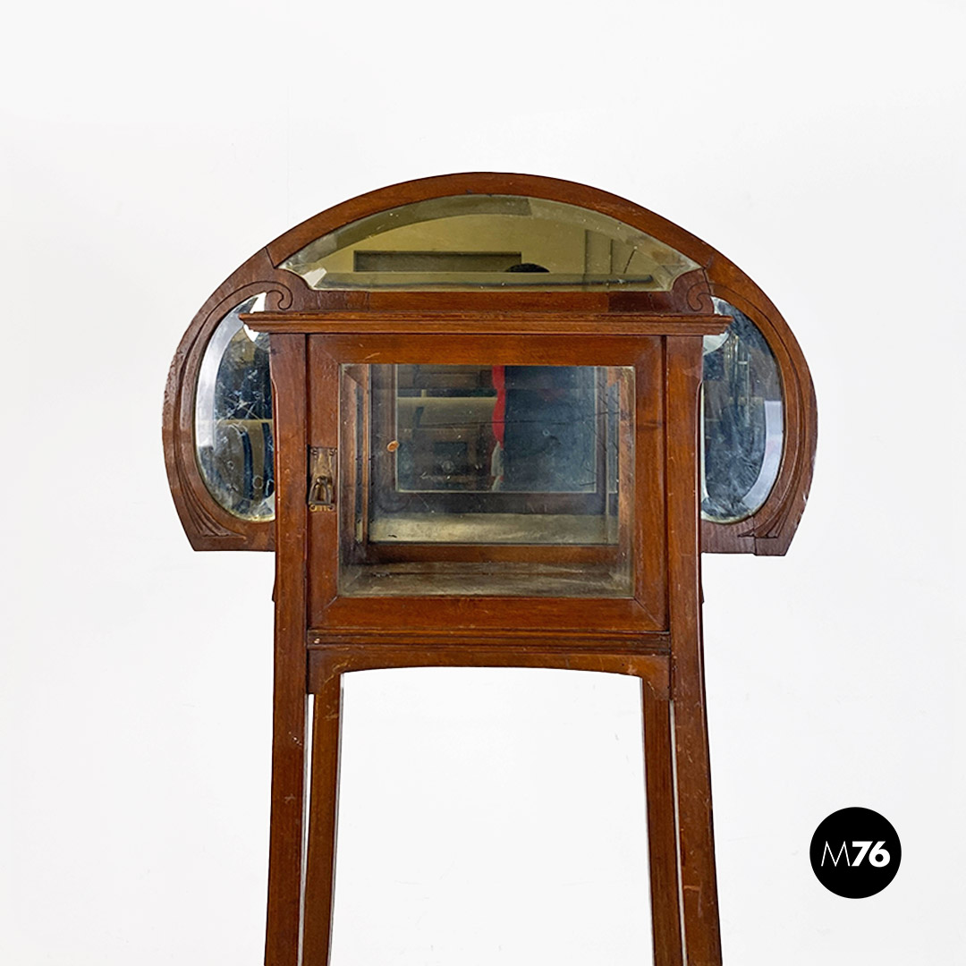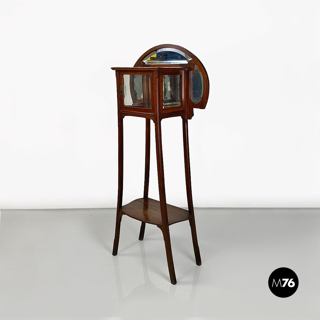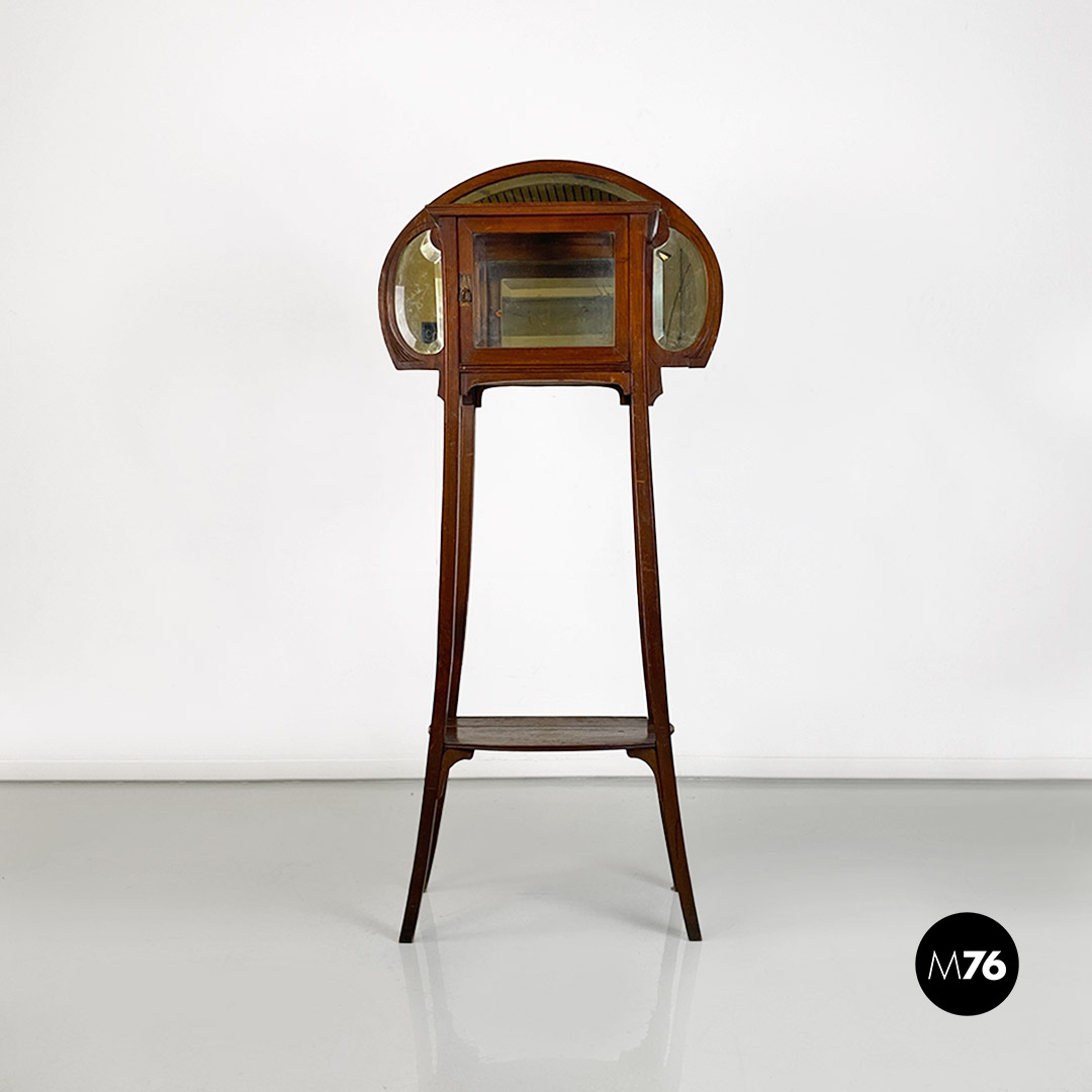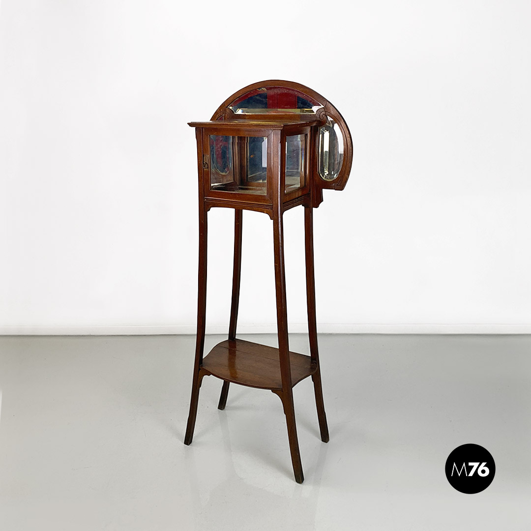 Vetrina o étagère con alzatina in stile Liberty in legno di noce con specchi molati piccolo modulo contenitore specchiato internamente e mensola nella parte bassa della struttura.