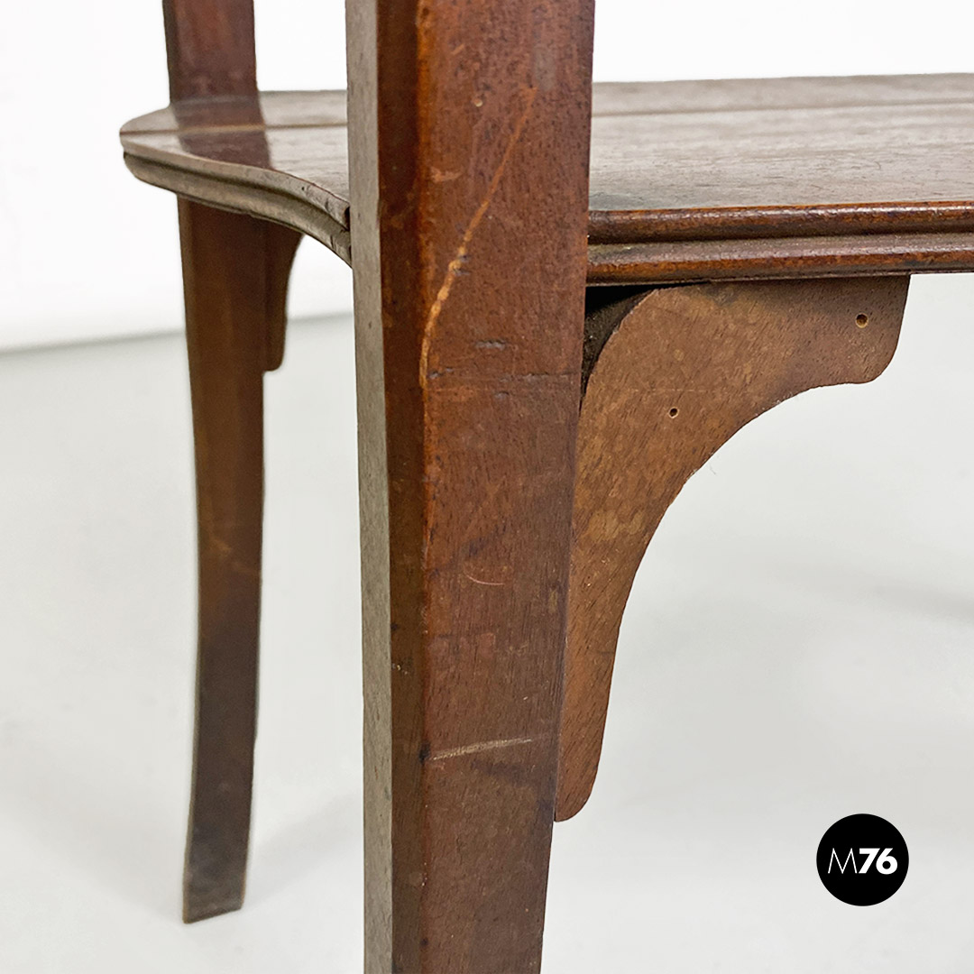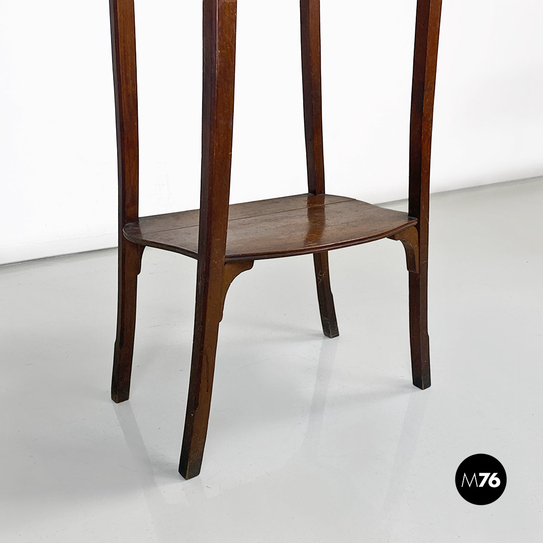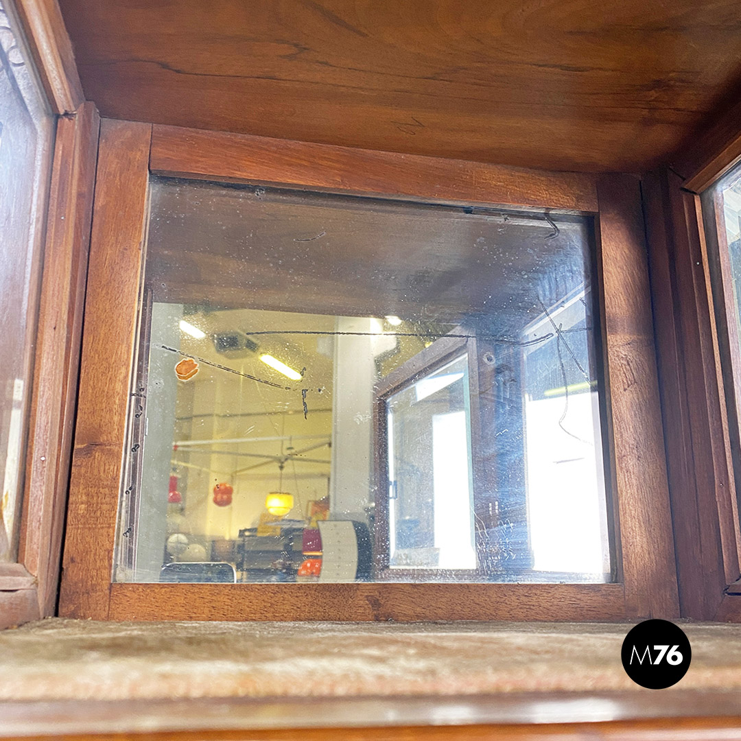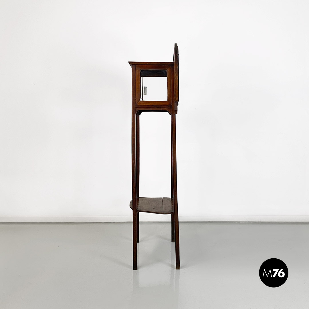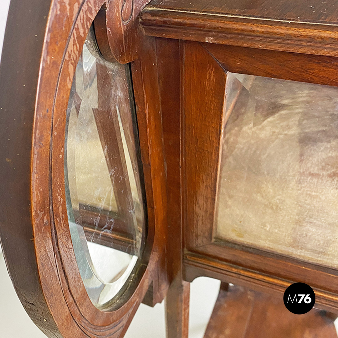 Vetrina o étagère con alzatina in stile Liberty in legno di noce con specchi molati piccolo modulo contenitore specchiato internamente e mensola nella parte bassa della struttura.