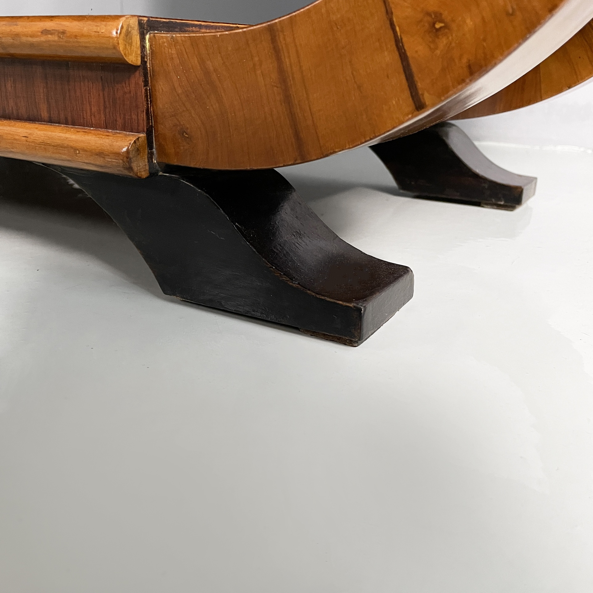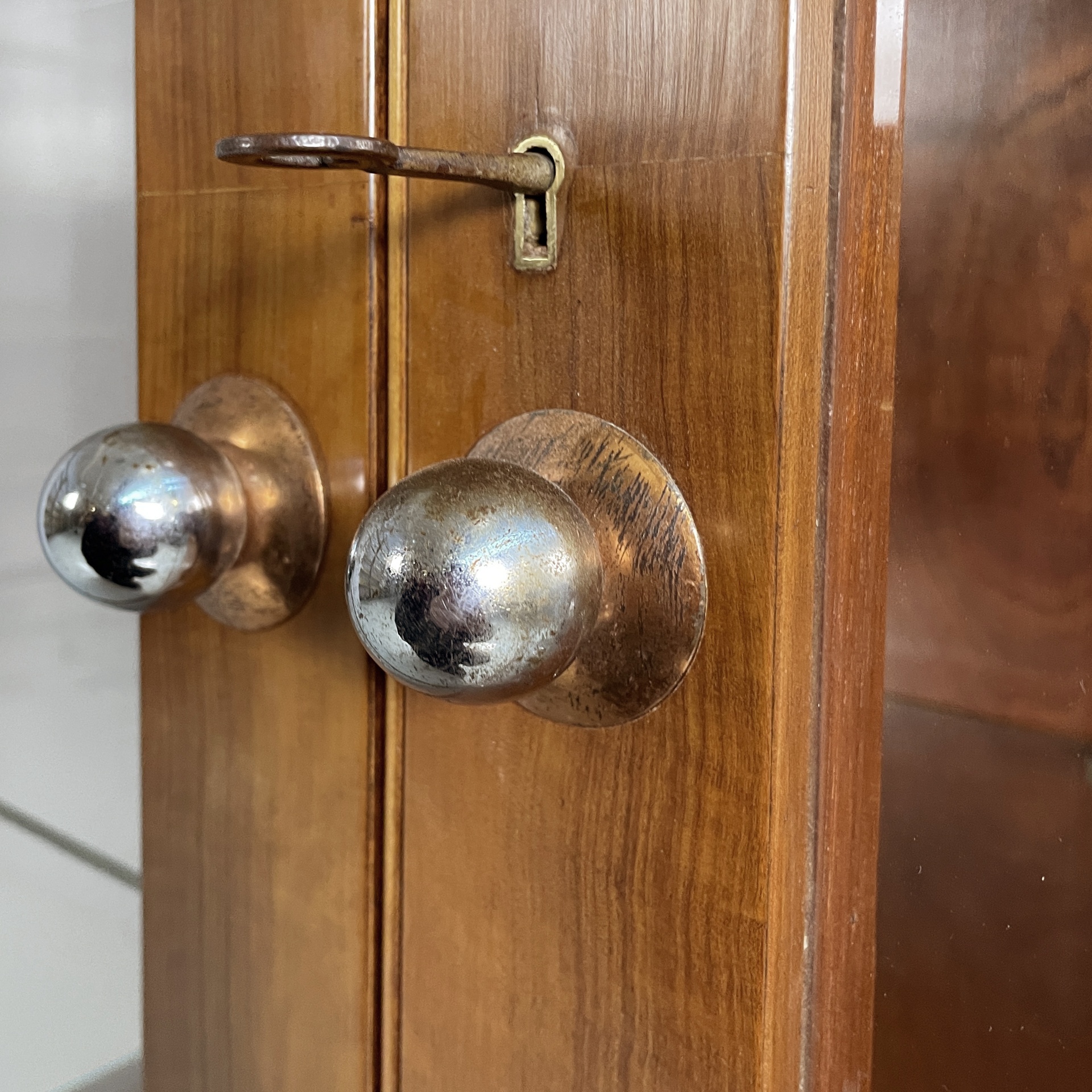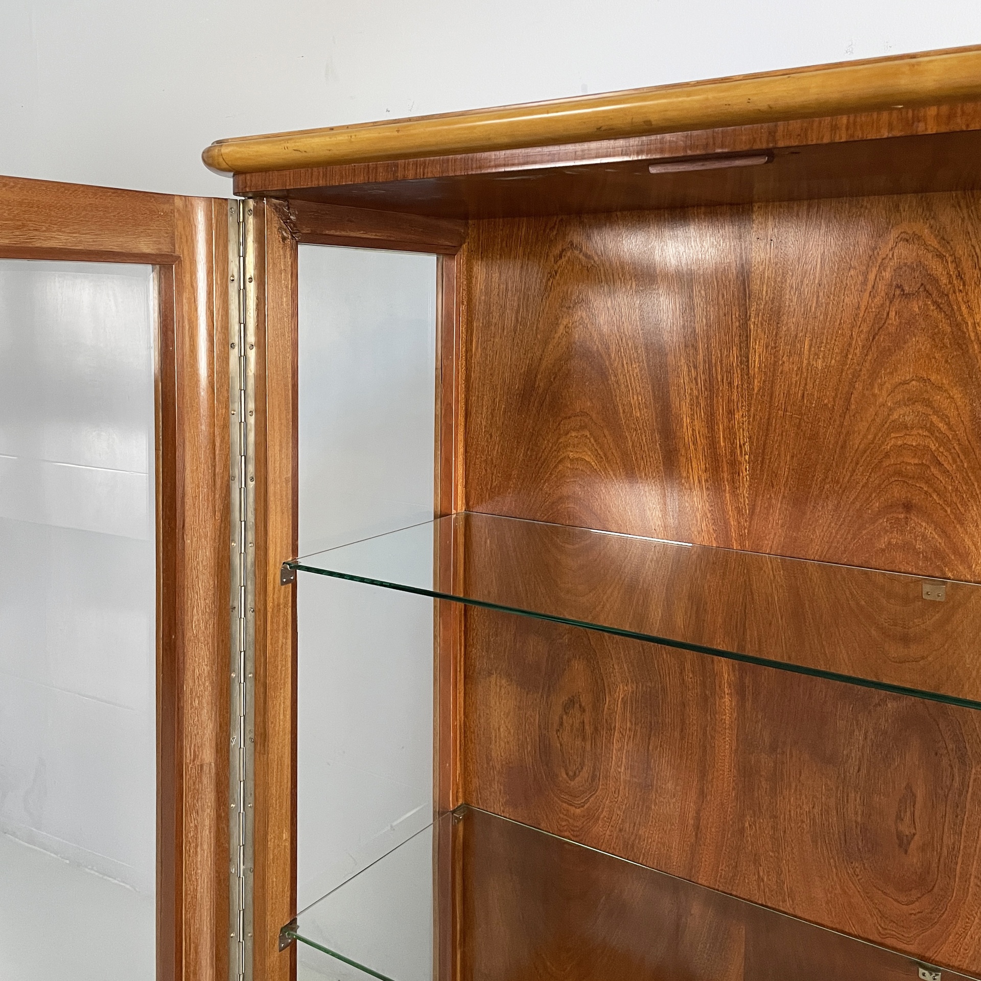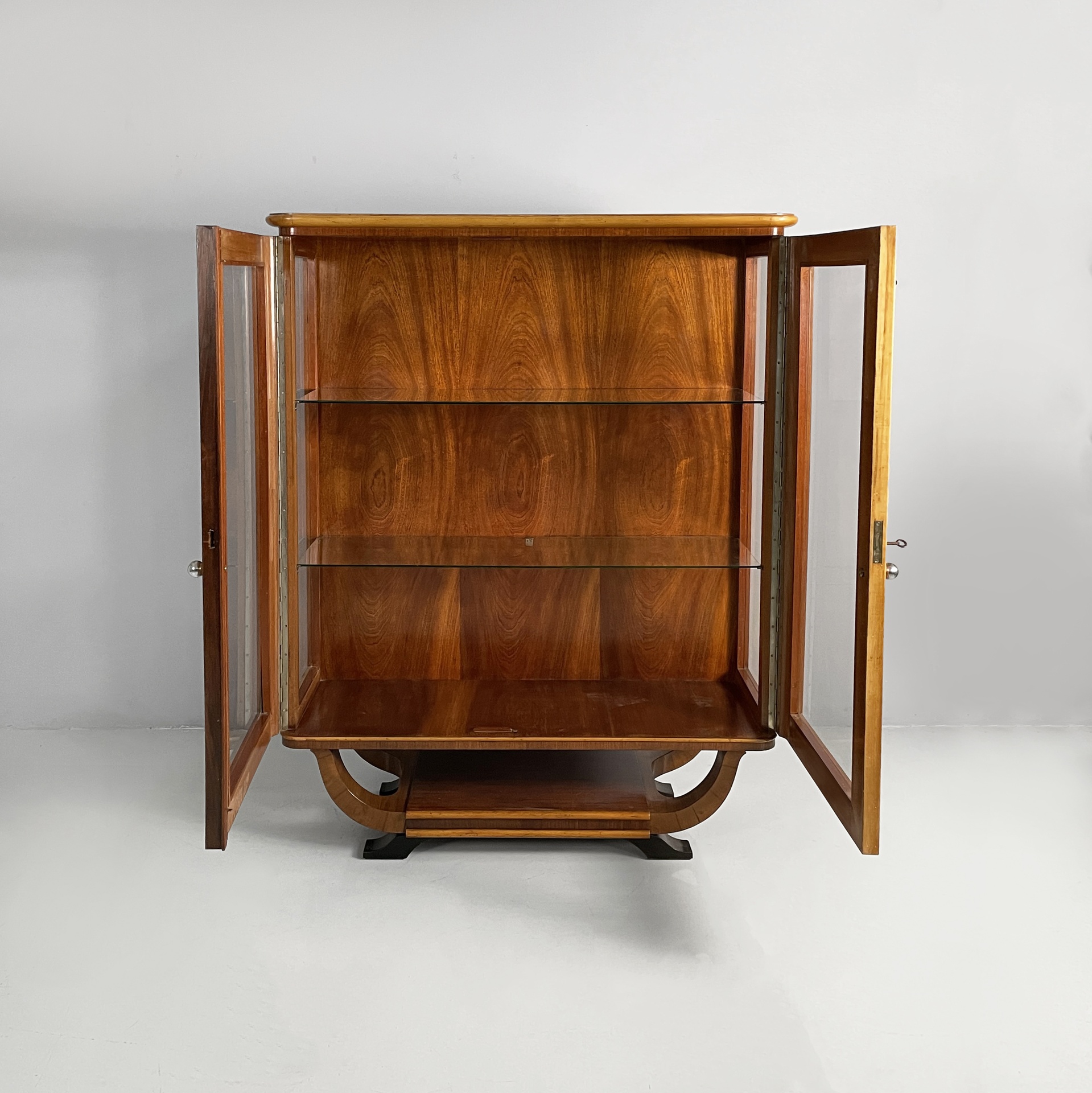 Vetrina con struttura in legno. Sul fronte è presente una doppia anta a battente, maniglie tonde in metallo e chiave. Il vano presenta tre lati in vetro con profili in legno e due mensole in vetro. Reggi mensola in metallo. Le zampe curvate in legno si uniscono alla base rettangolare in legno chiaro e scuro. Piedini in legno nero. Utilizzabile come credenza, sideboard o highboard. Art Deco.