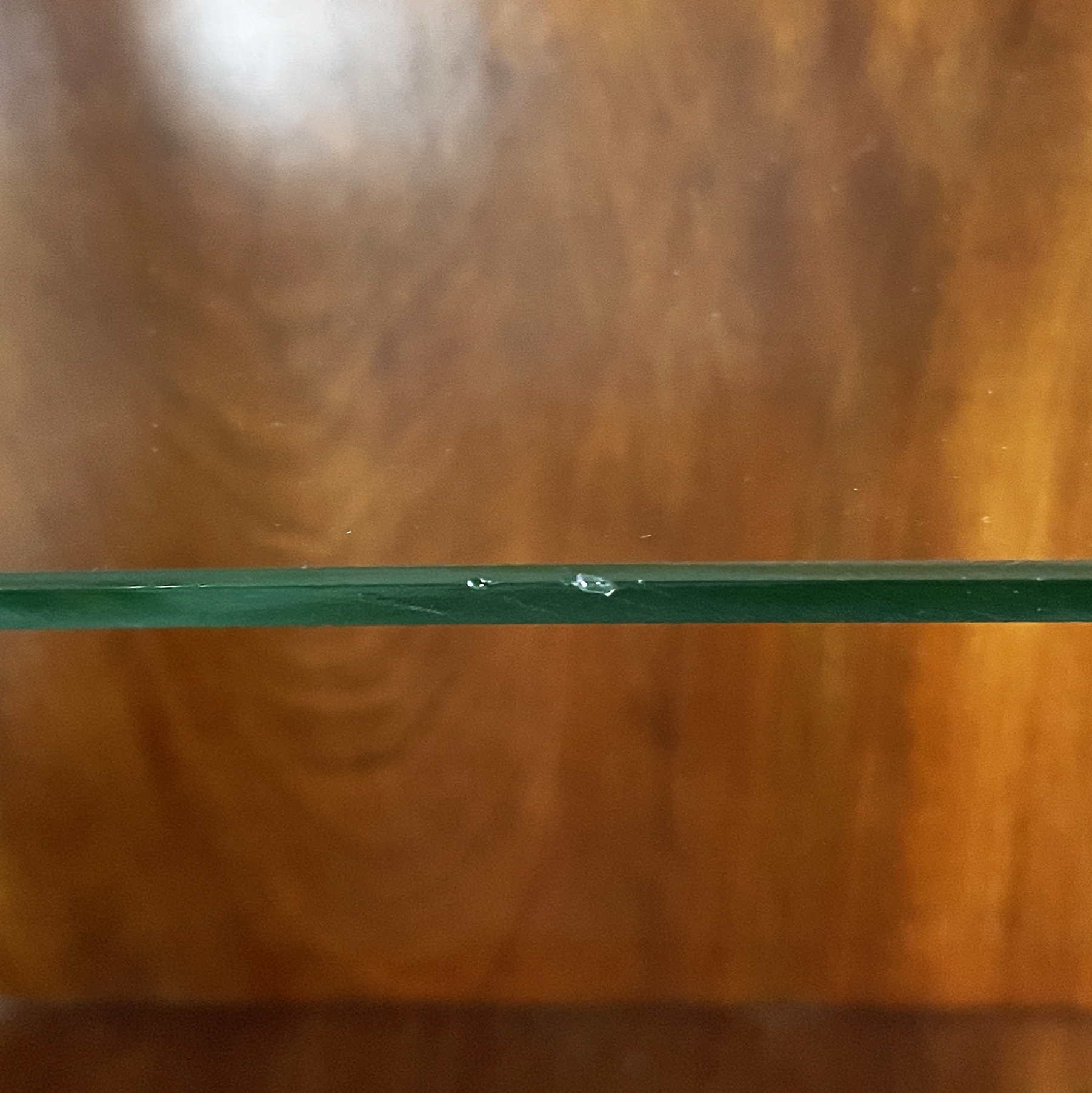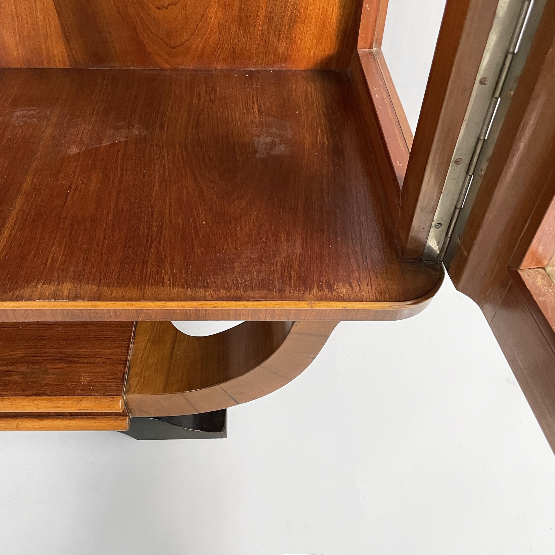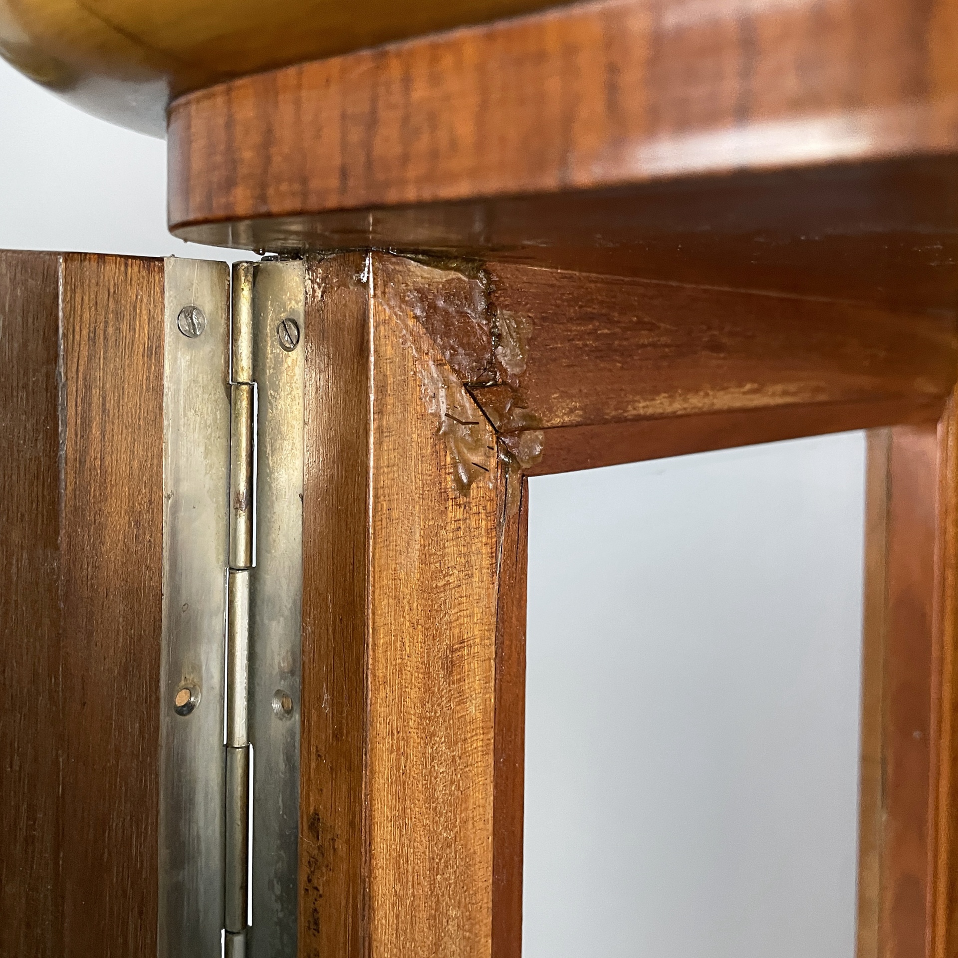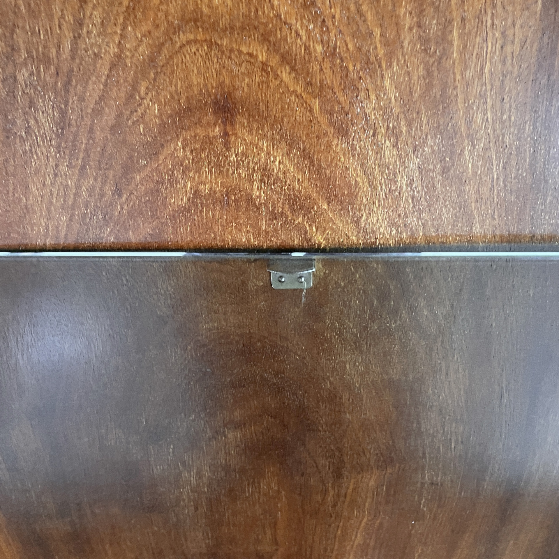 Buone condizioni. Le maniglie in metallo presentano segni dati dal tempo. Una mensola in vetro presenta un piccolo difetto. Legno restaurato